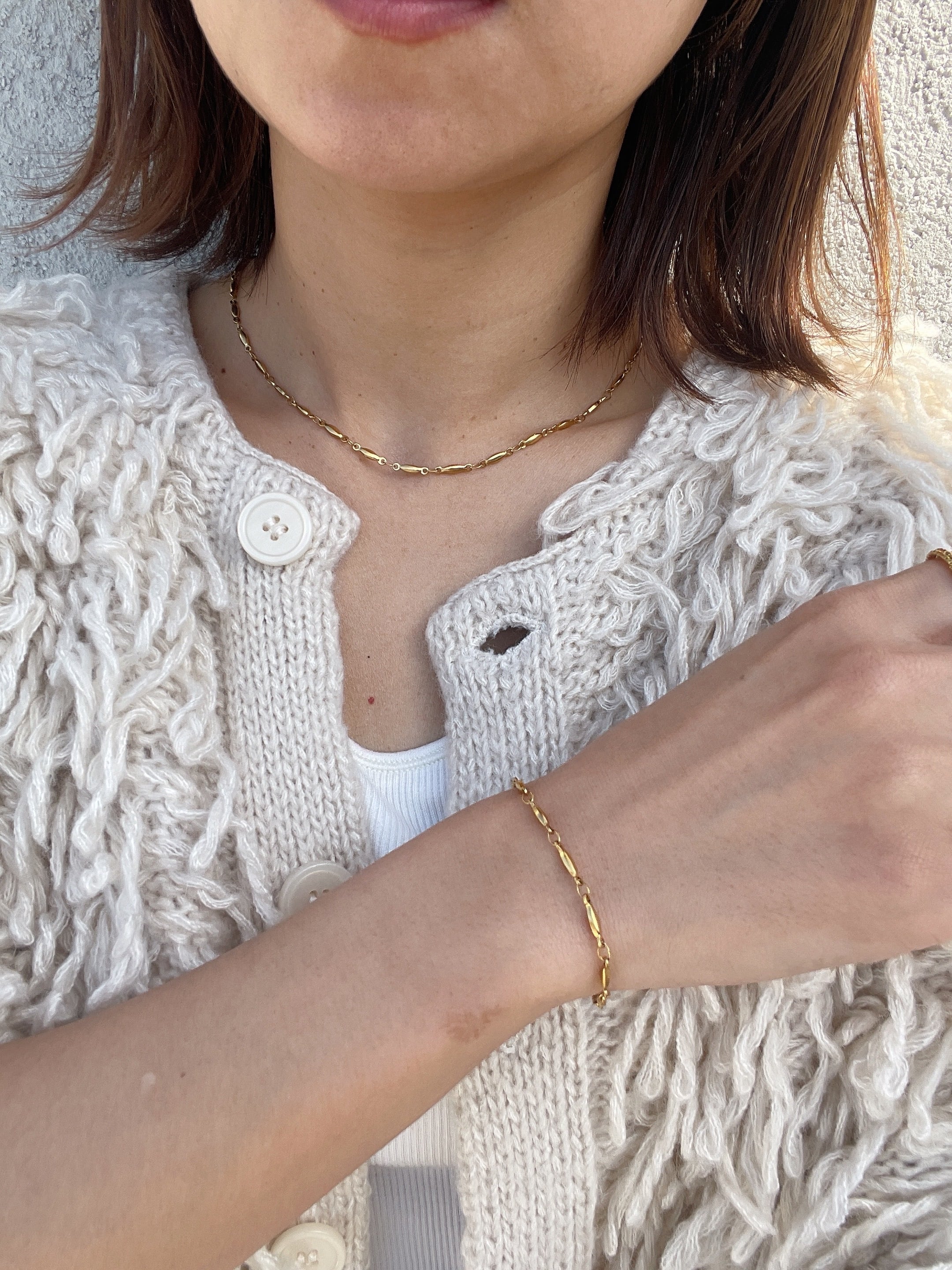 軽やかなリズムを刻むようなデザインのブレスレット。小ぶりなチェーンが手元を上品に演出し、さりげないアクセントに。