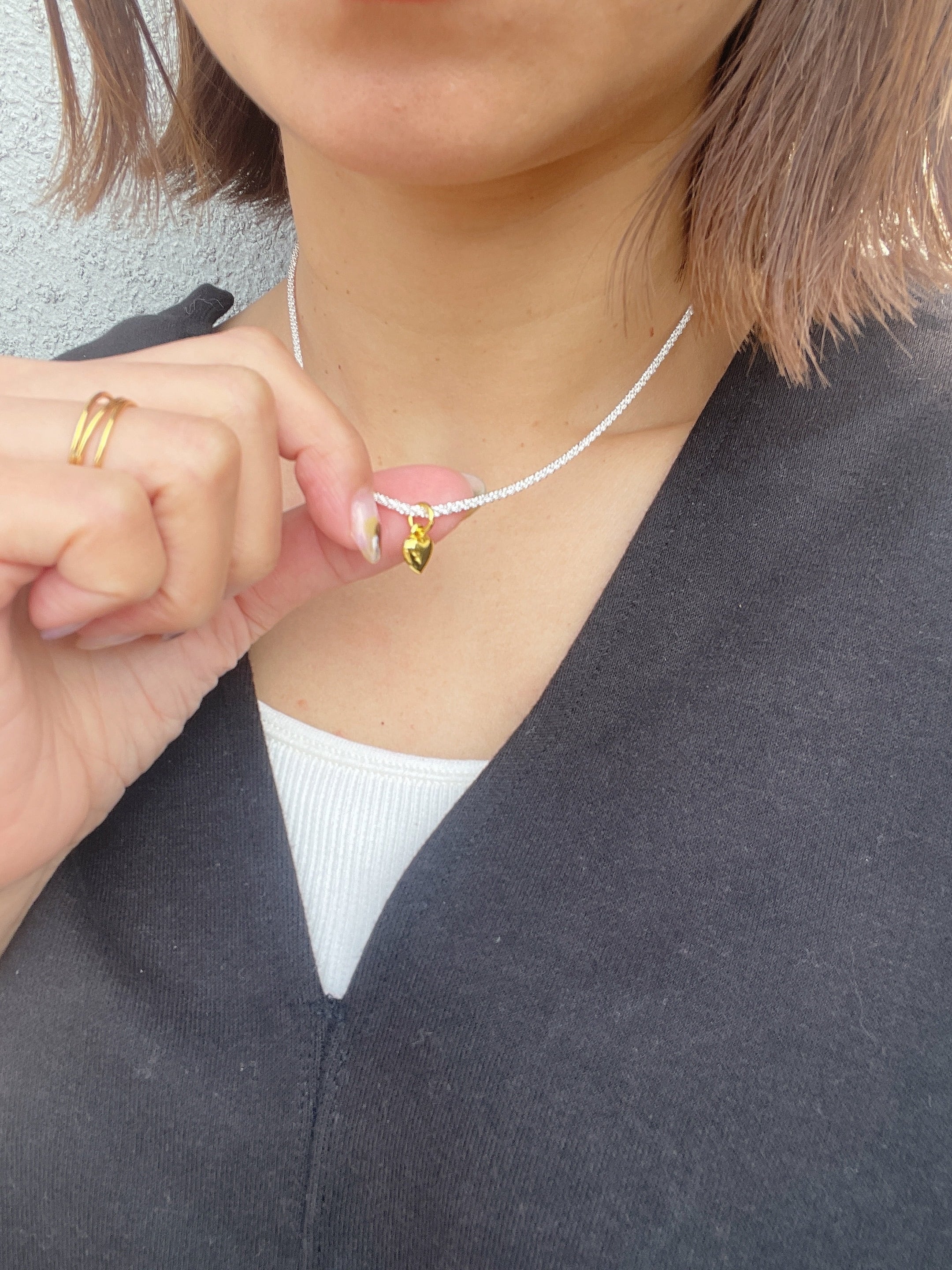 小ぶりながらも立体的なハートチャームがさりげない存在感を放ち、首元にエレガントな輝きをプラスします。