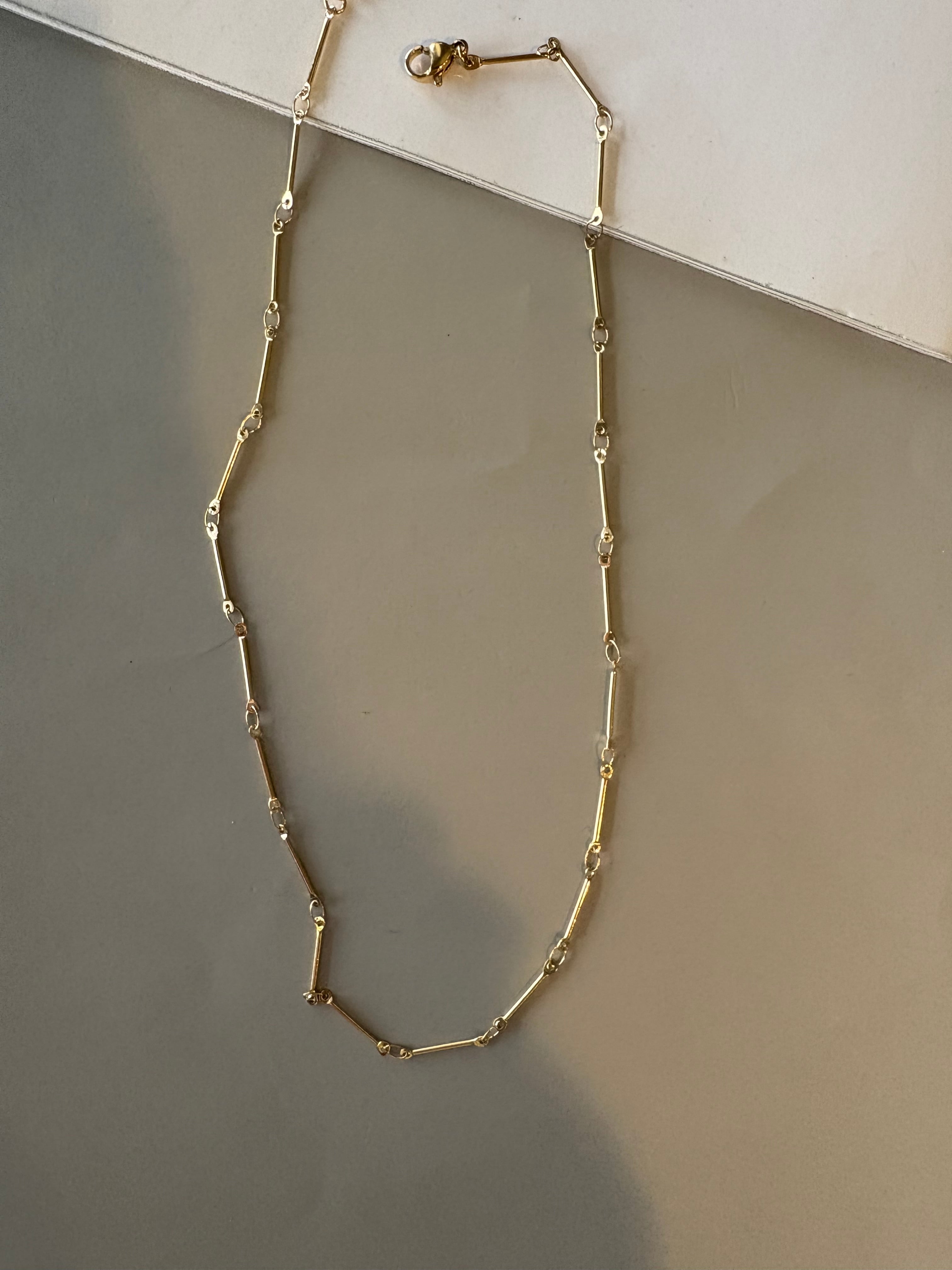 洗練されたシルエットが特徴のボーンチェーンネックレス。シンプルながらも存在感のあるデザインで、どんなスタイルにも合わせやすいアイテムです。細やかなチェーンのリンクが首元に上品な輝きを与え、デイリーから特別なシーンまで幅広く活躍します。