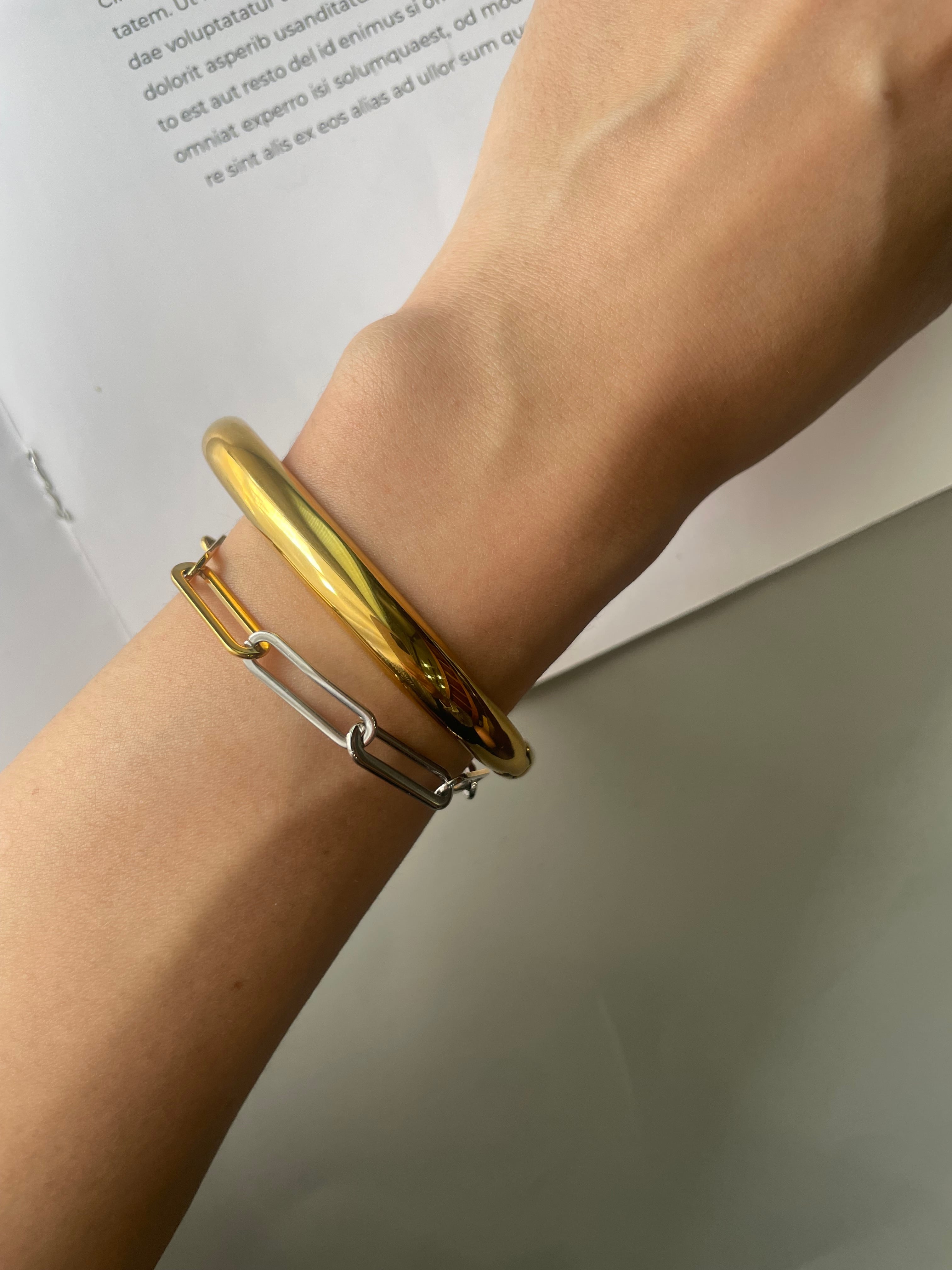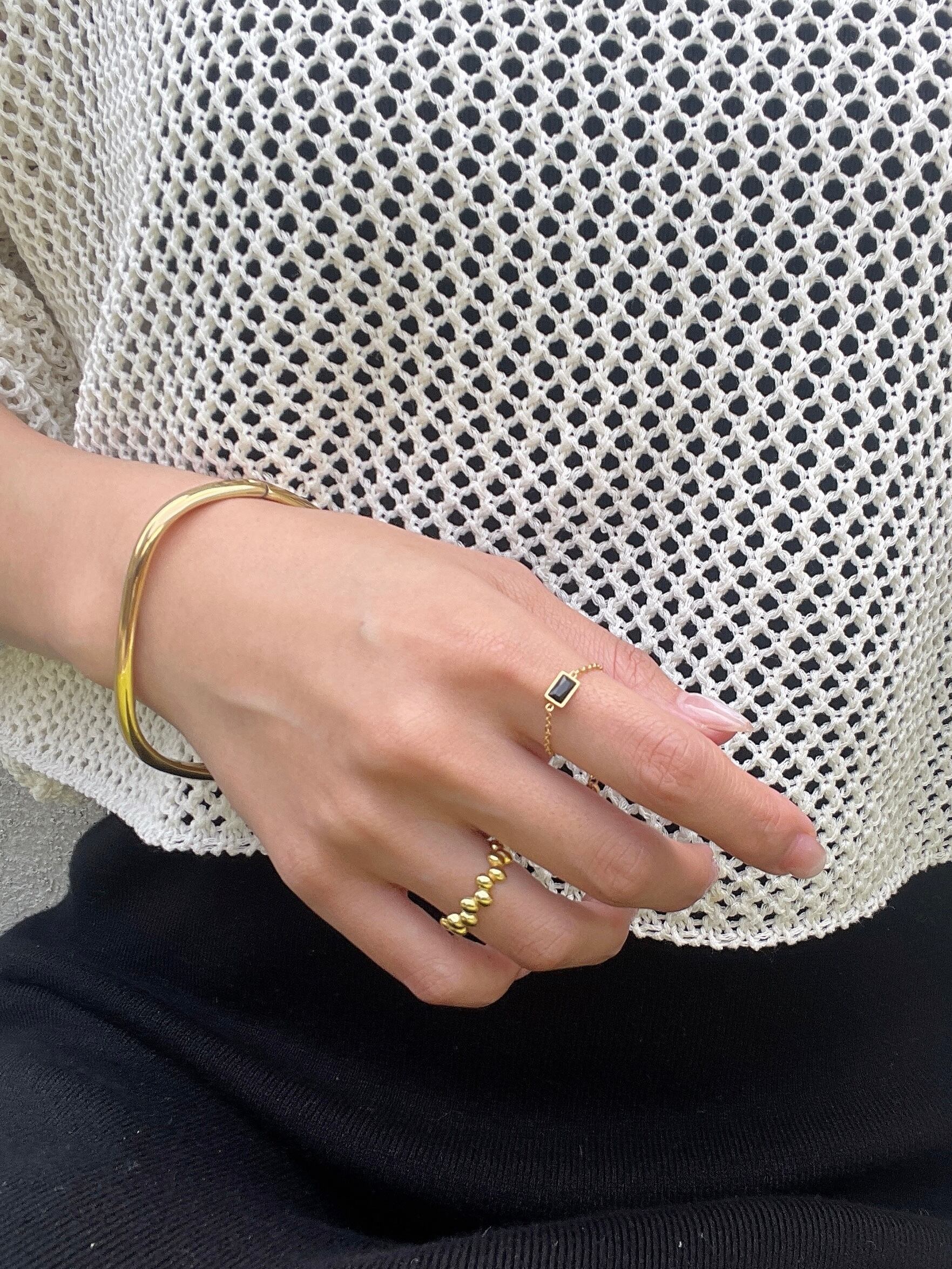 一つで存在感を放ちつつ、他のブレスレットとの重ね付けも楽しめる万能デザインです。