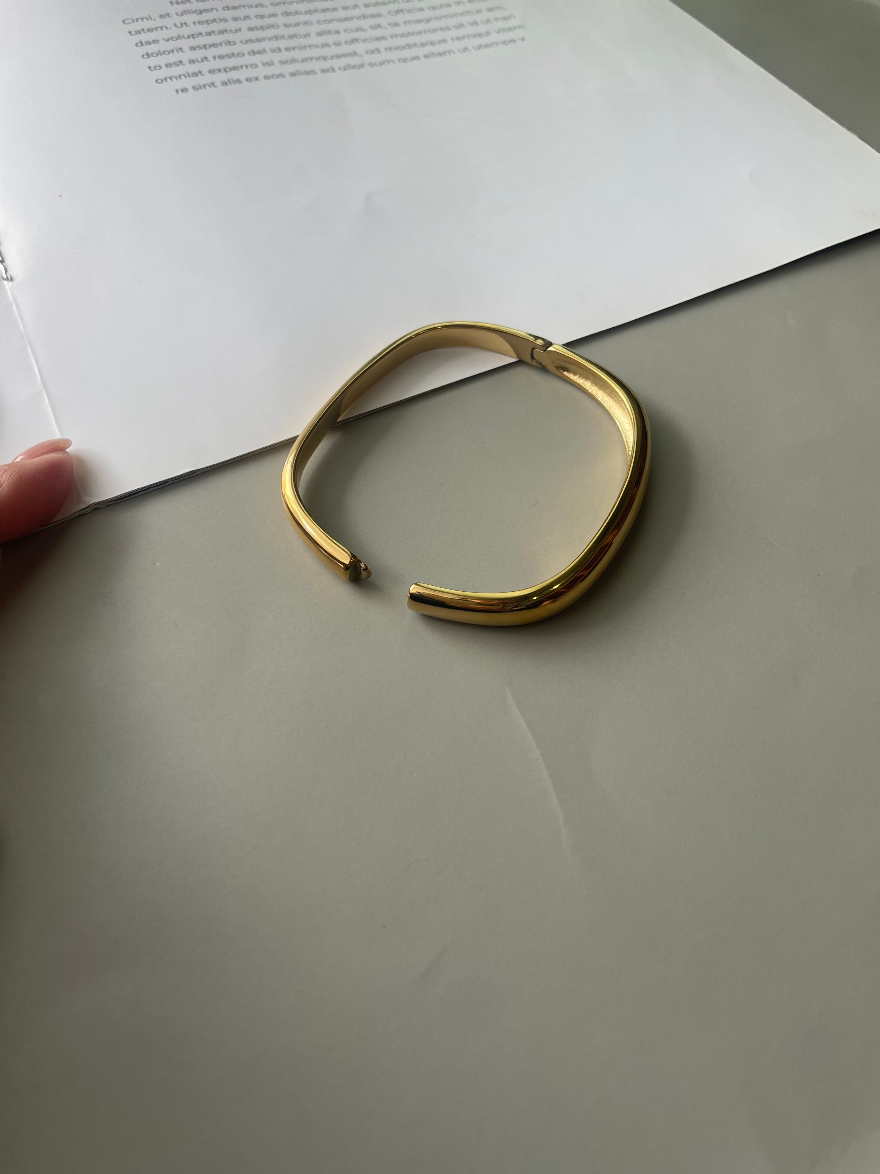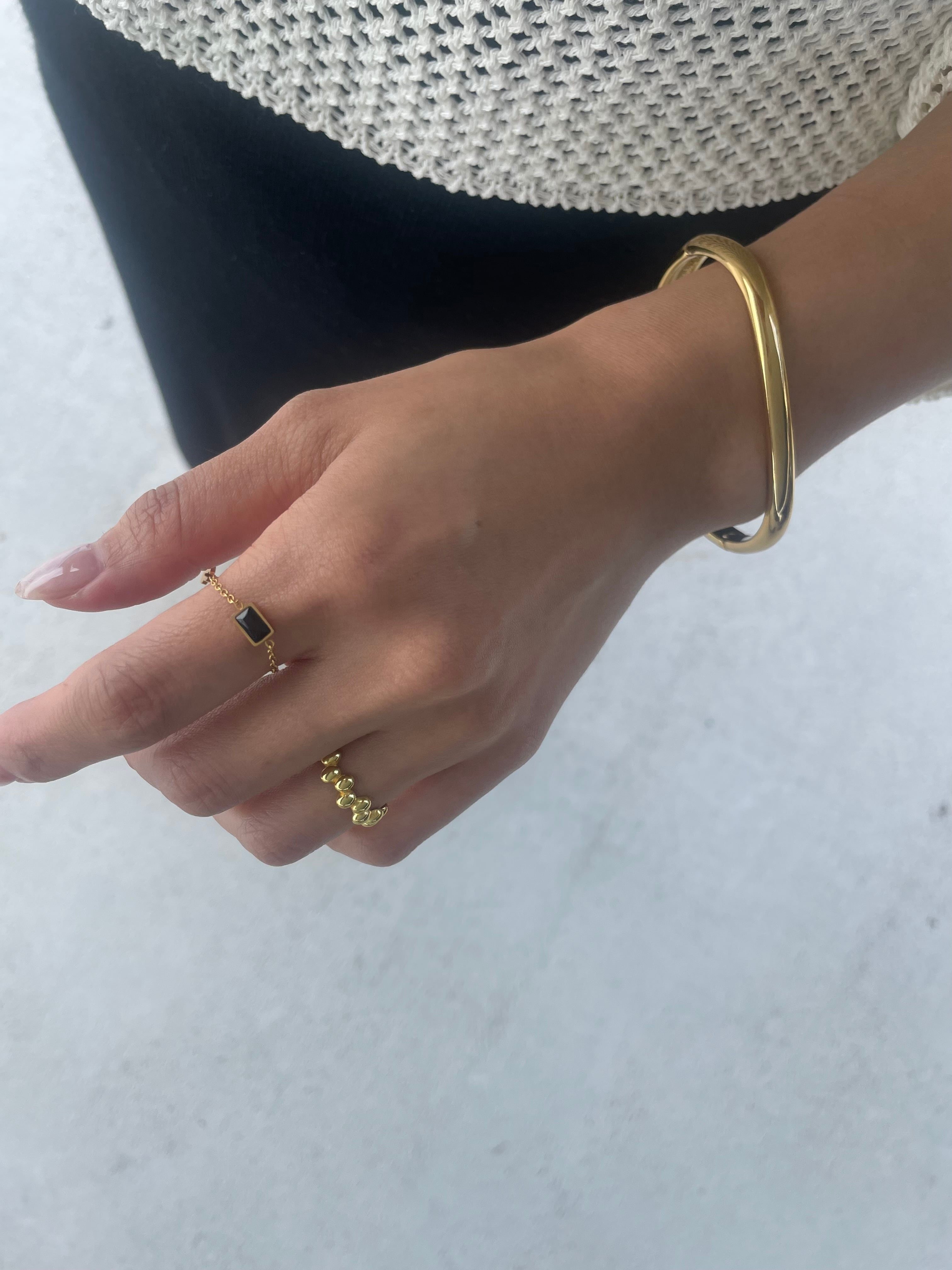 滑らかなカーブラインが手元を美しく引き立てる、シンプルながらも洗練されたバングル。