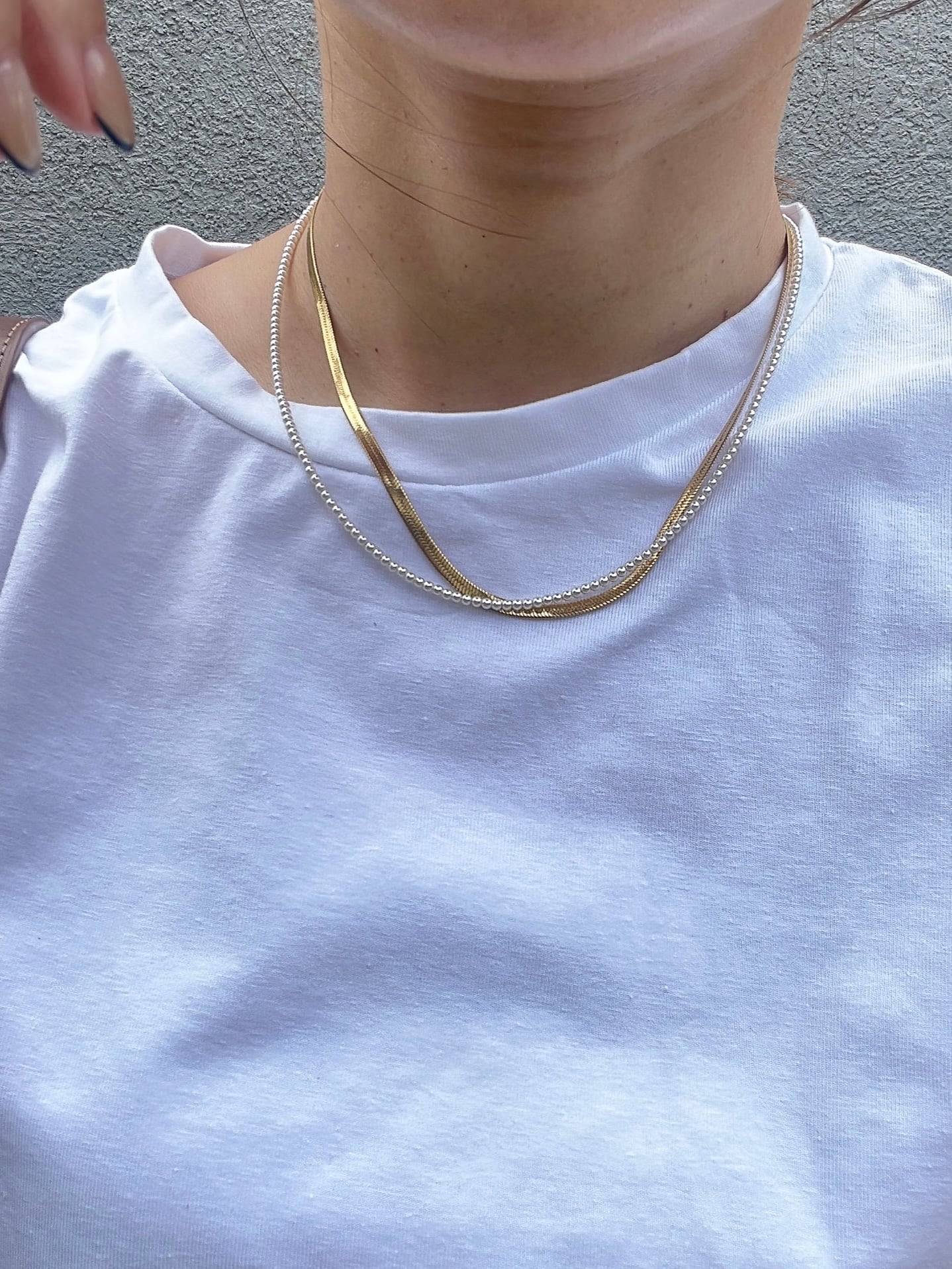 カジュアルなTシャツにも、きれいめなトップスにも相性◎