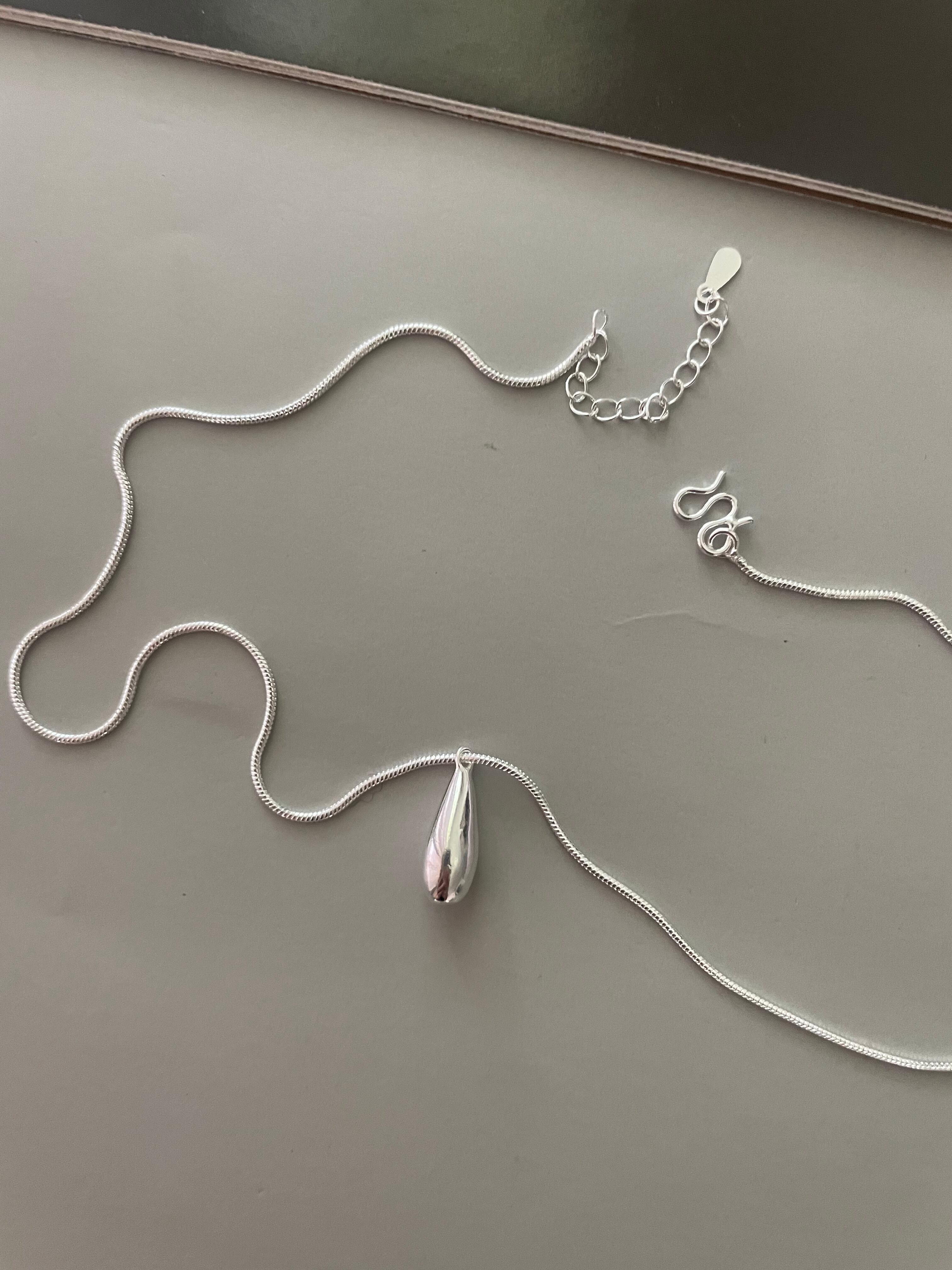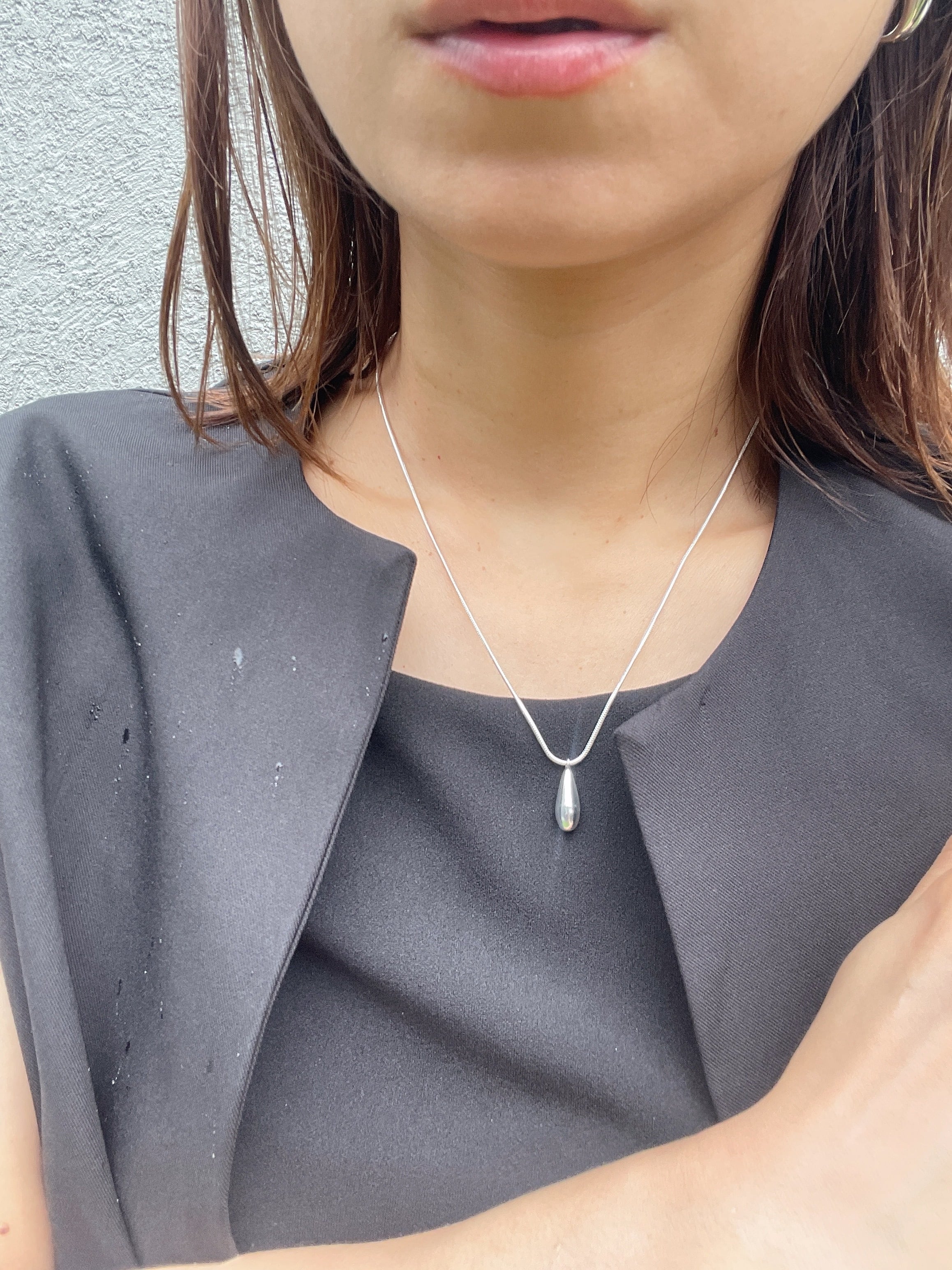なめらかに磨かれたしずく型トップが、動くたびにさりげない光を放ち、首元に上品なアクセントを添えてくれます。