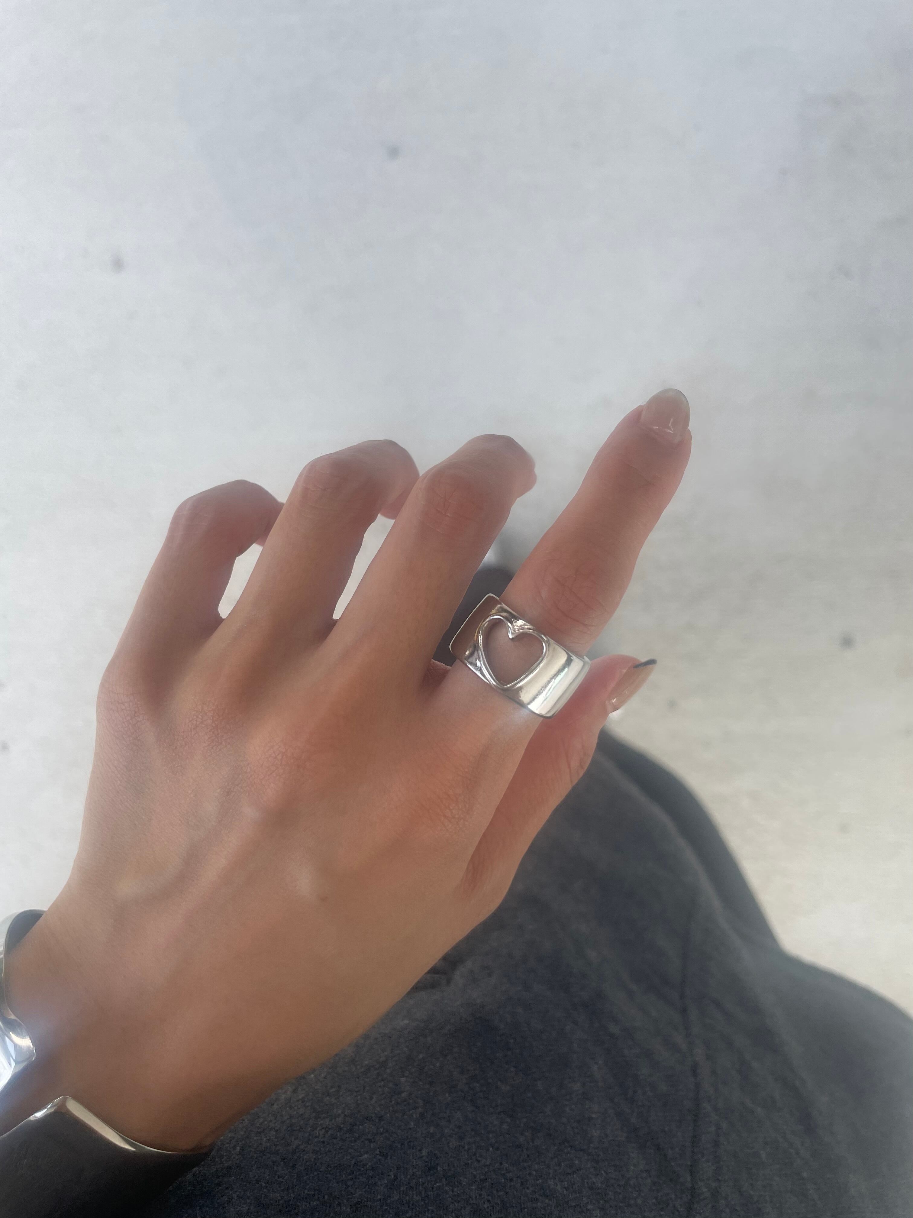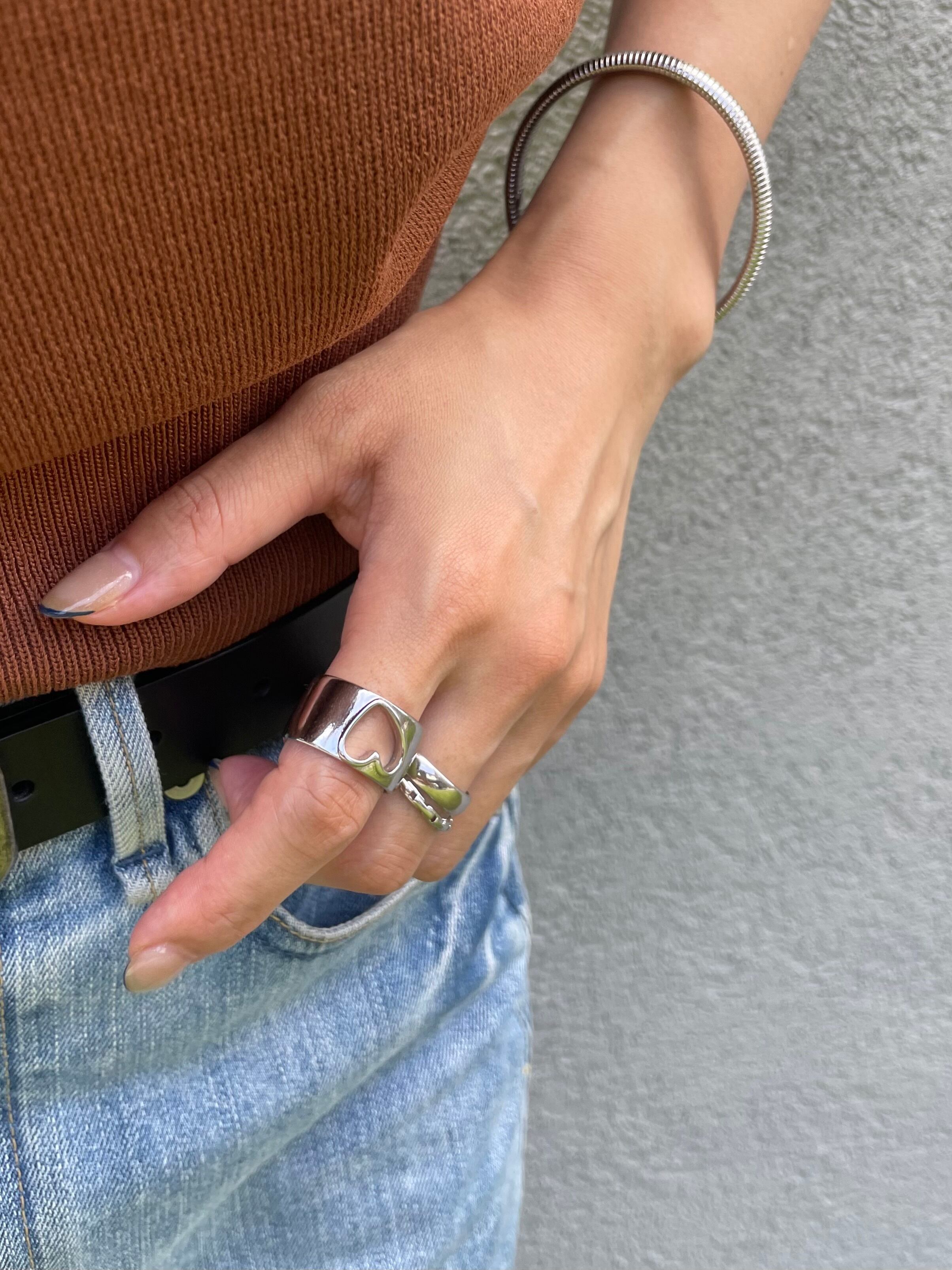 指先に抜け感とエッジを添える、オープンハートデザインのシルバーリング。