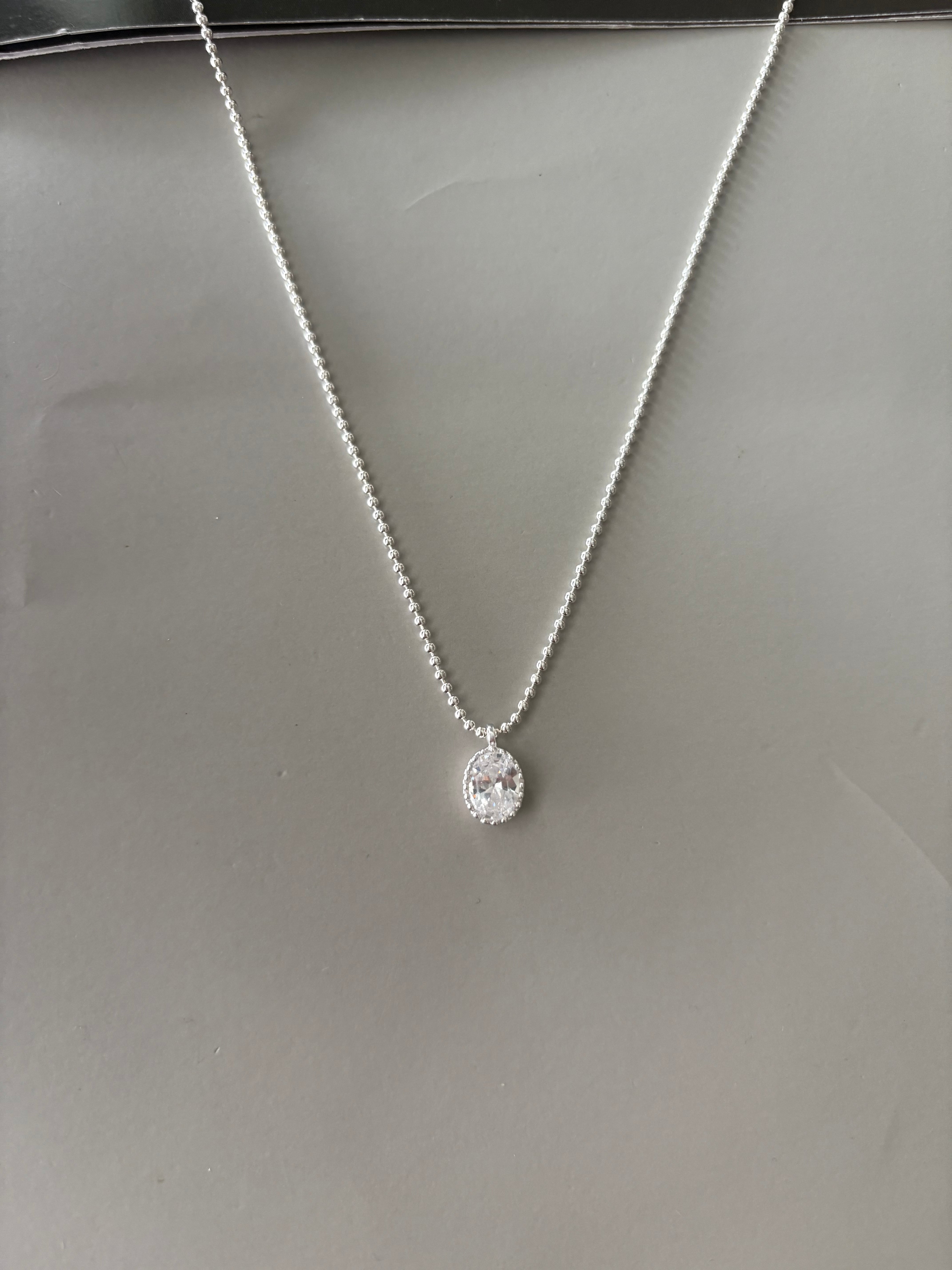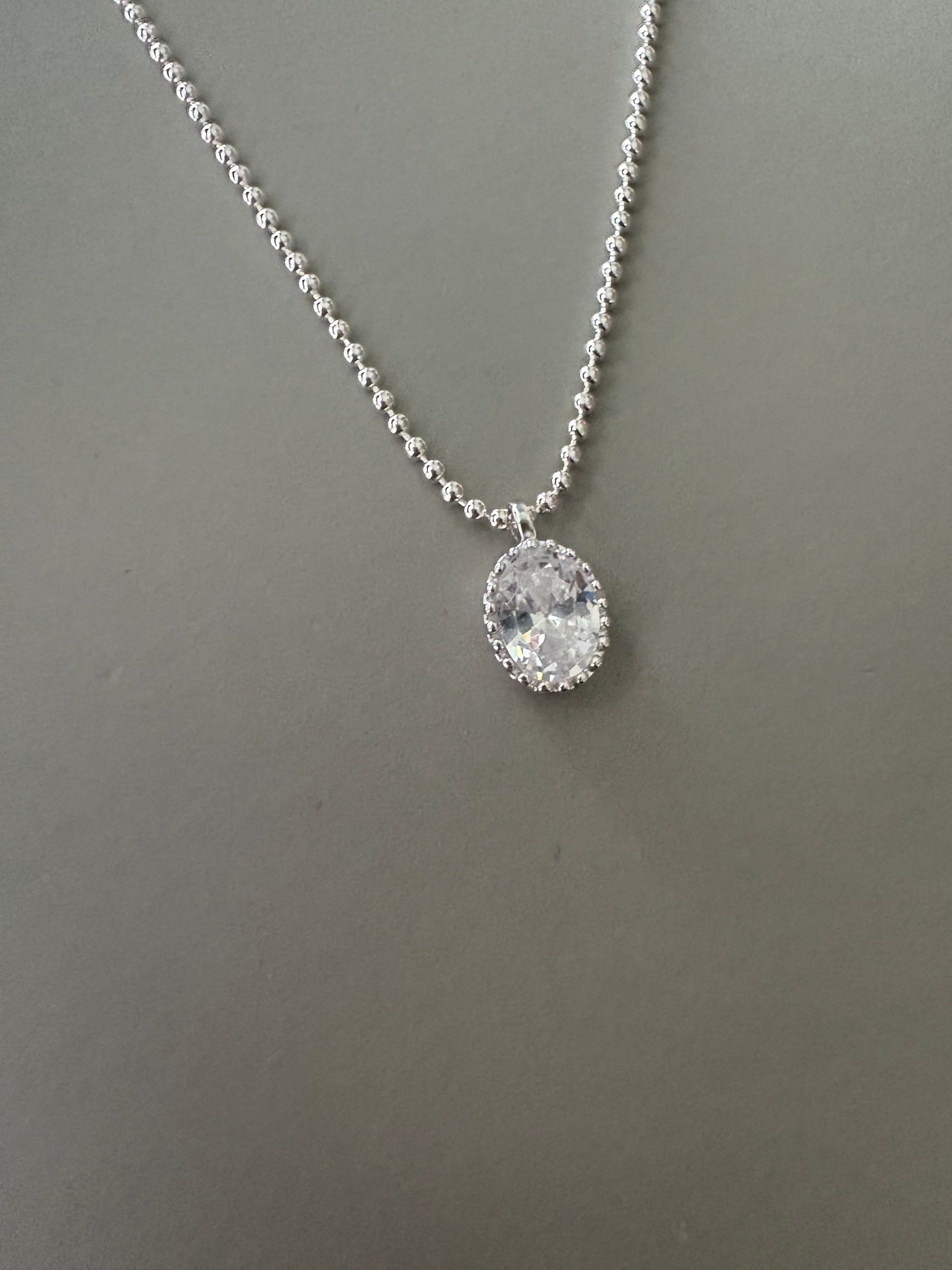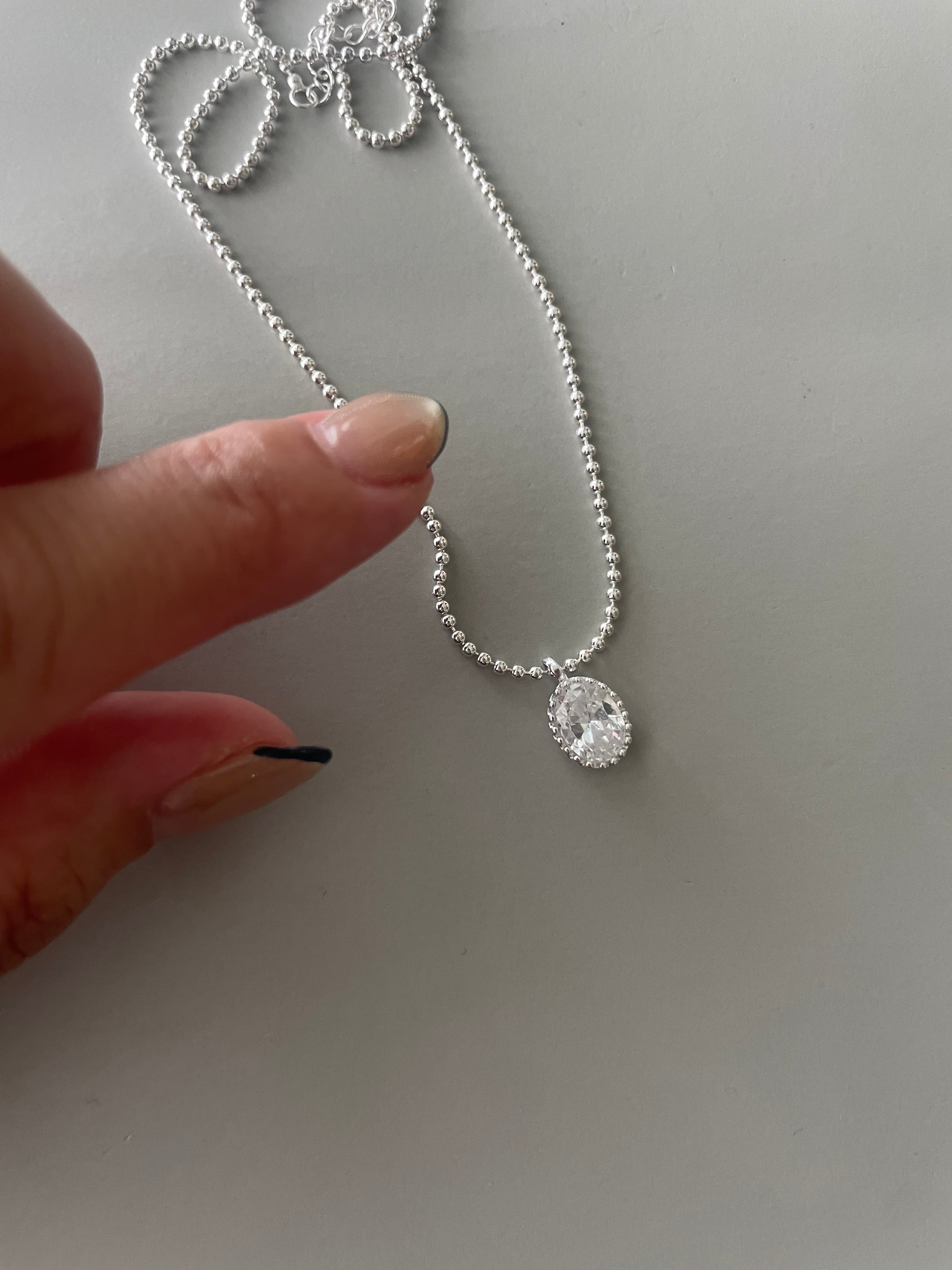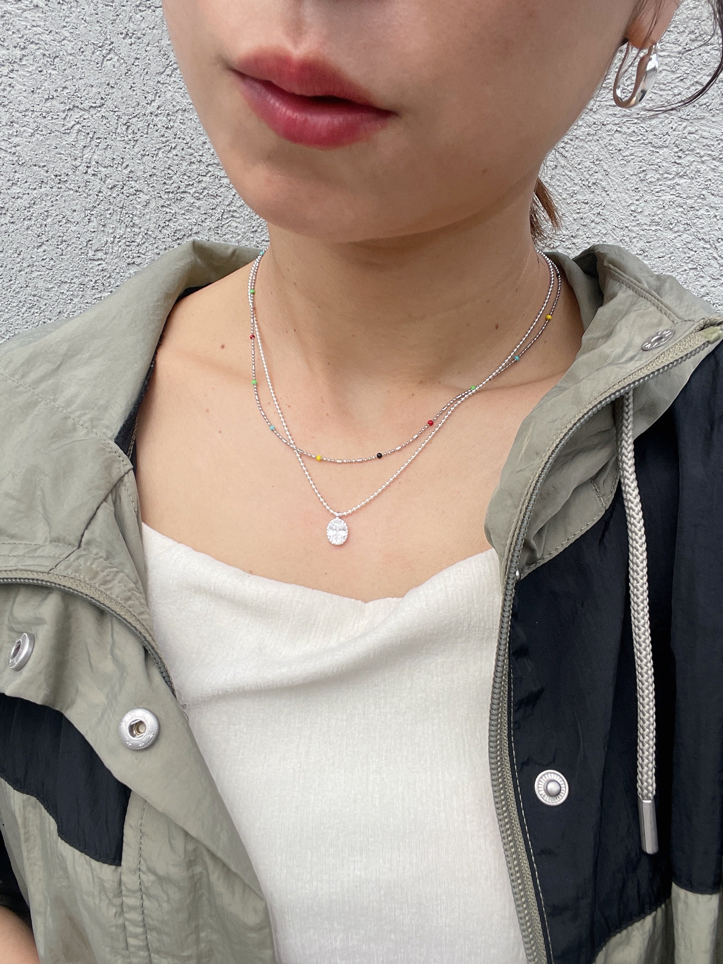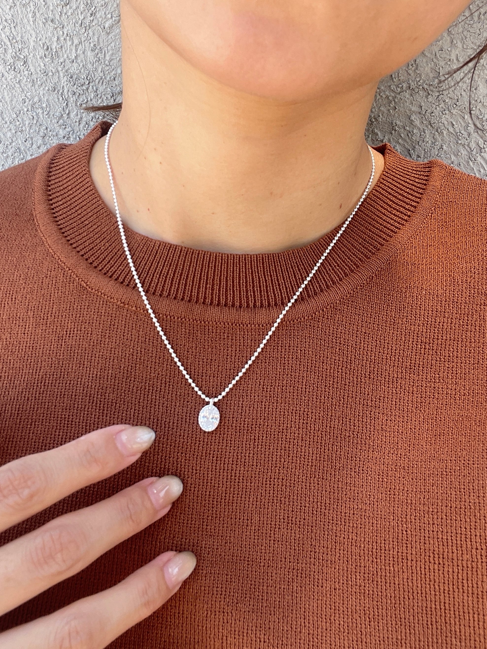 小粒のボールチェーンに、透明感のあるオーバルストーンが揺れる「シルバーグロウネックレス」。