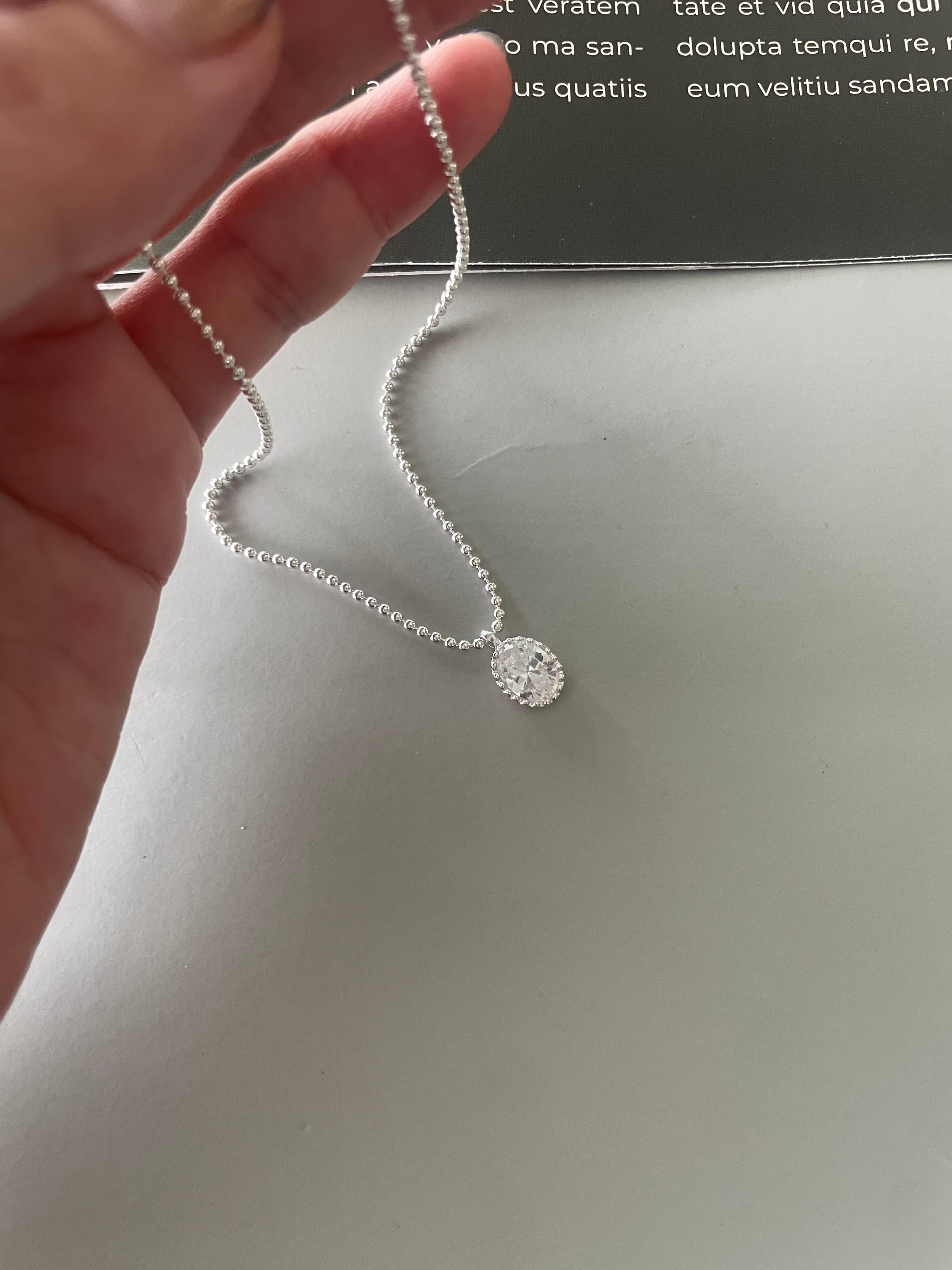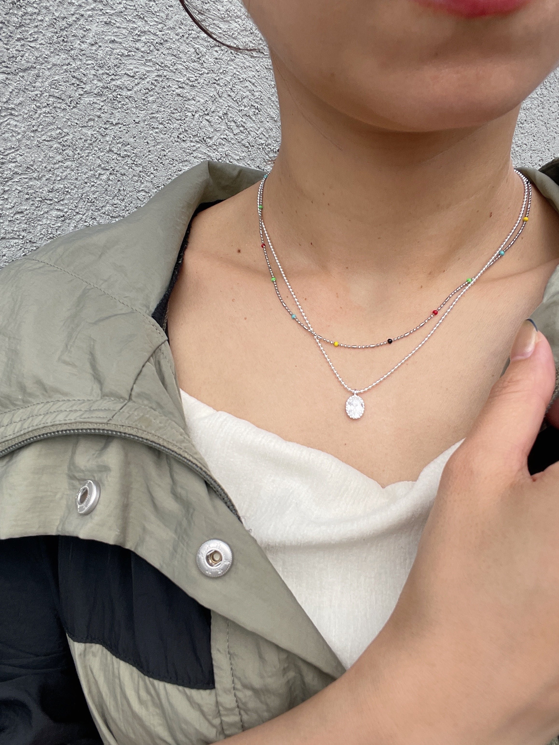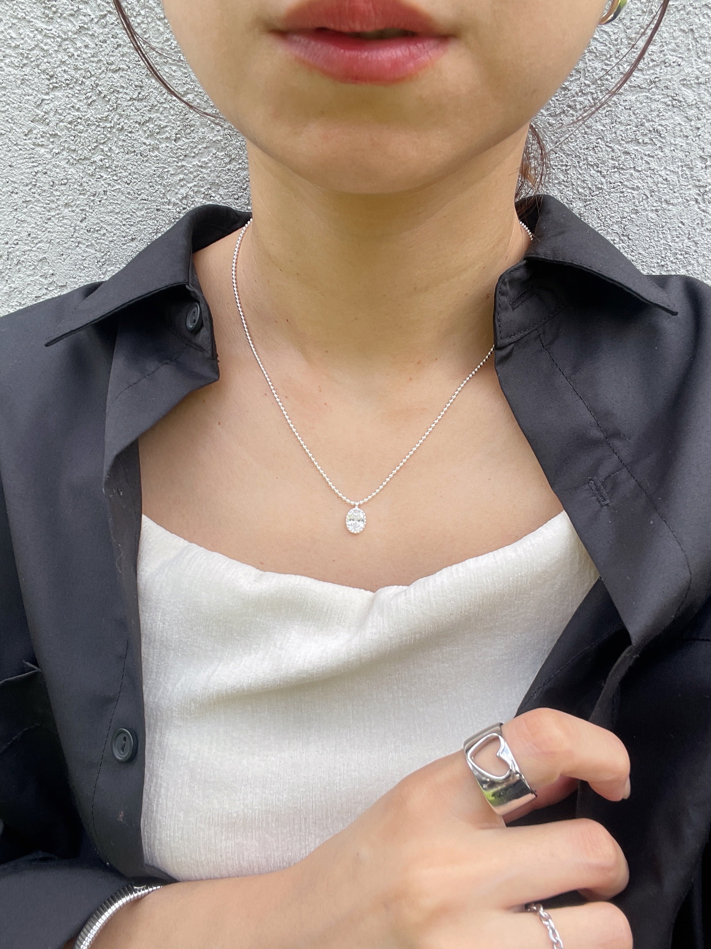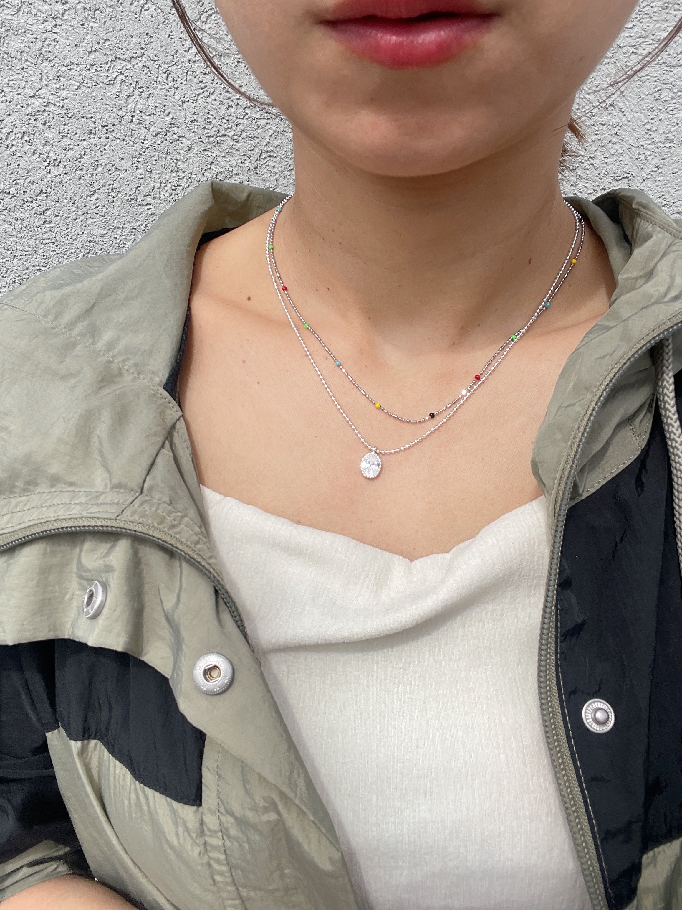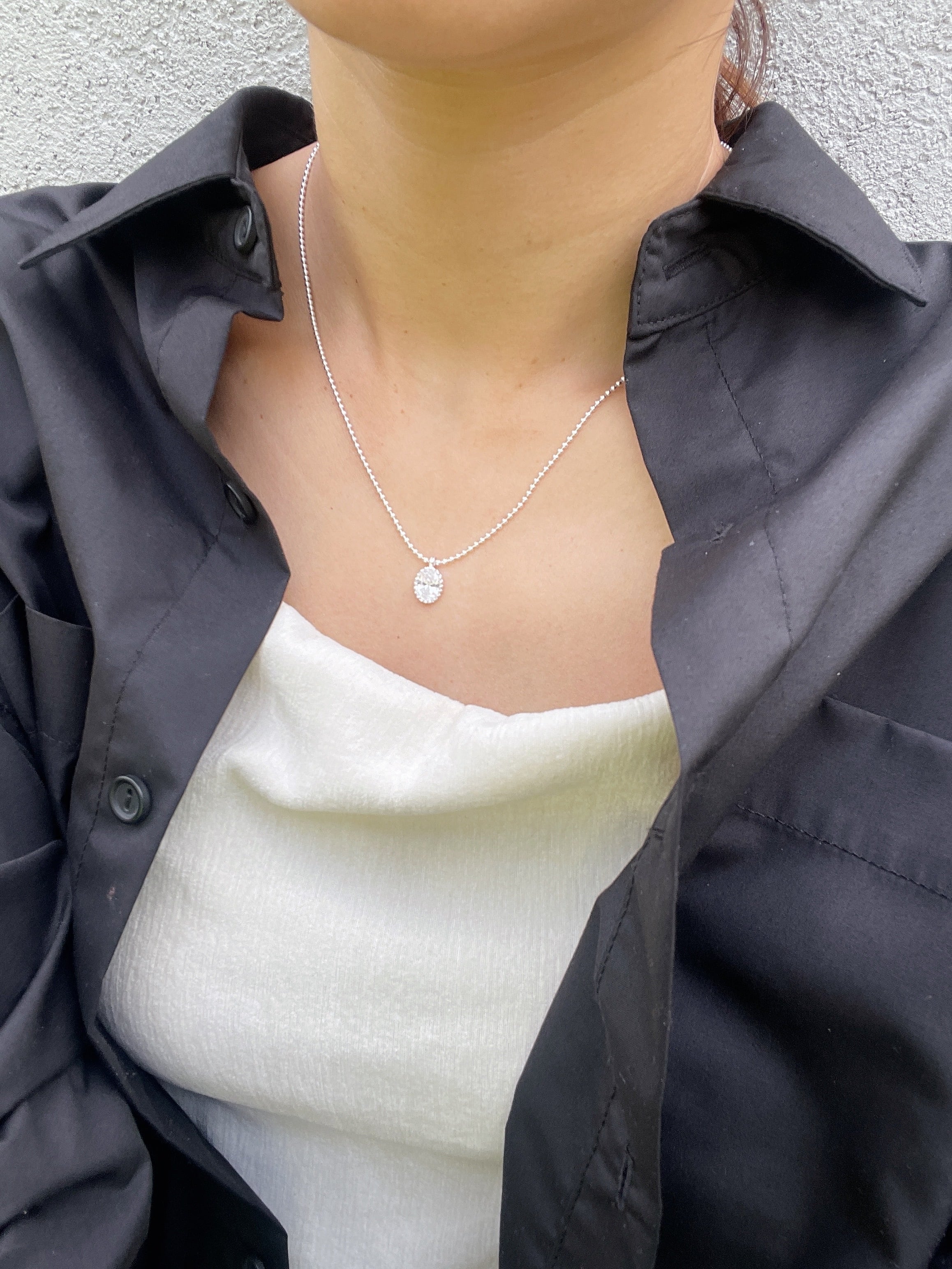 小粒のボールチェーンに、透明感のあるオーバルストーンが揺れる「シルバーグロウネックレス」。