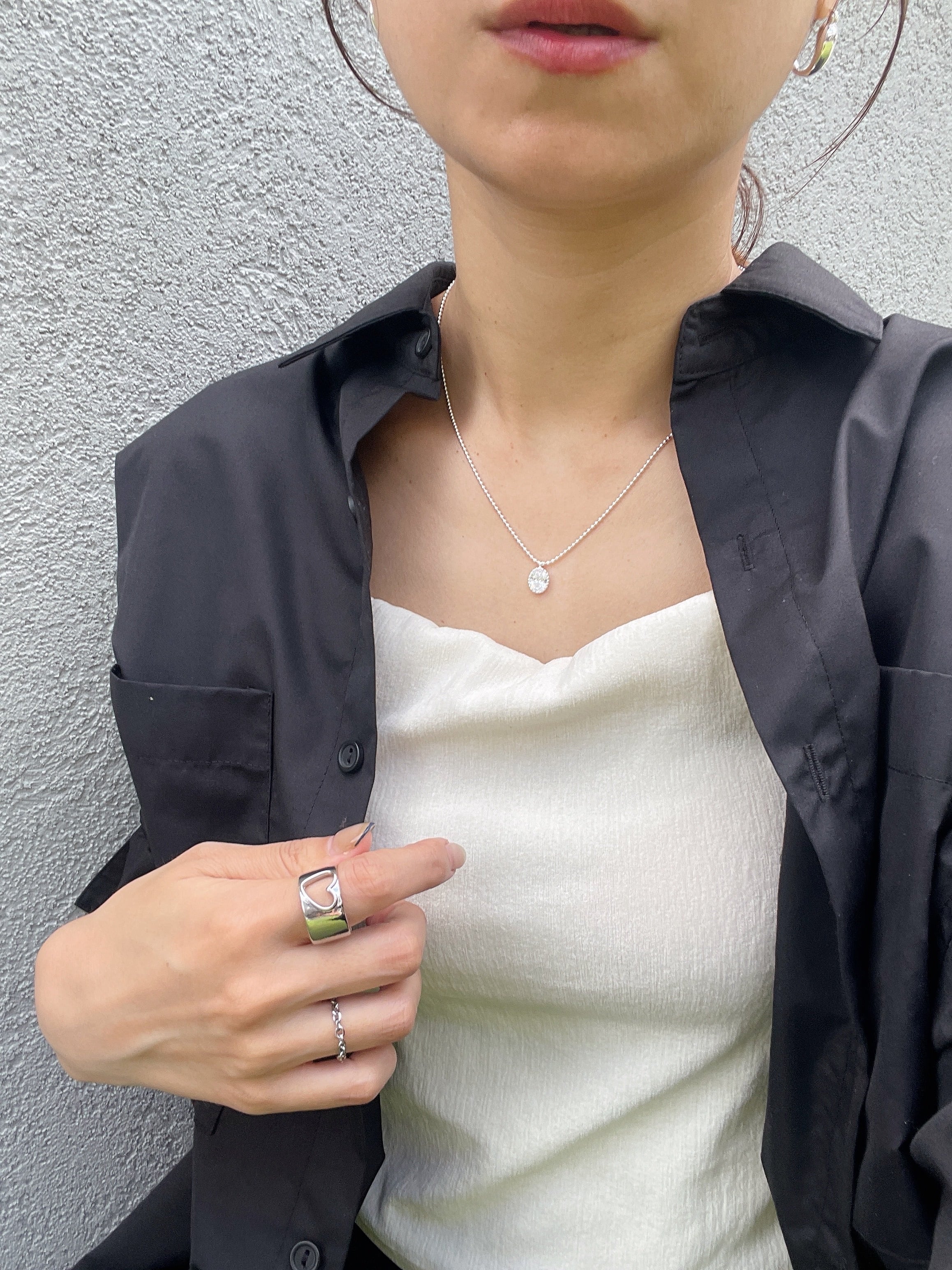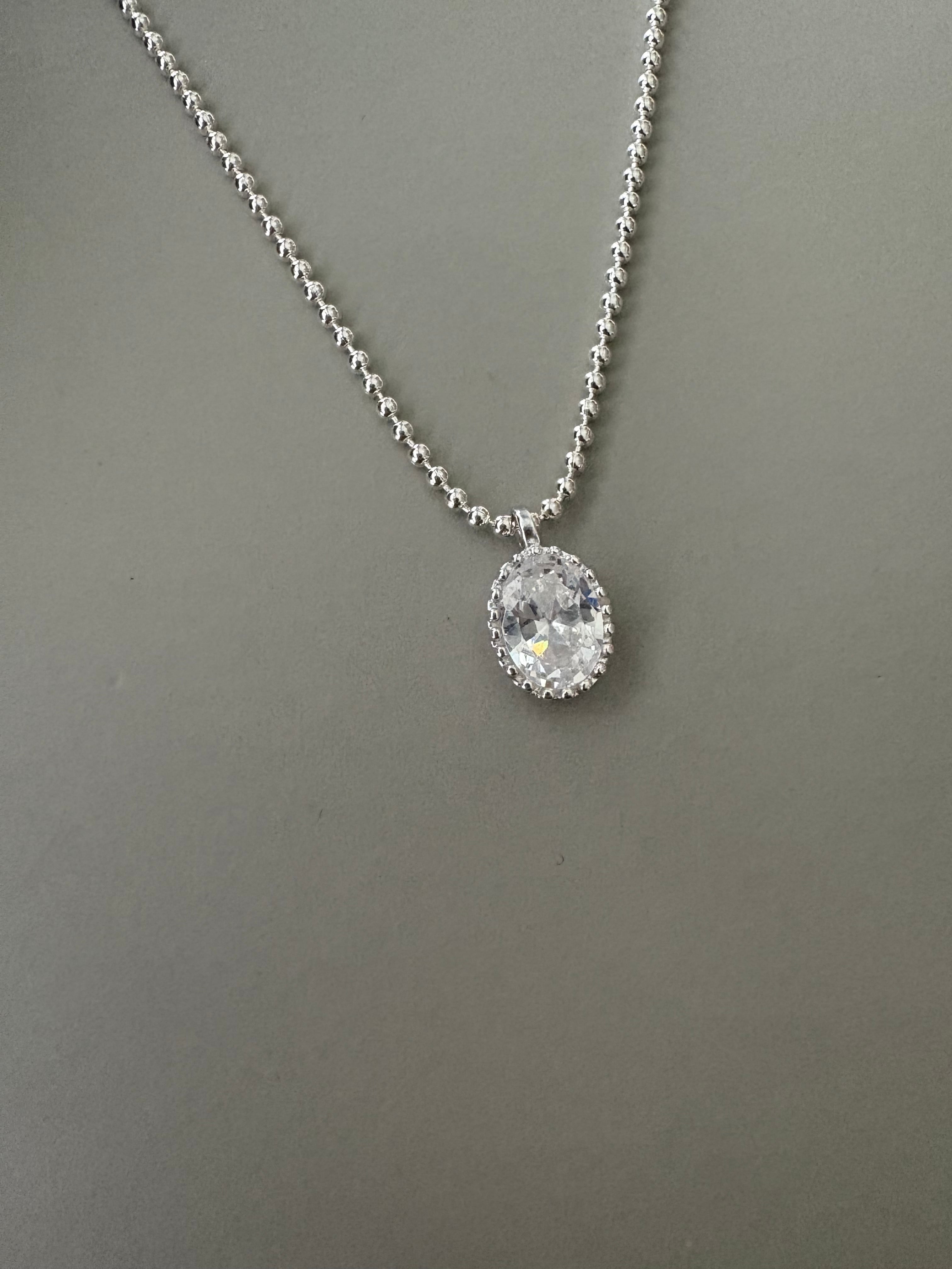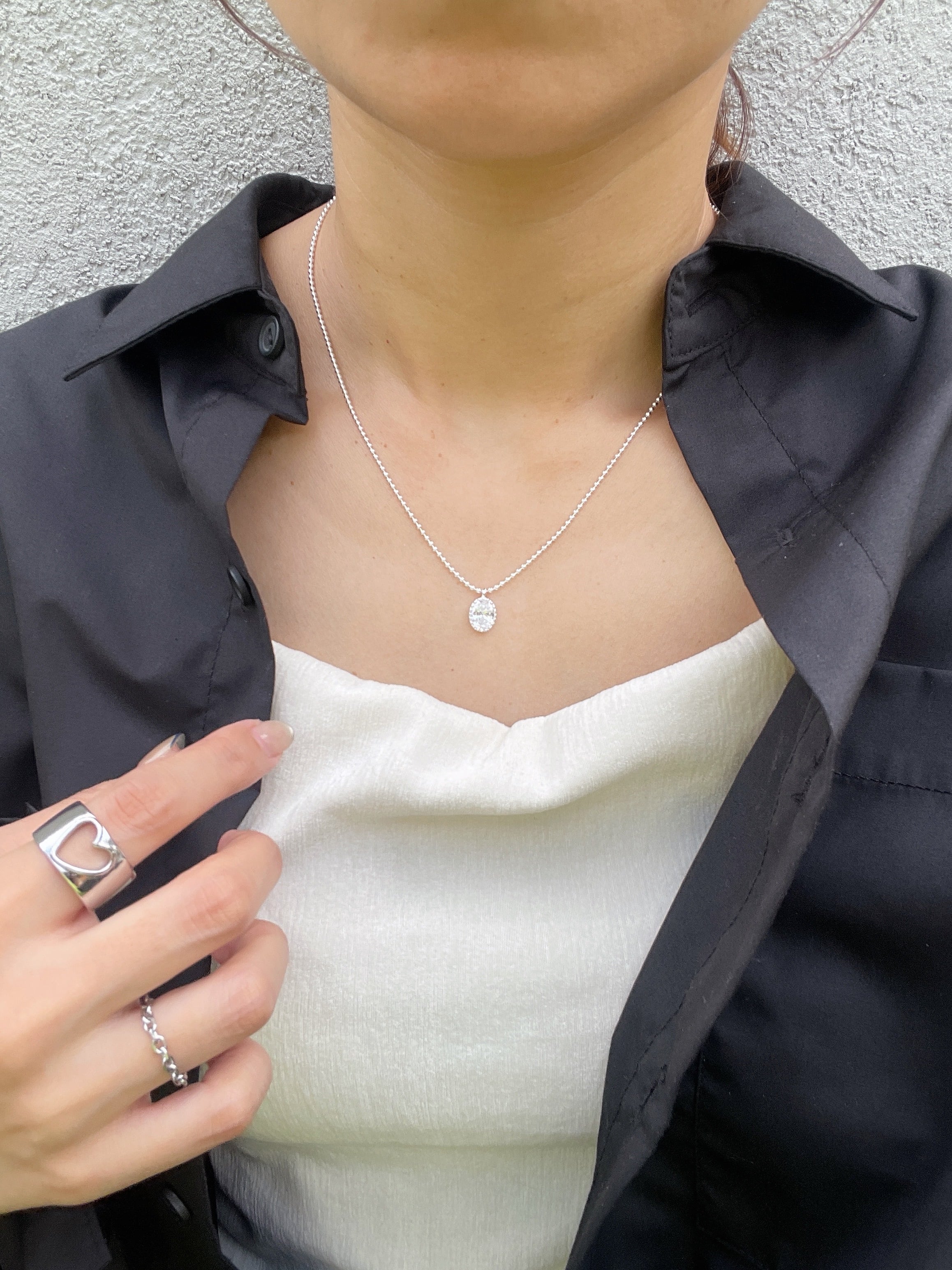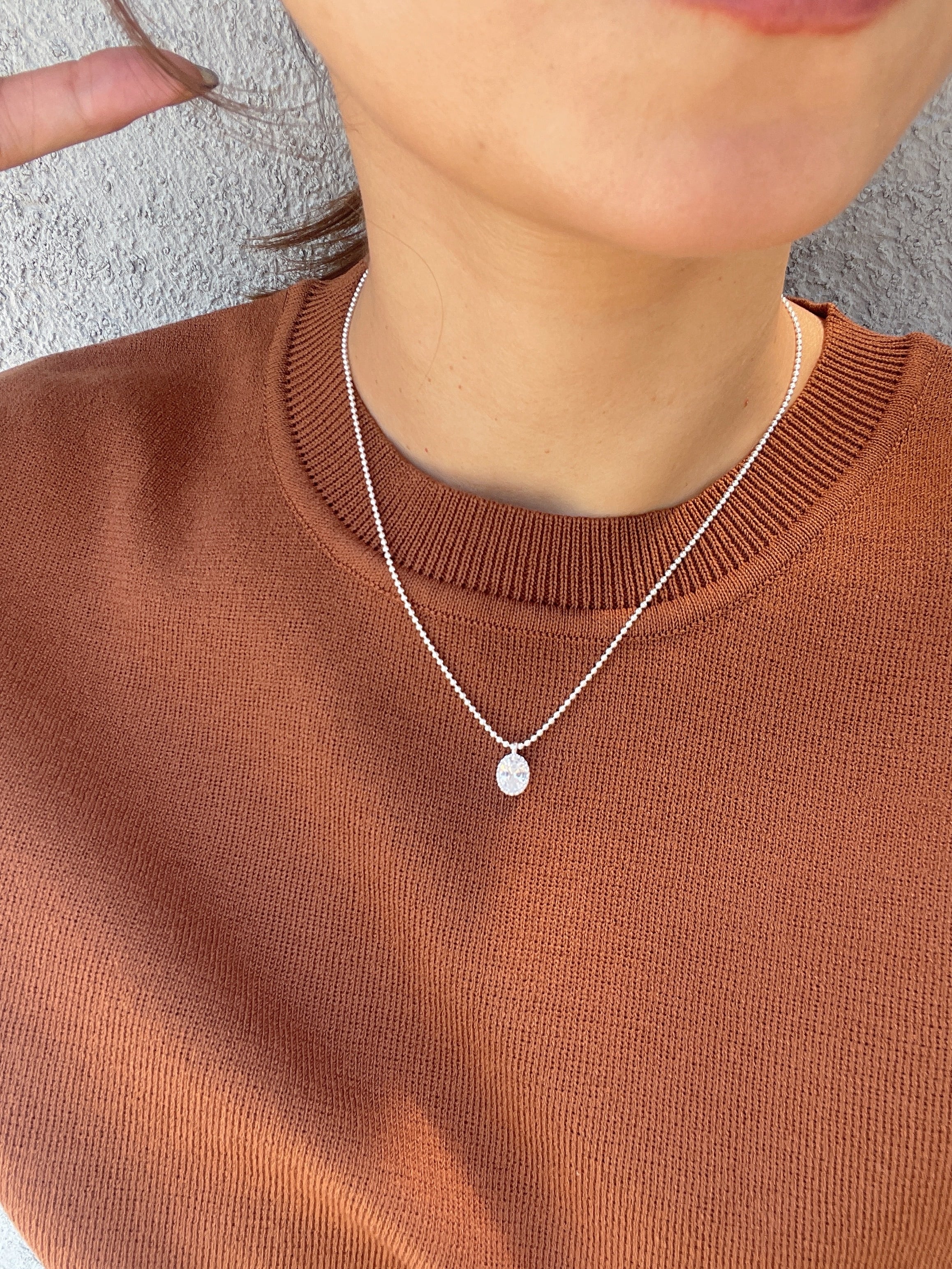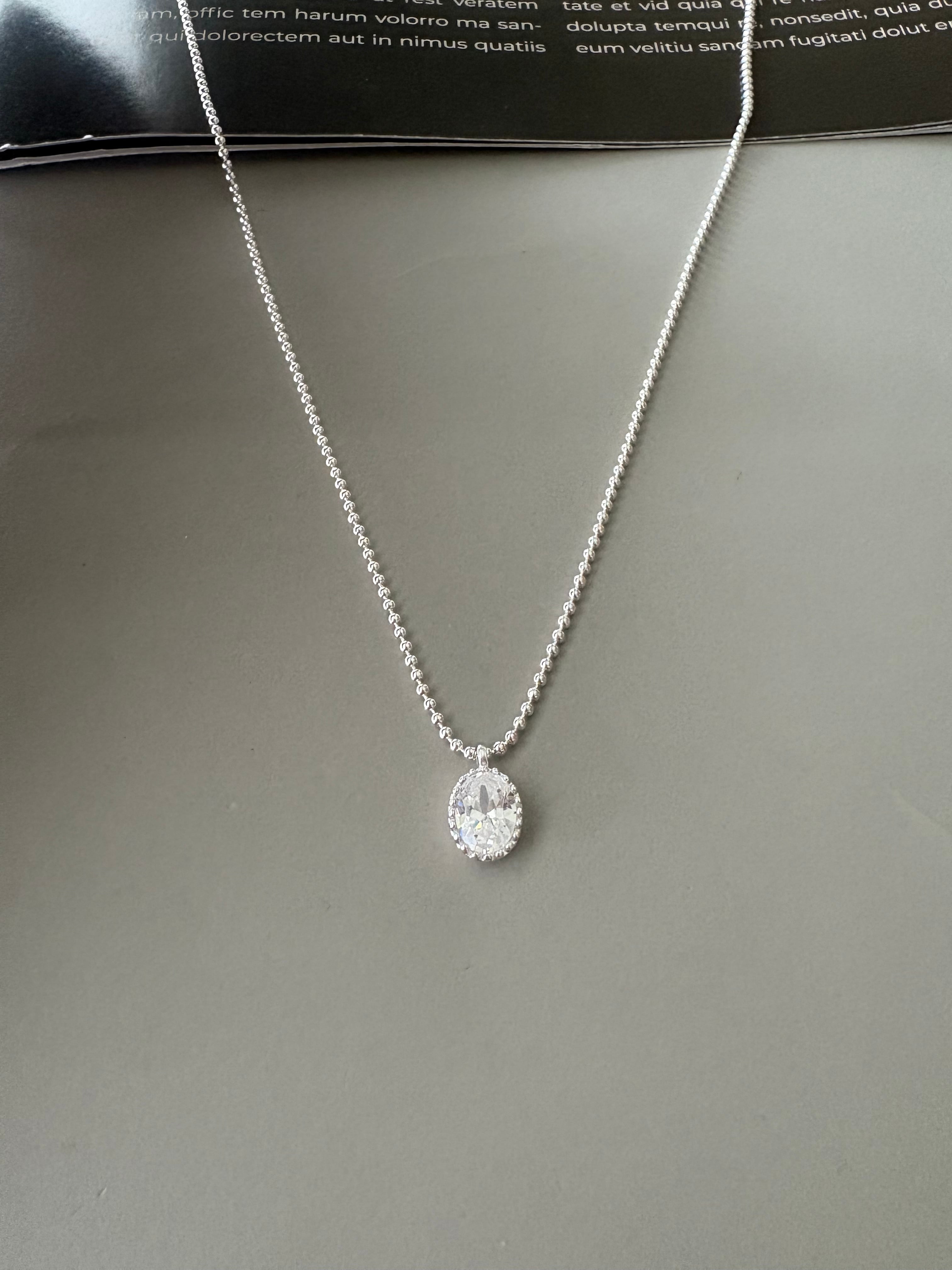 小粒のボールチェーンに、透明感のあるオーバルストーンが揺れる「シルバーグロウネックレス」。