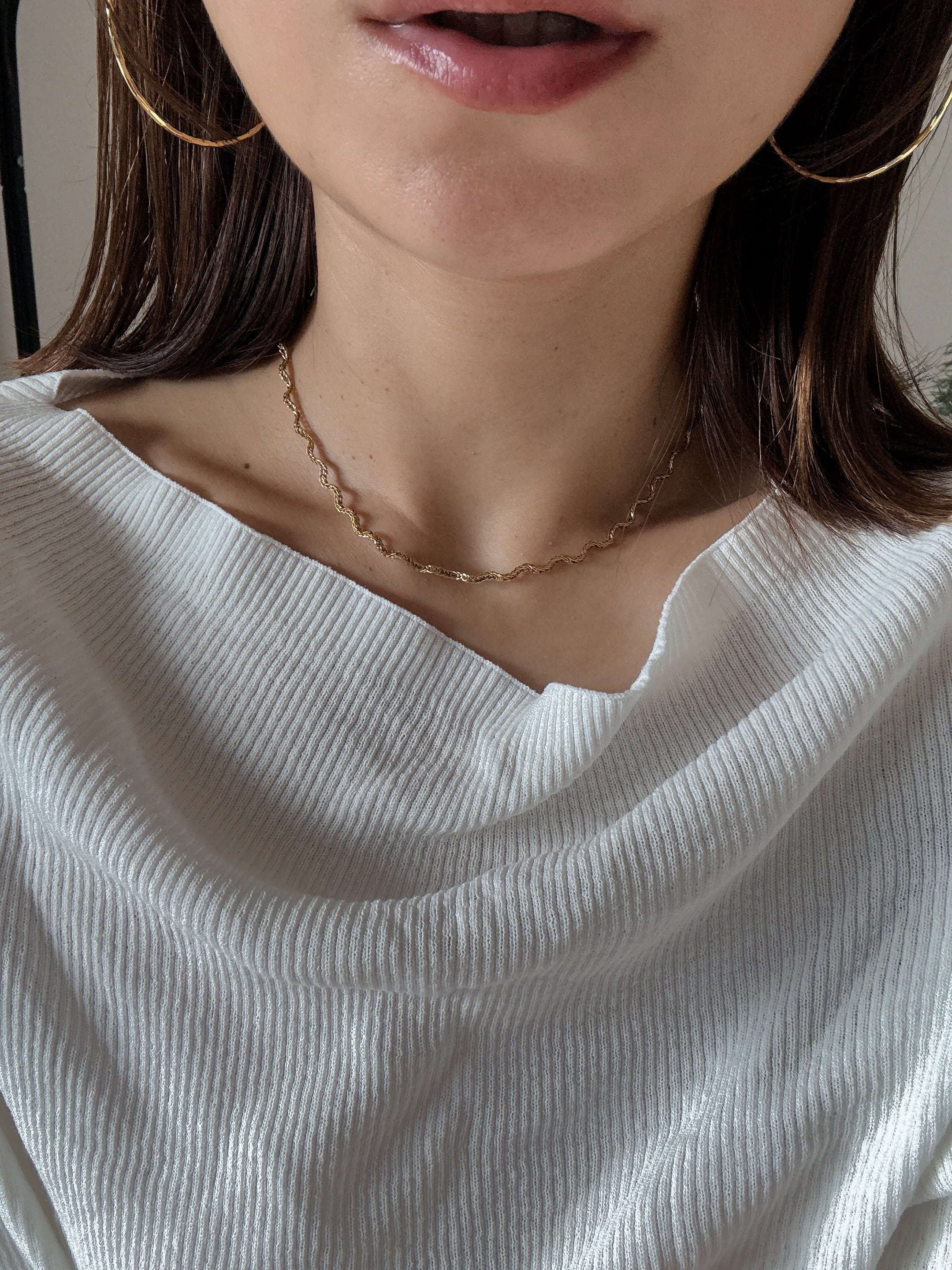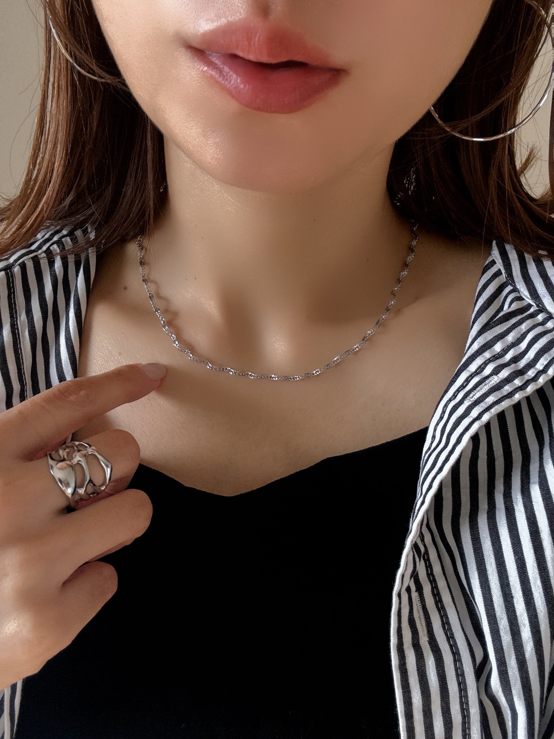 流れるようなウェーブデザインが特徴のネックレスで、光を受けて美しく煌めく仕上がりに。洗練されたシルエットは、シンプルながらも存在感を放ち、様々なスタイルに華やかさをプラスします。