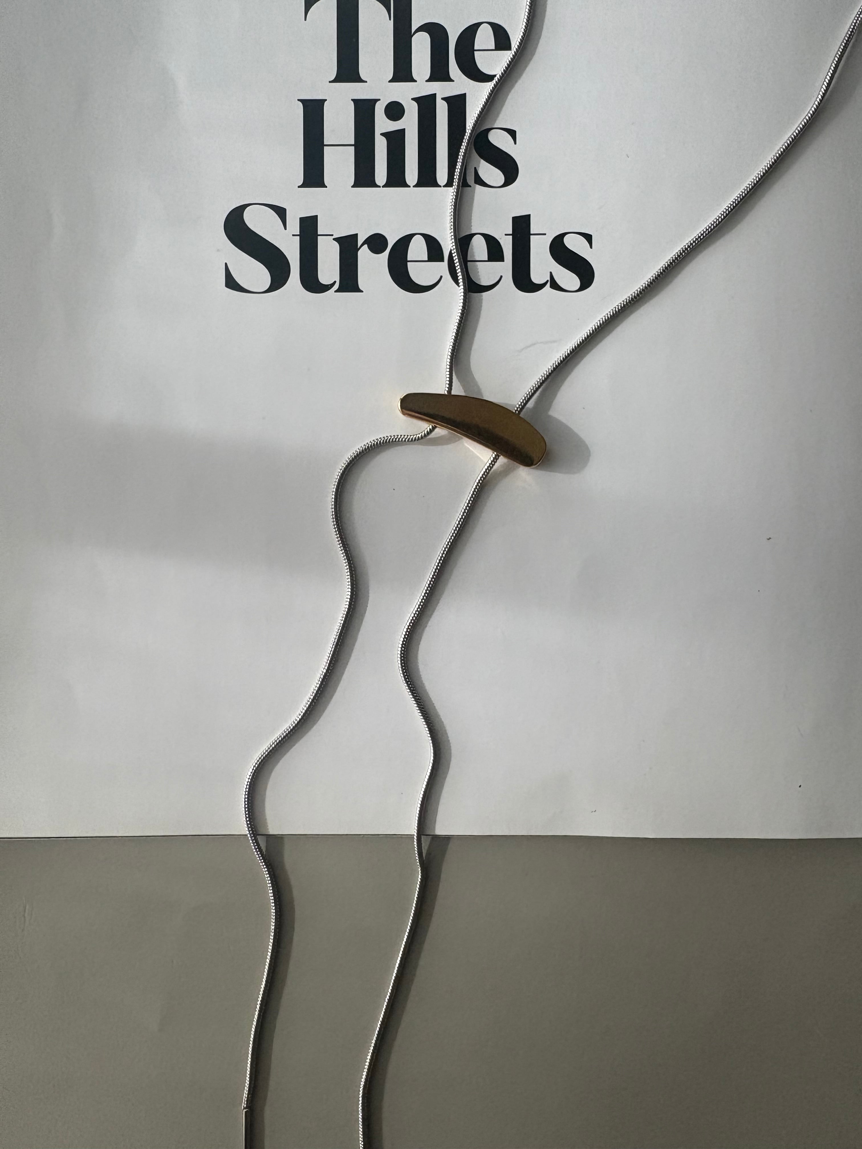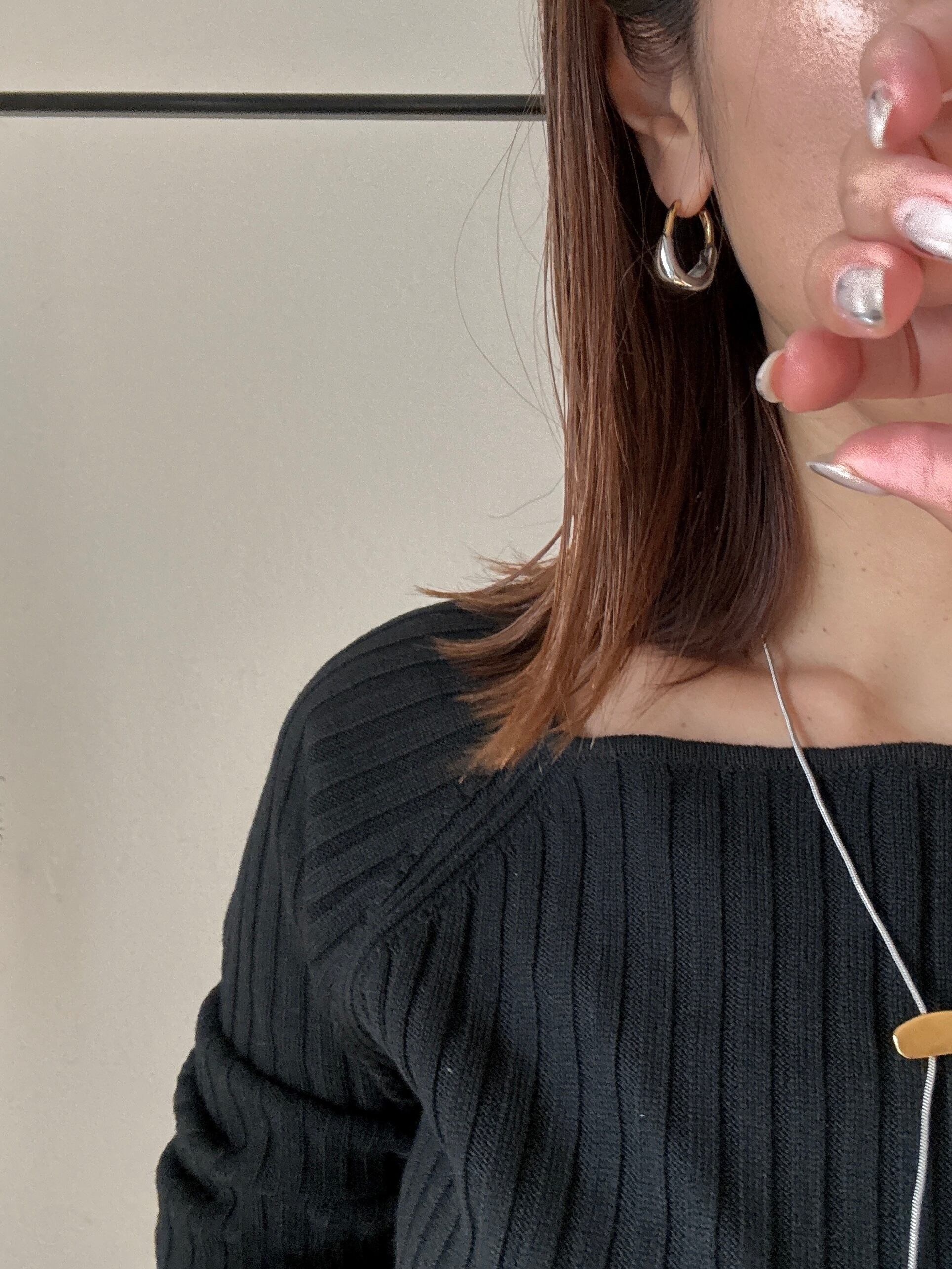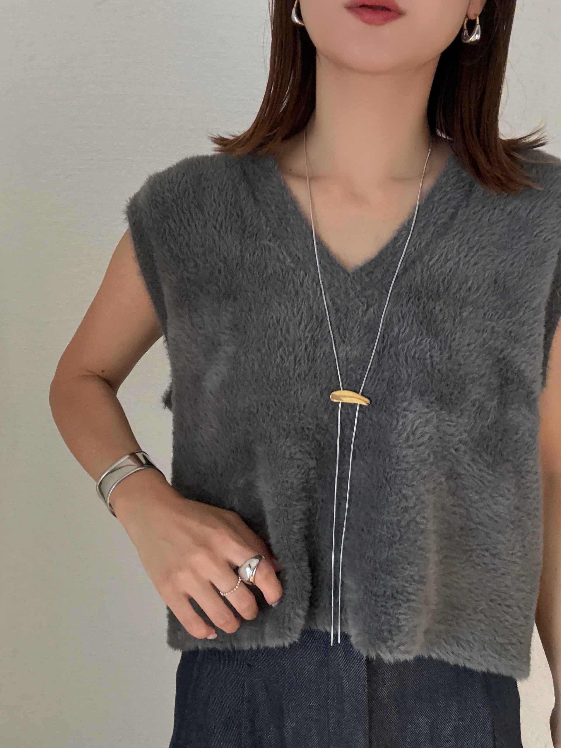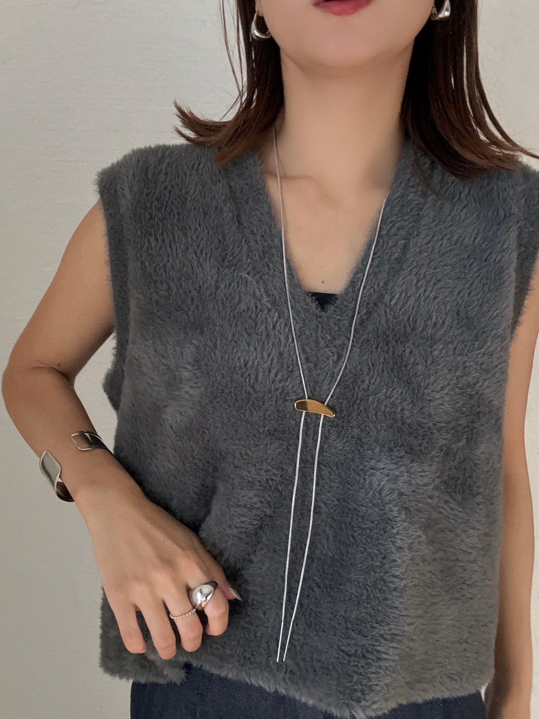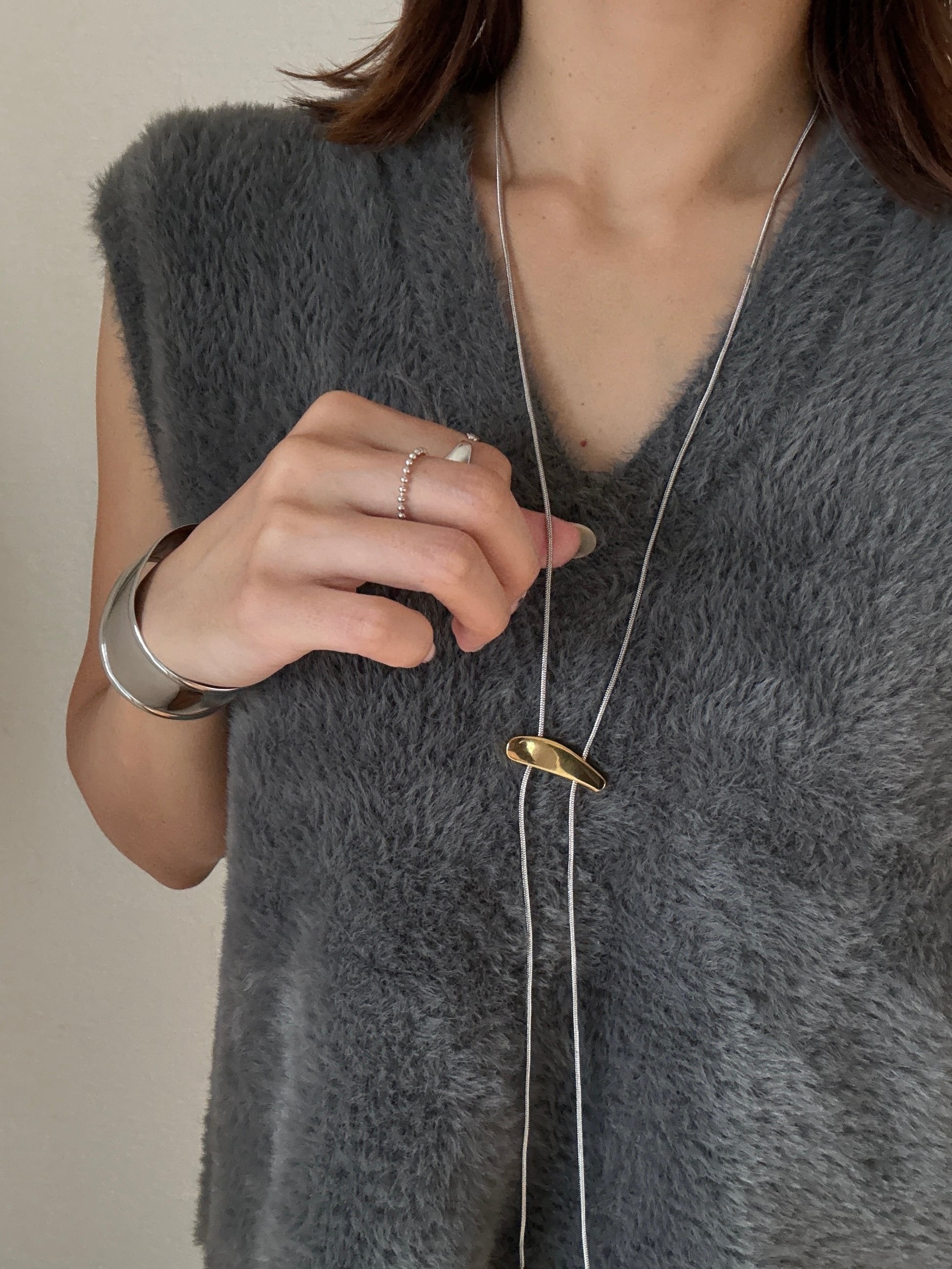 バー部分のゴールドとチェーンのシルバーが絶妙なバランスを生み、スタイリングにこなれ感をプラスします。