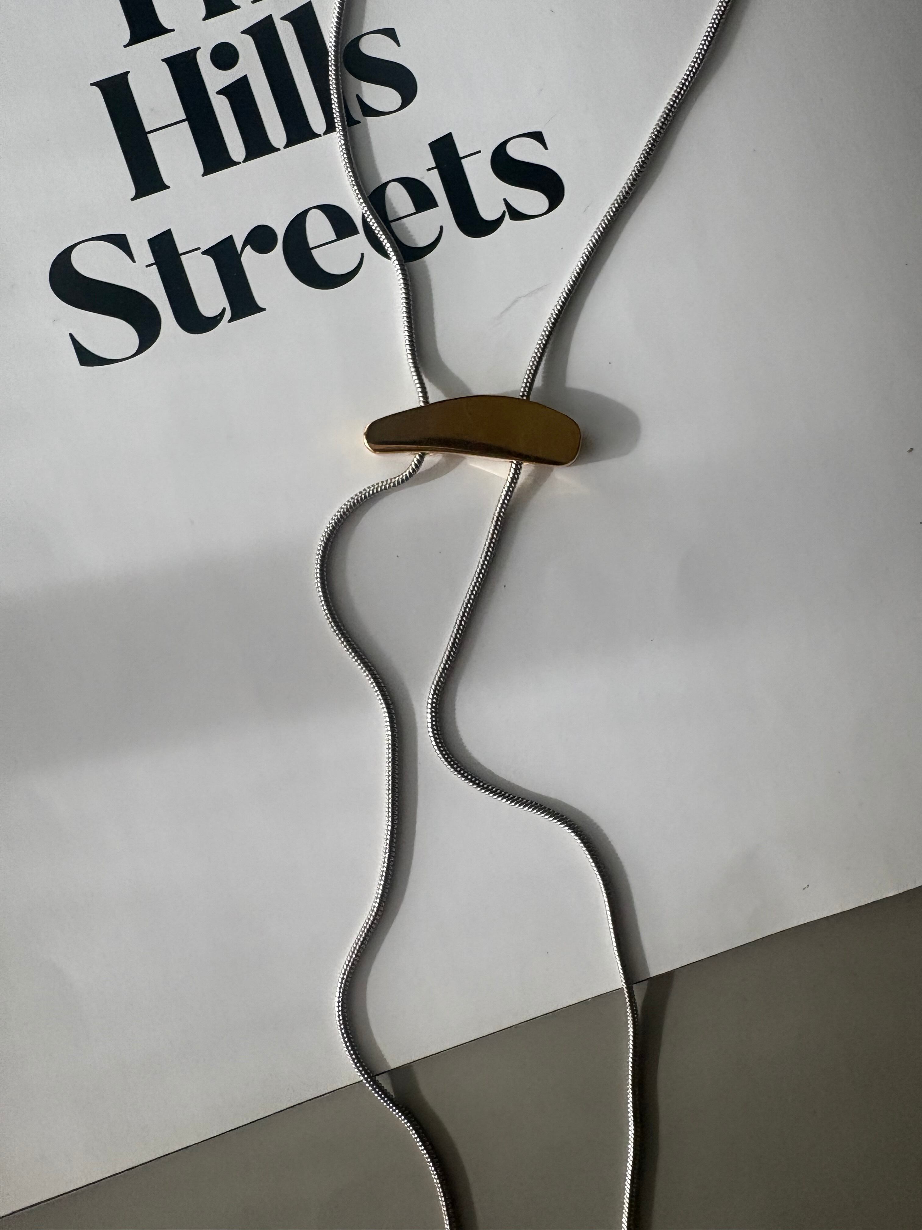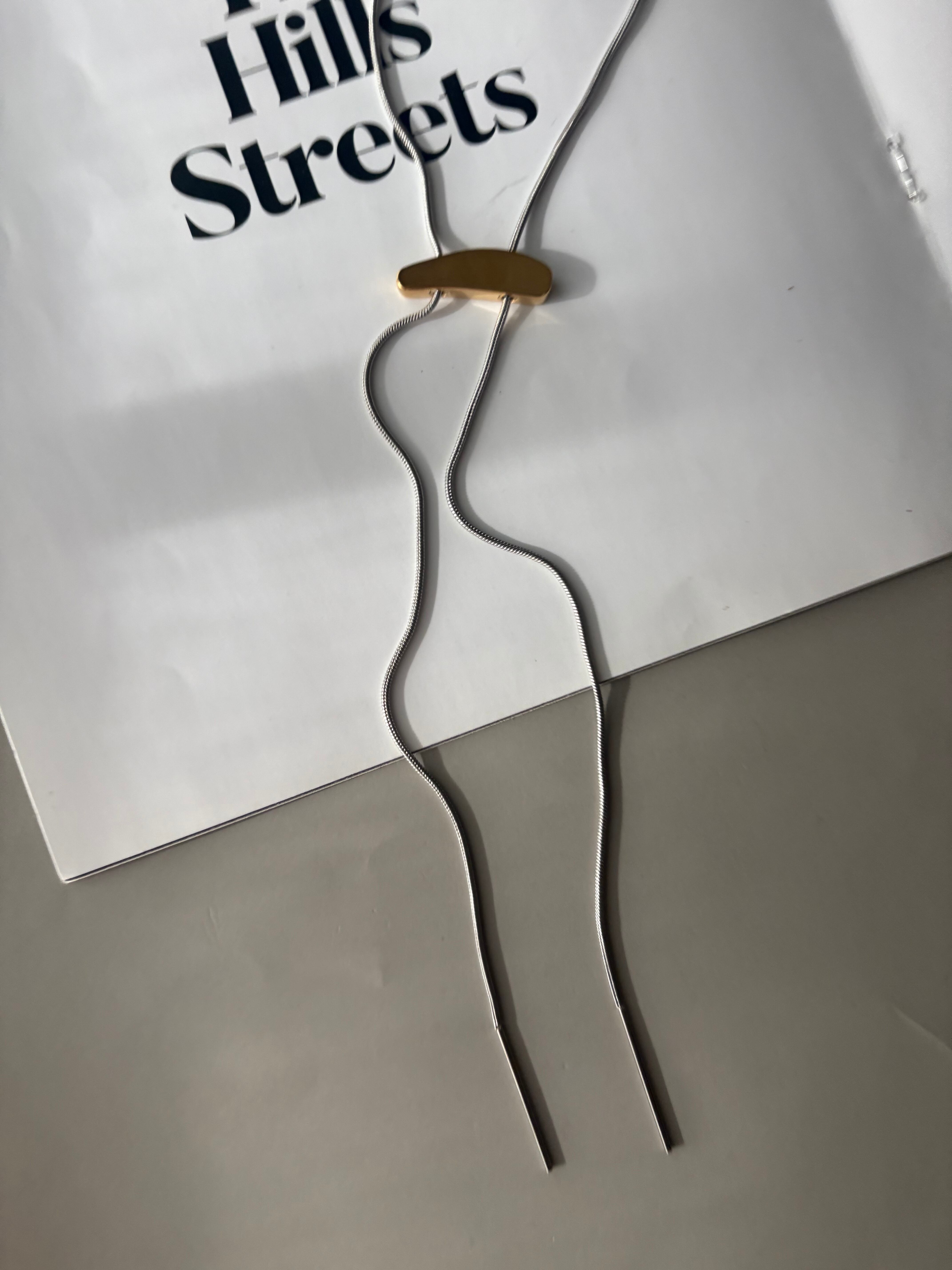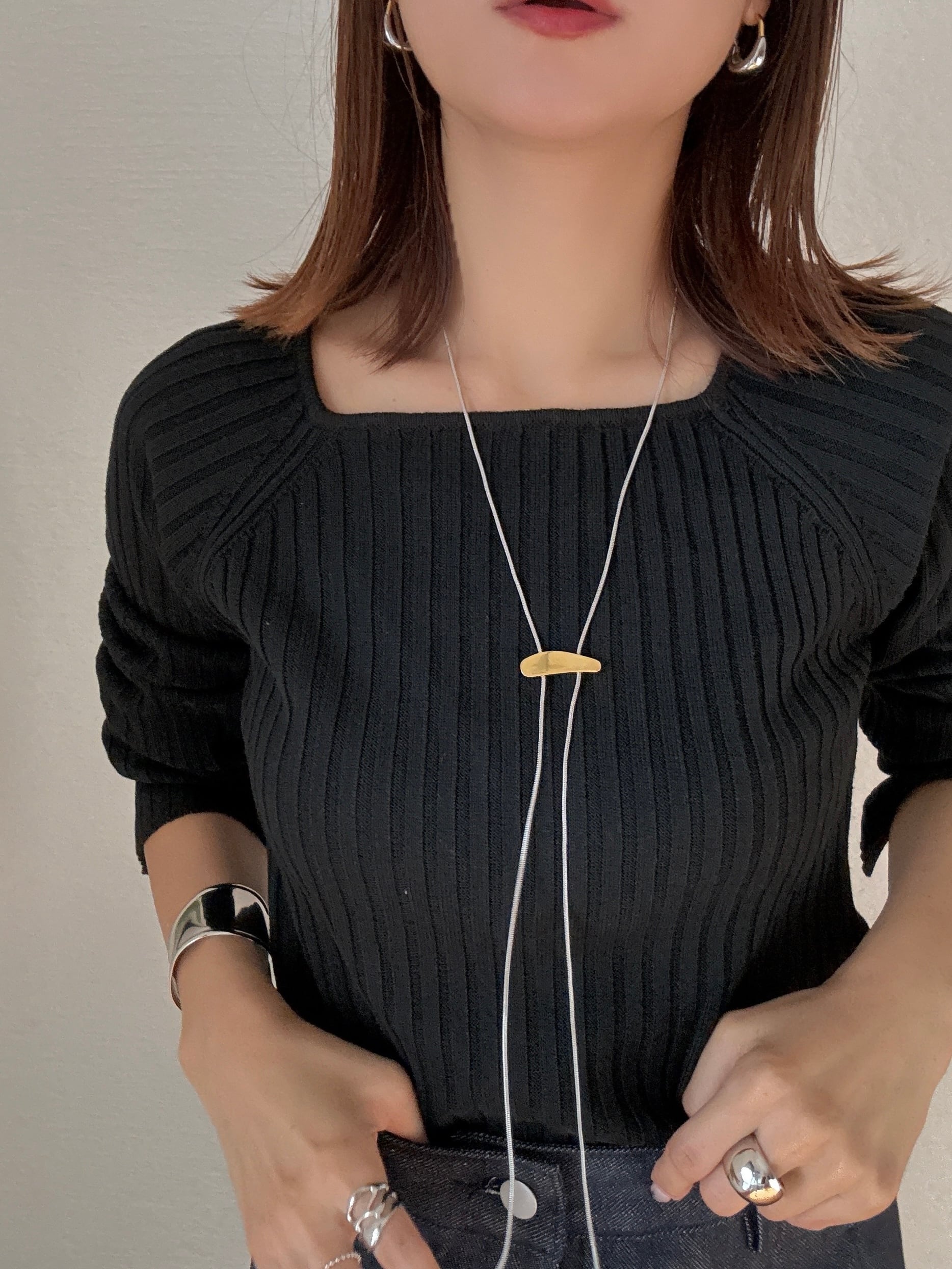 首元にすっと伸びる2本のラインと、中央のゴールドバーが印象的なロングネックレス。