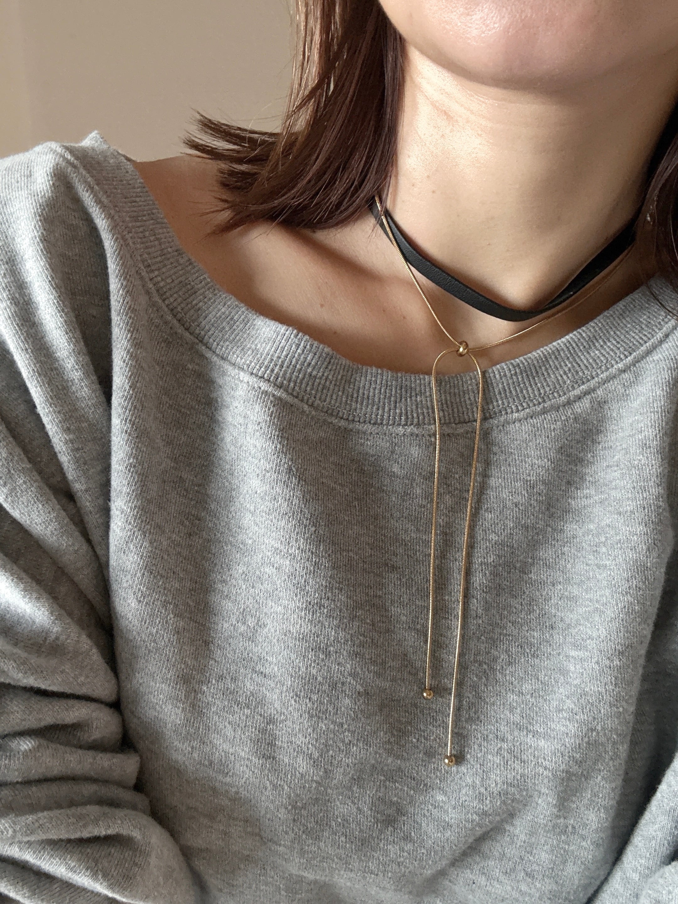長さを自在に調整できるスライド仕様で、チョーカーのようにすっきりまとめたり、