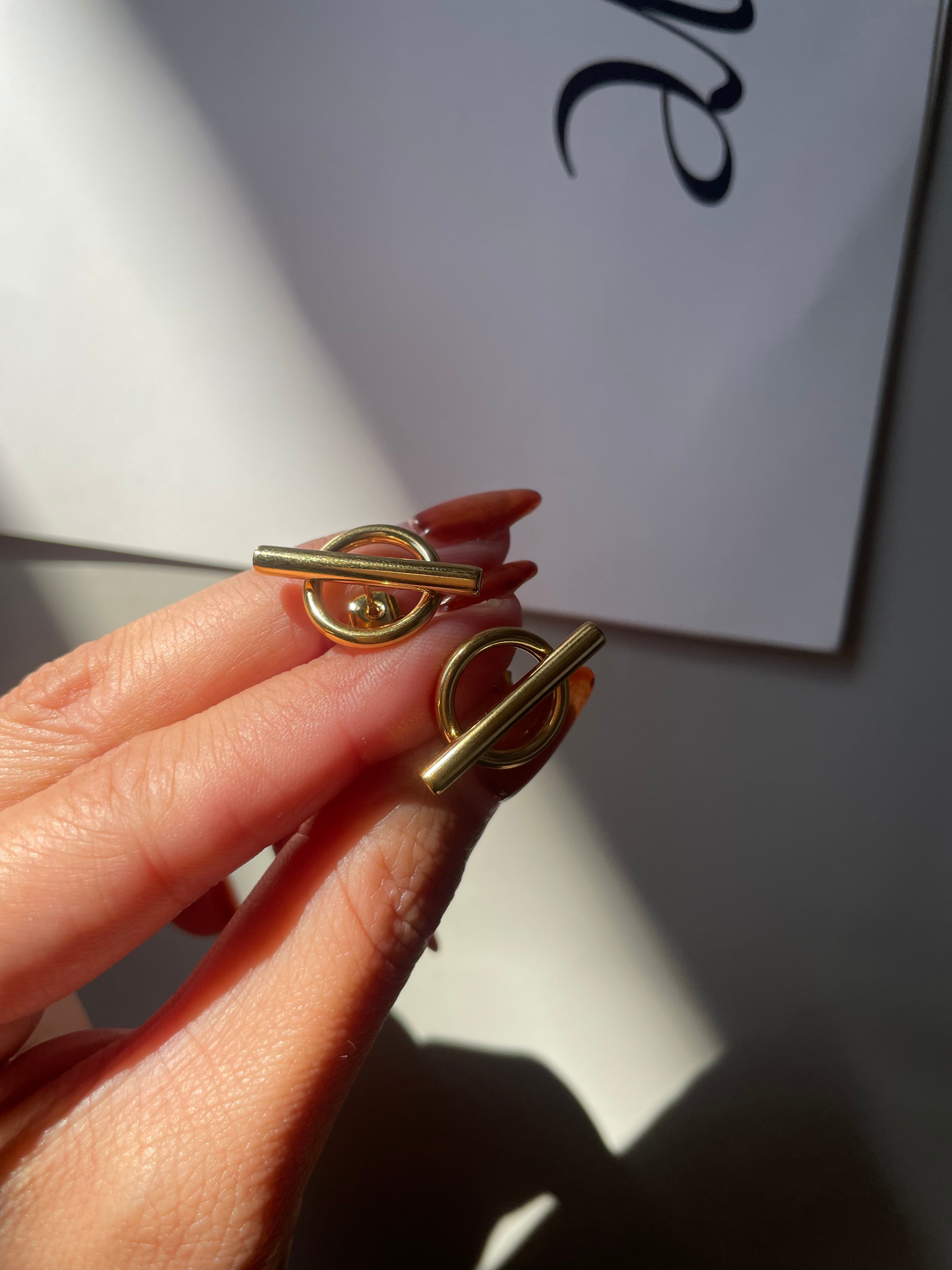 ゴールドのメタルバーとラウンドフープを組み合わせた立体的なフォルムが特徴。