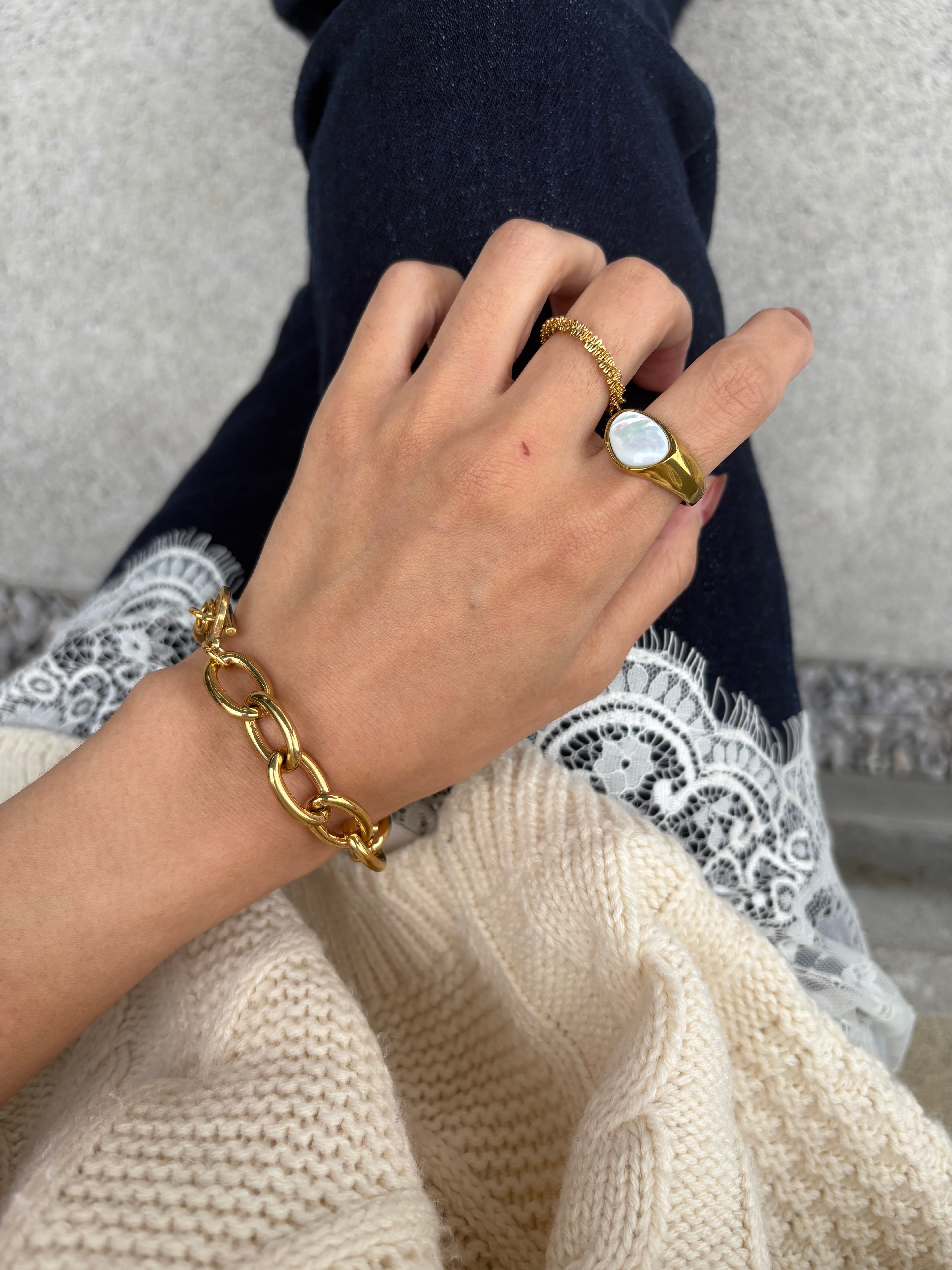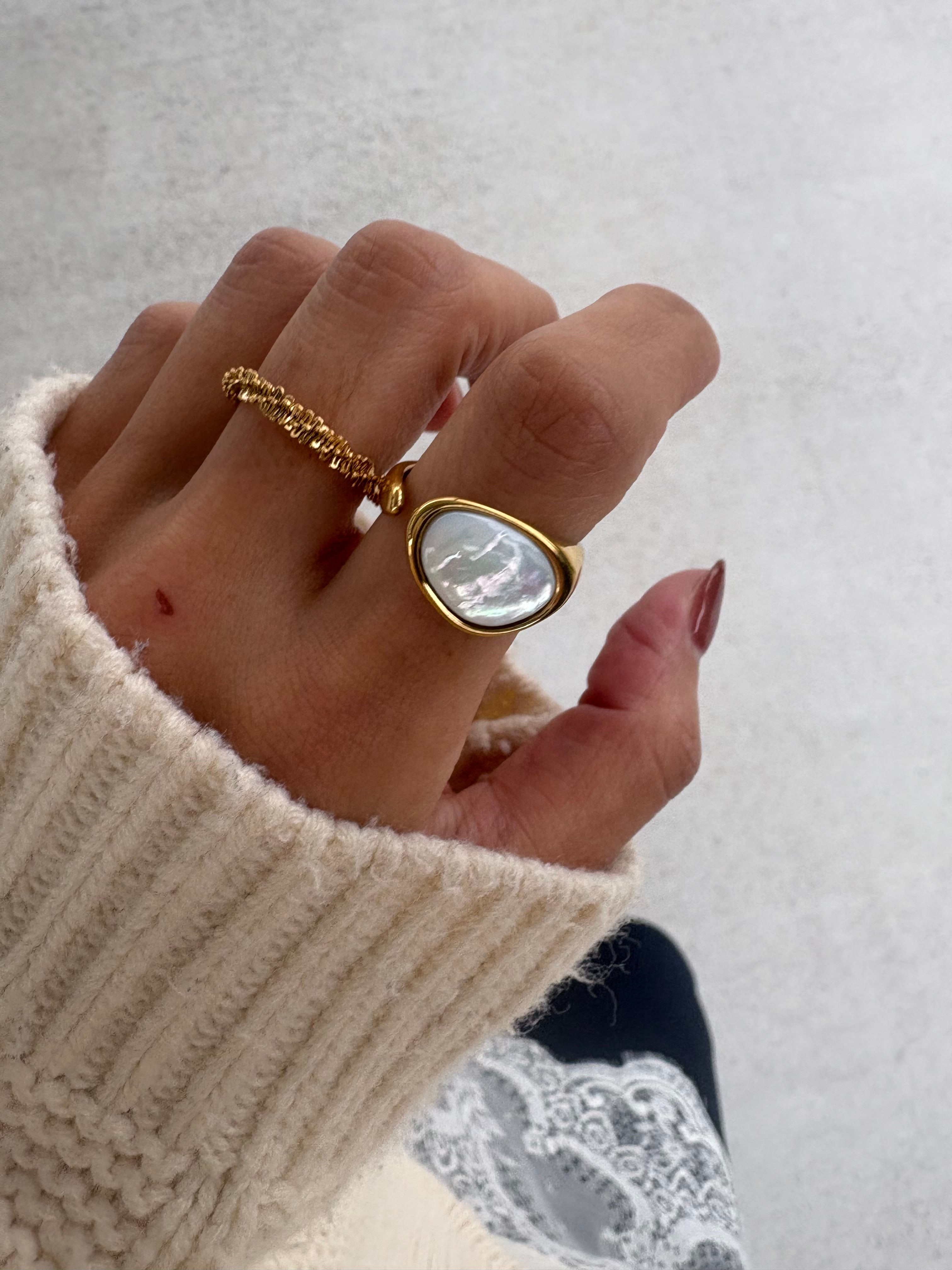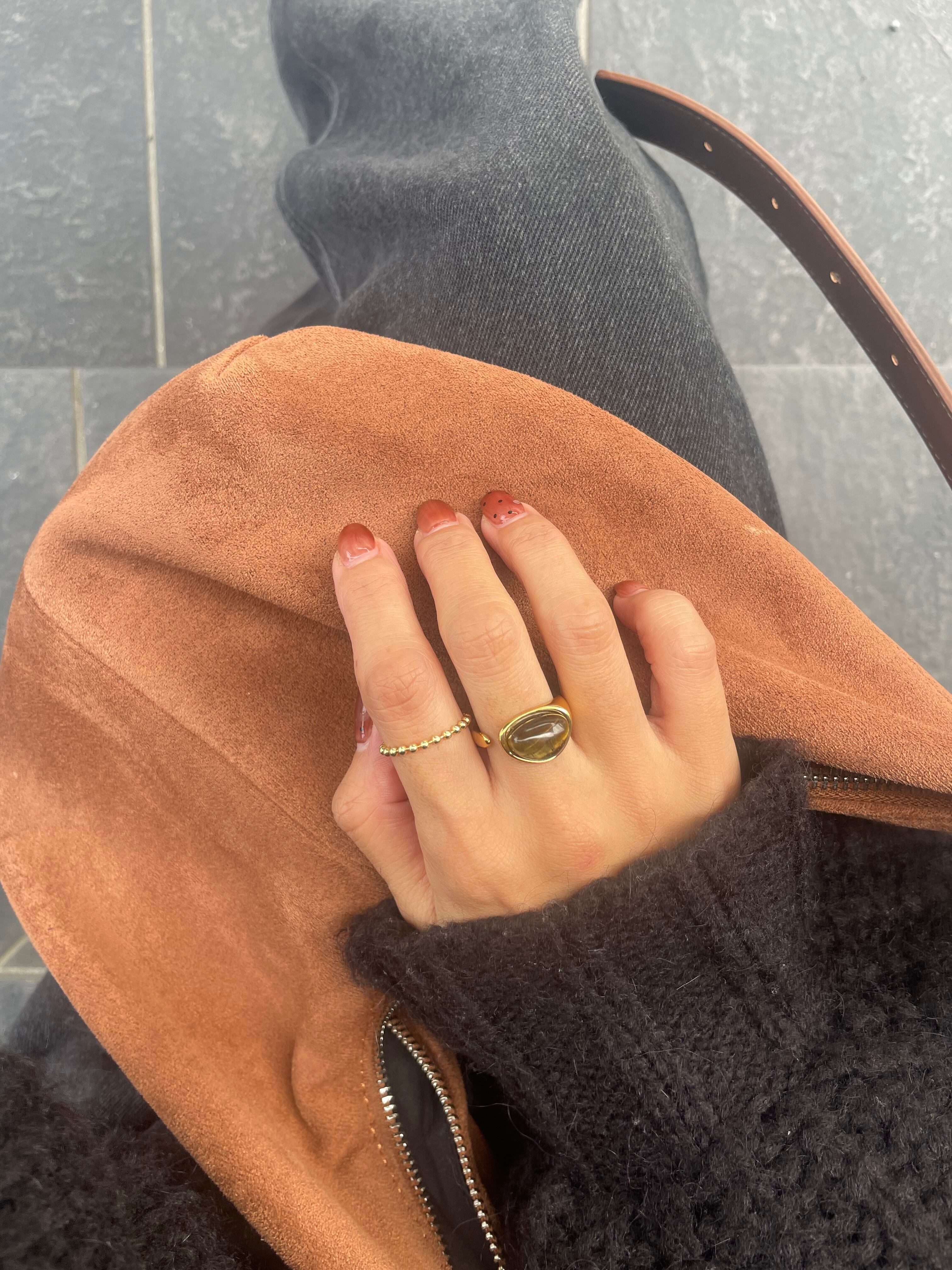 艶やかなゴールドに、天然石のような深みのあるカラーを合わせたトーンミックスリング。