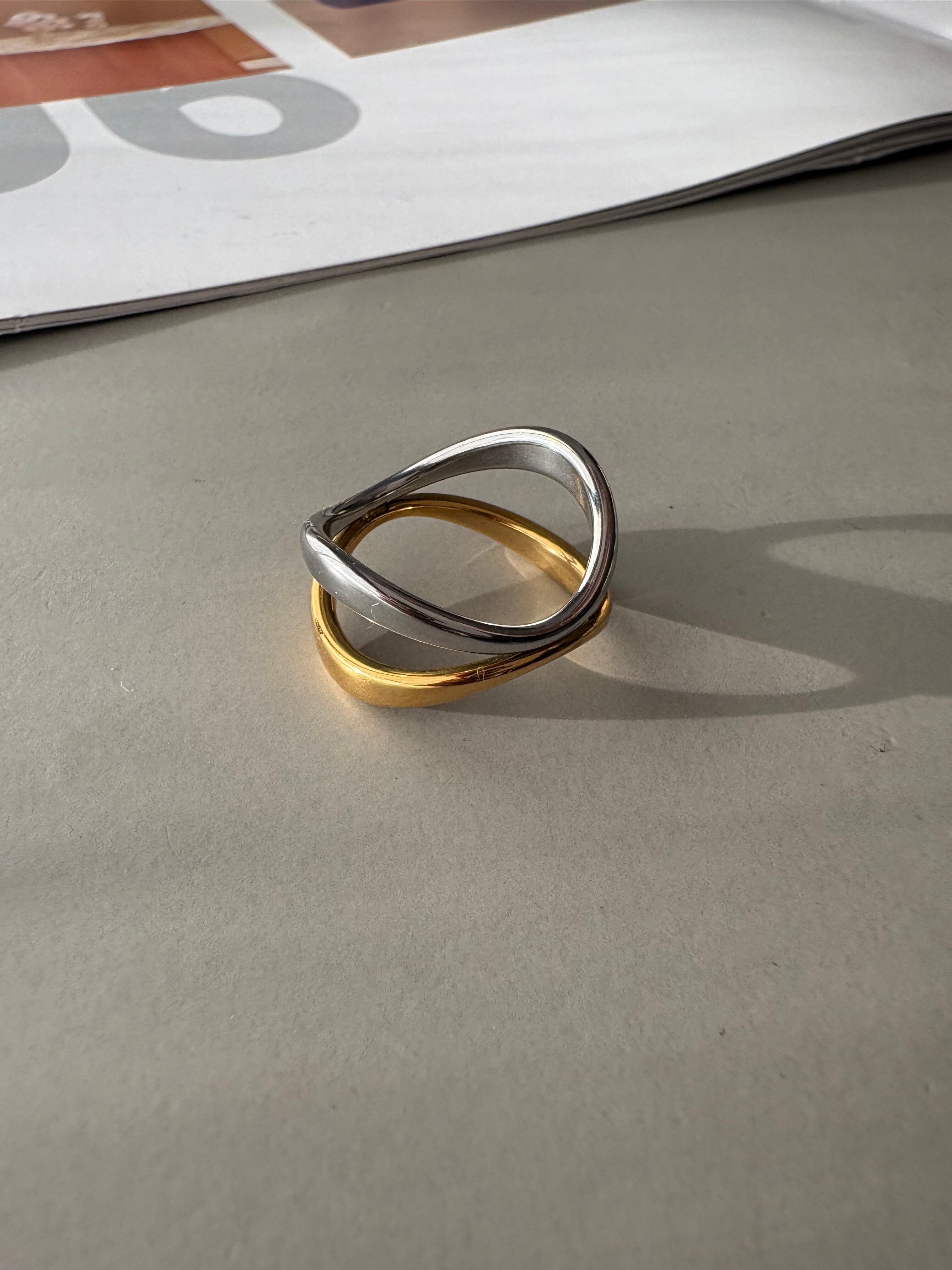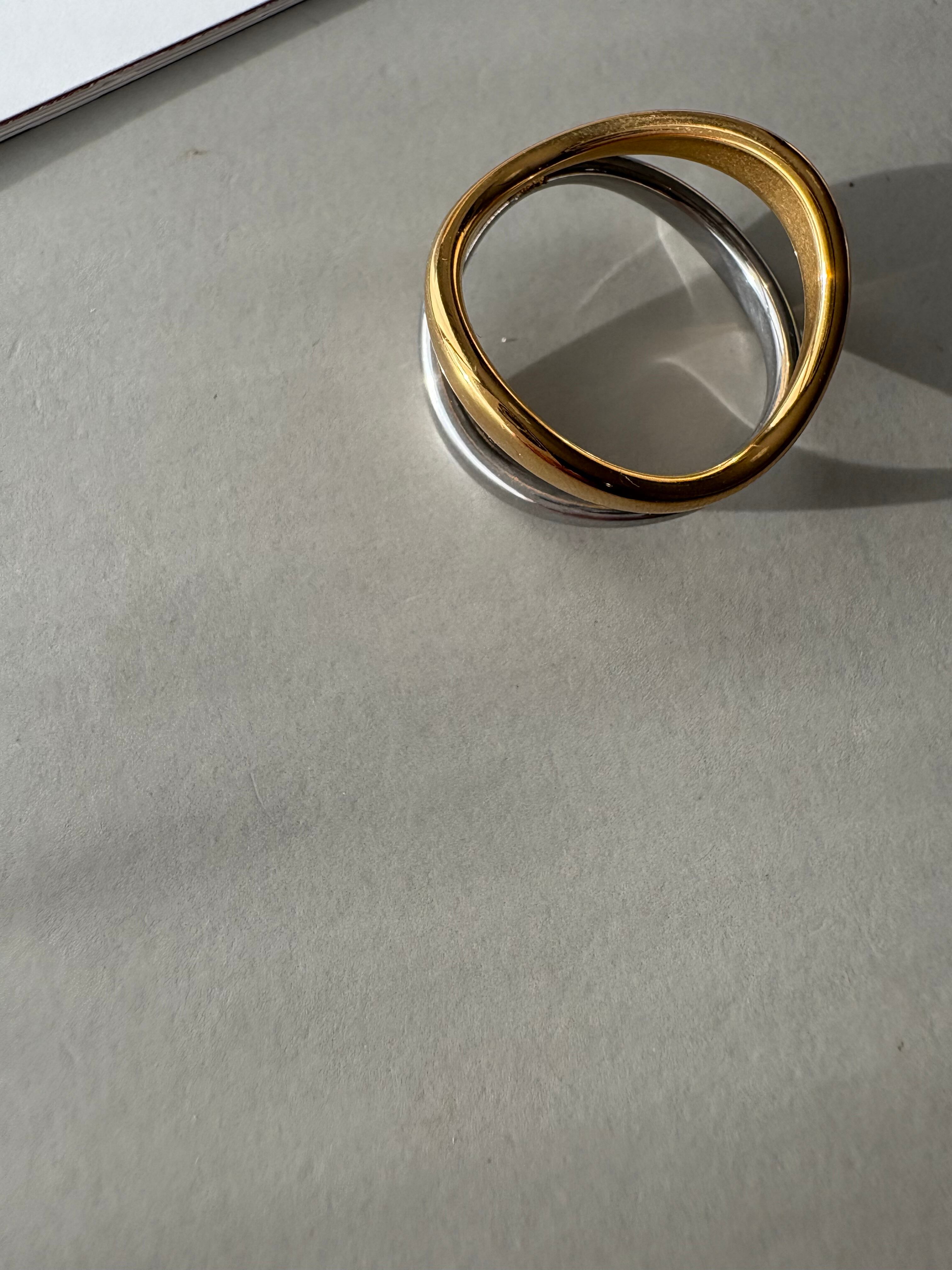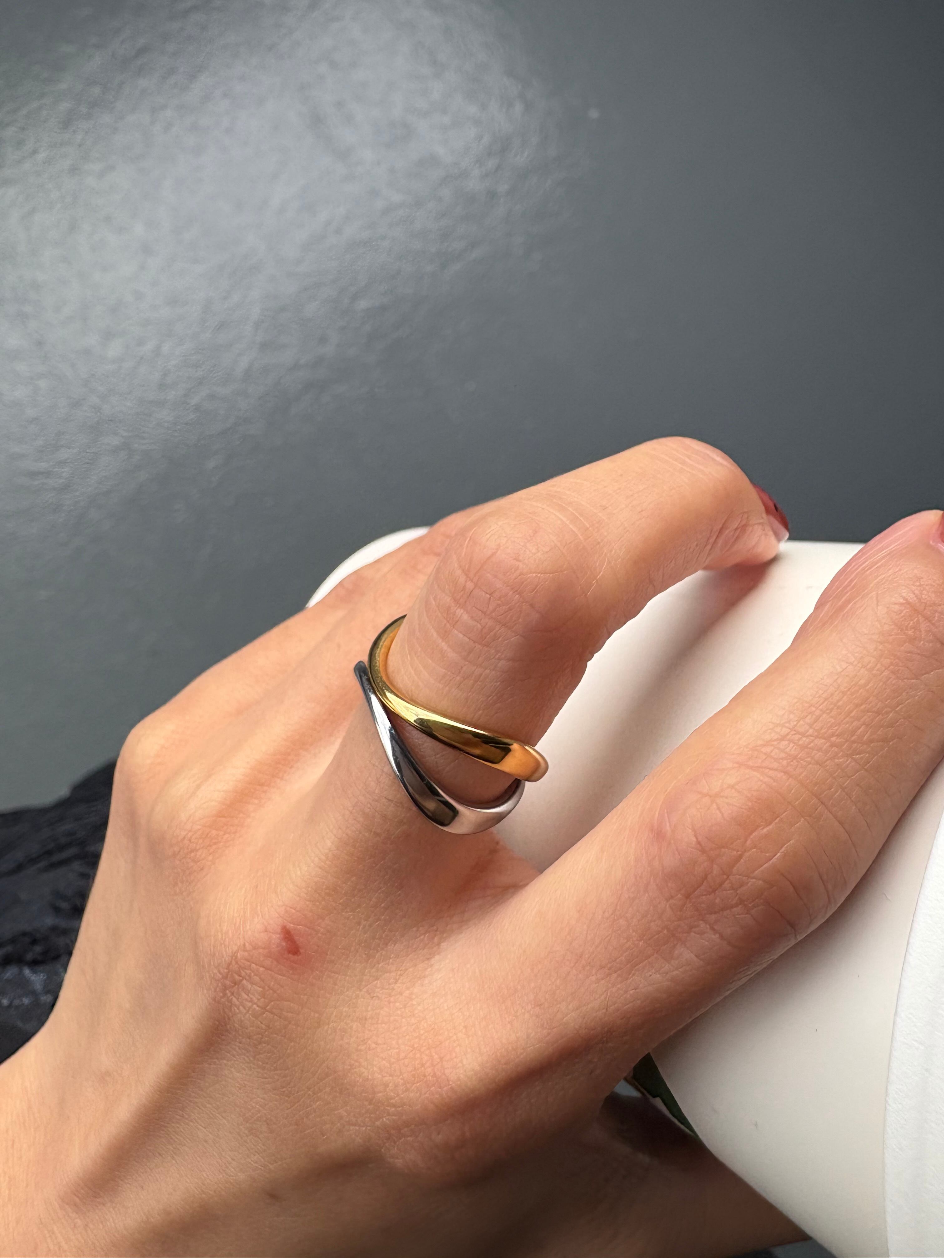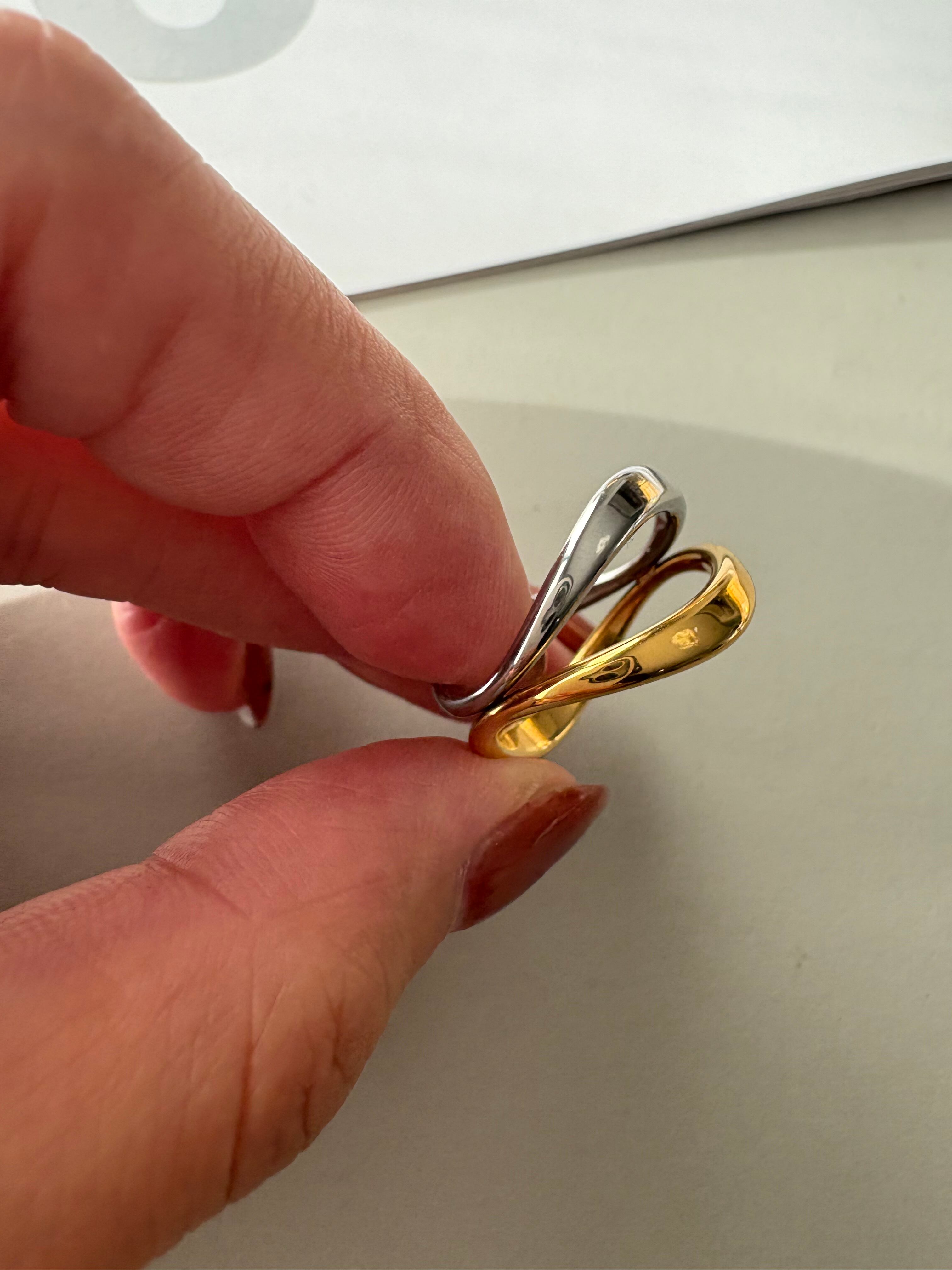 シルバーとゴールド、2色のメタルが重なり合うバイカラーデザイン。