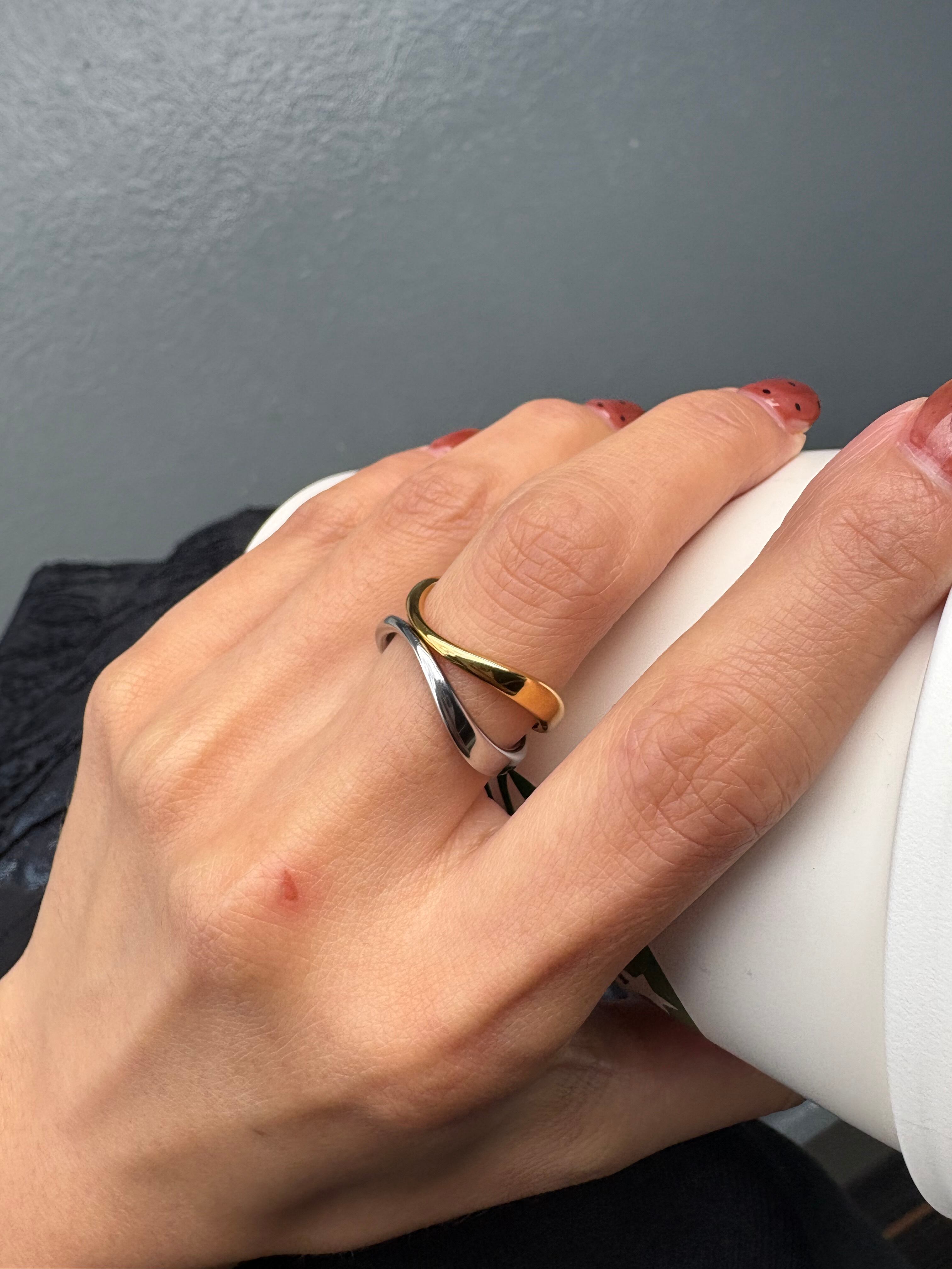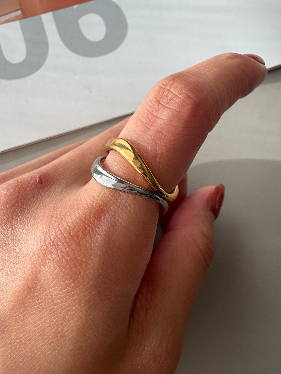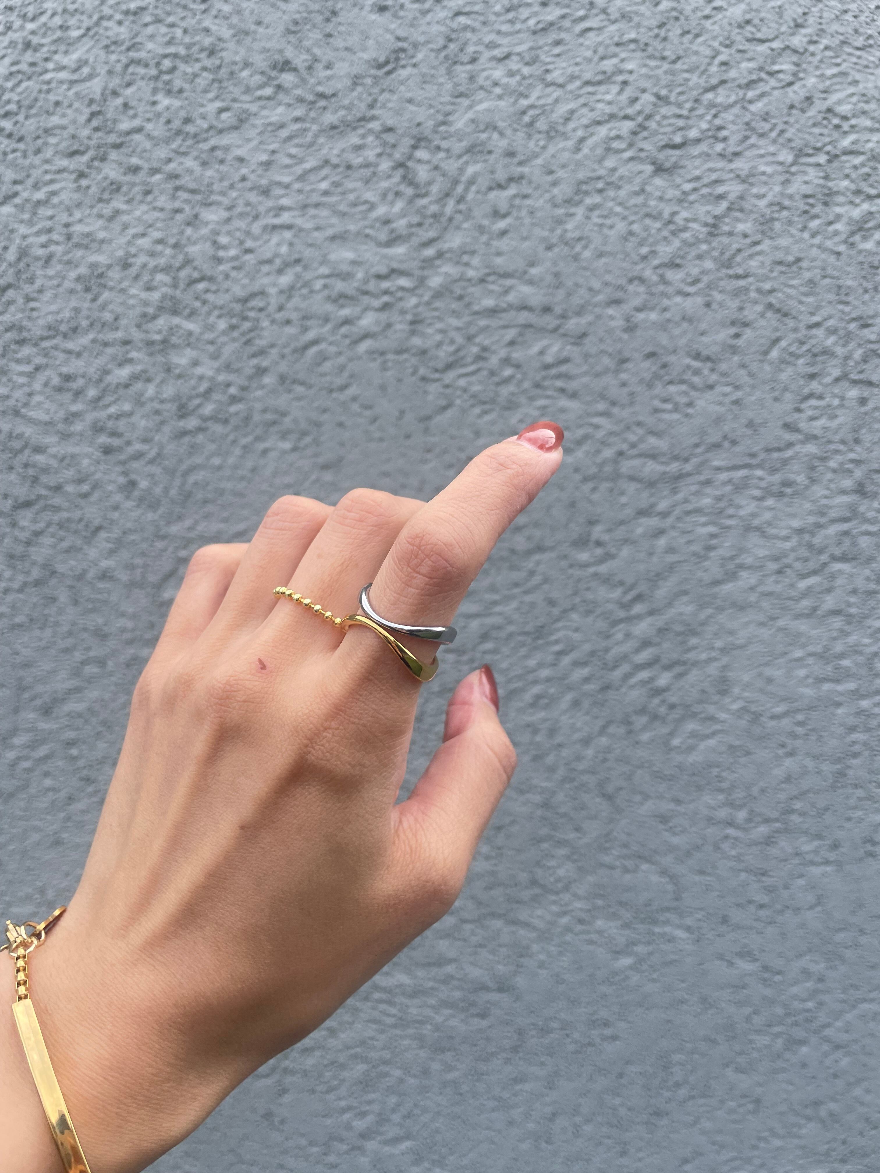 シルバーとゴールド、2色のメタルが重なり合うバイカラーデザイン。