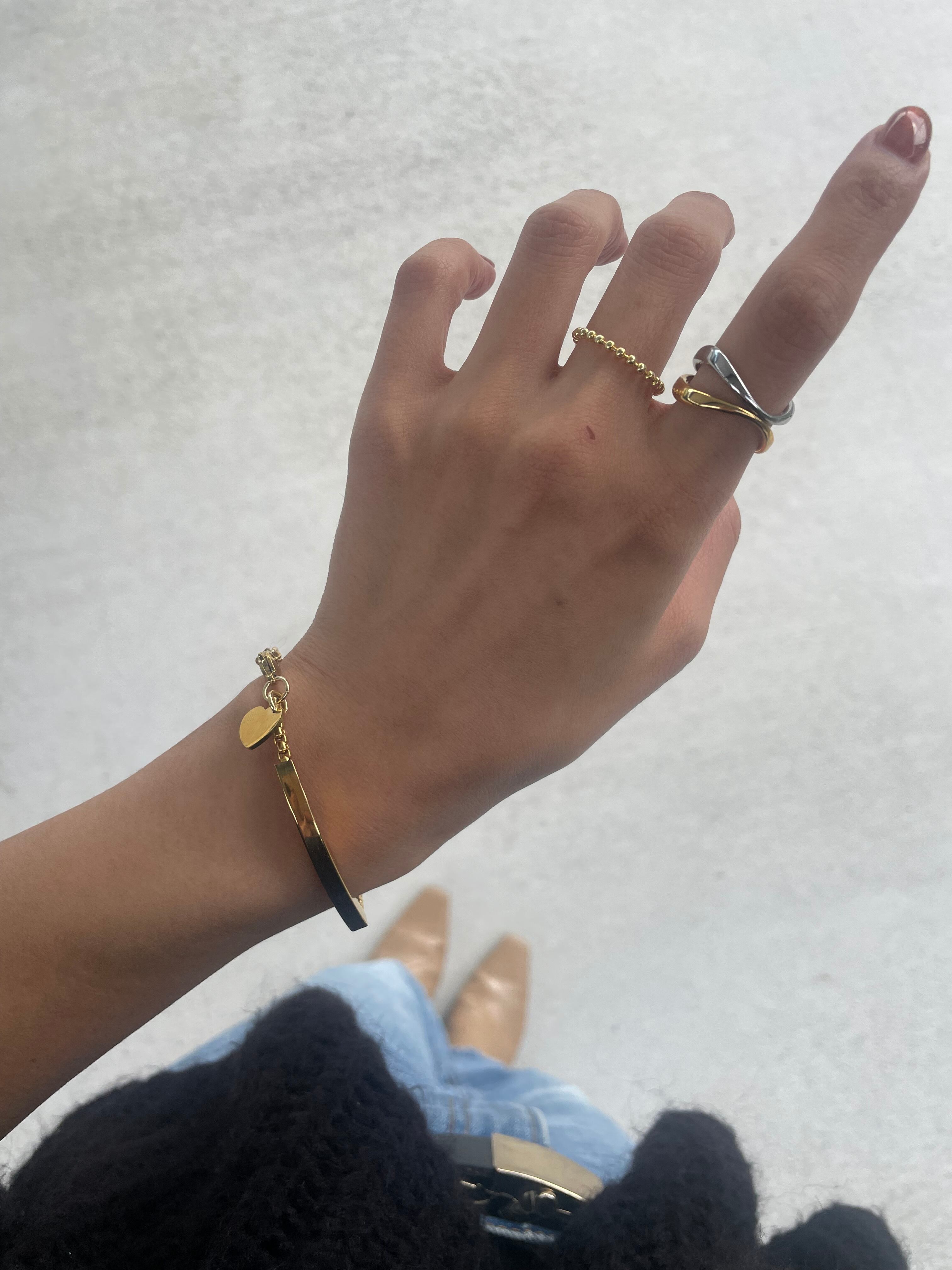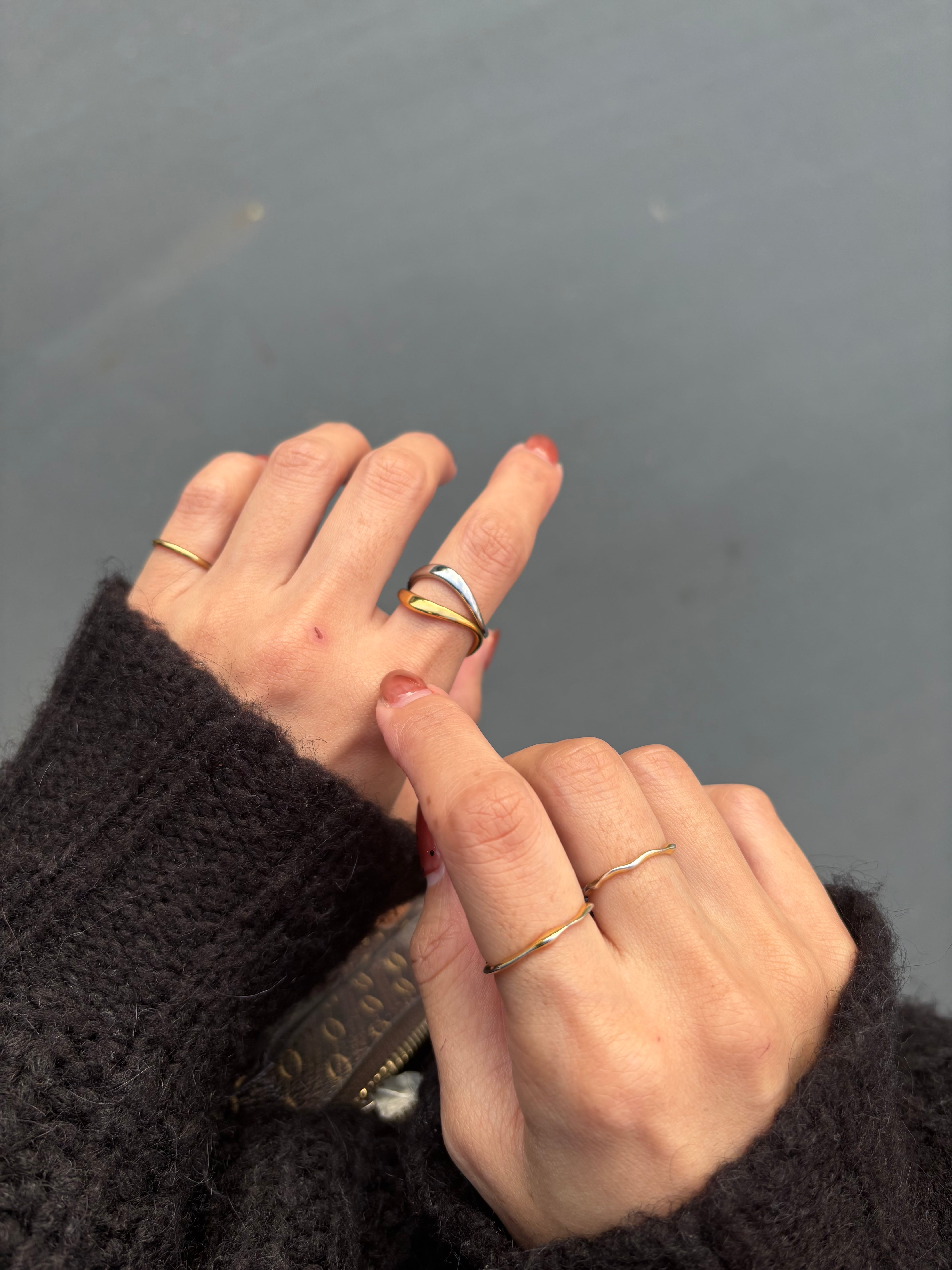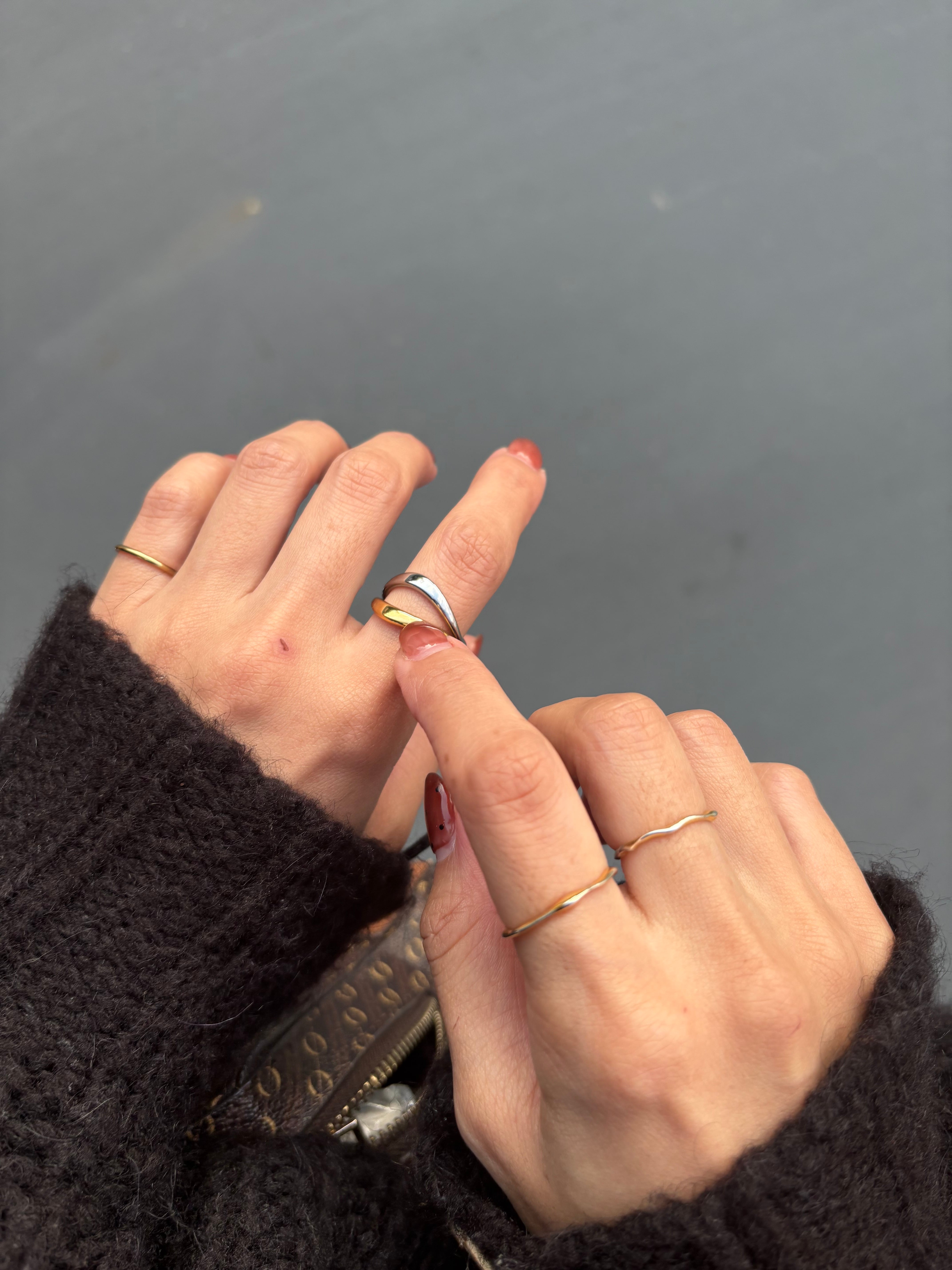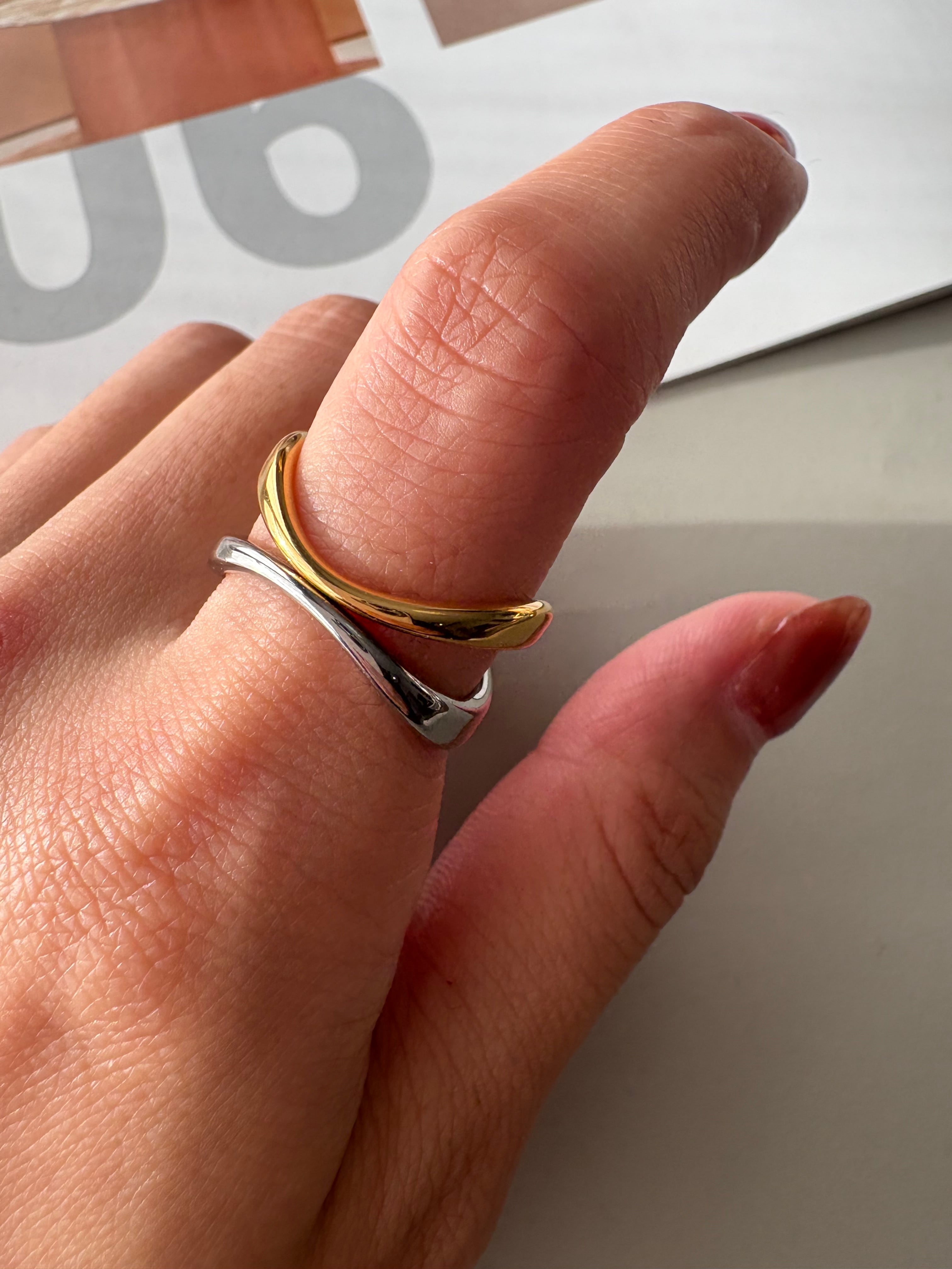 シルバーとゴールド、2色のメタルが重なり合うバイカラーデザイン。