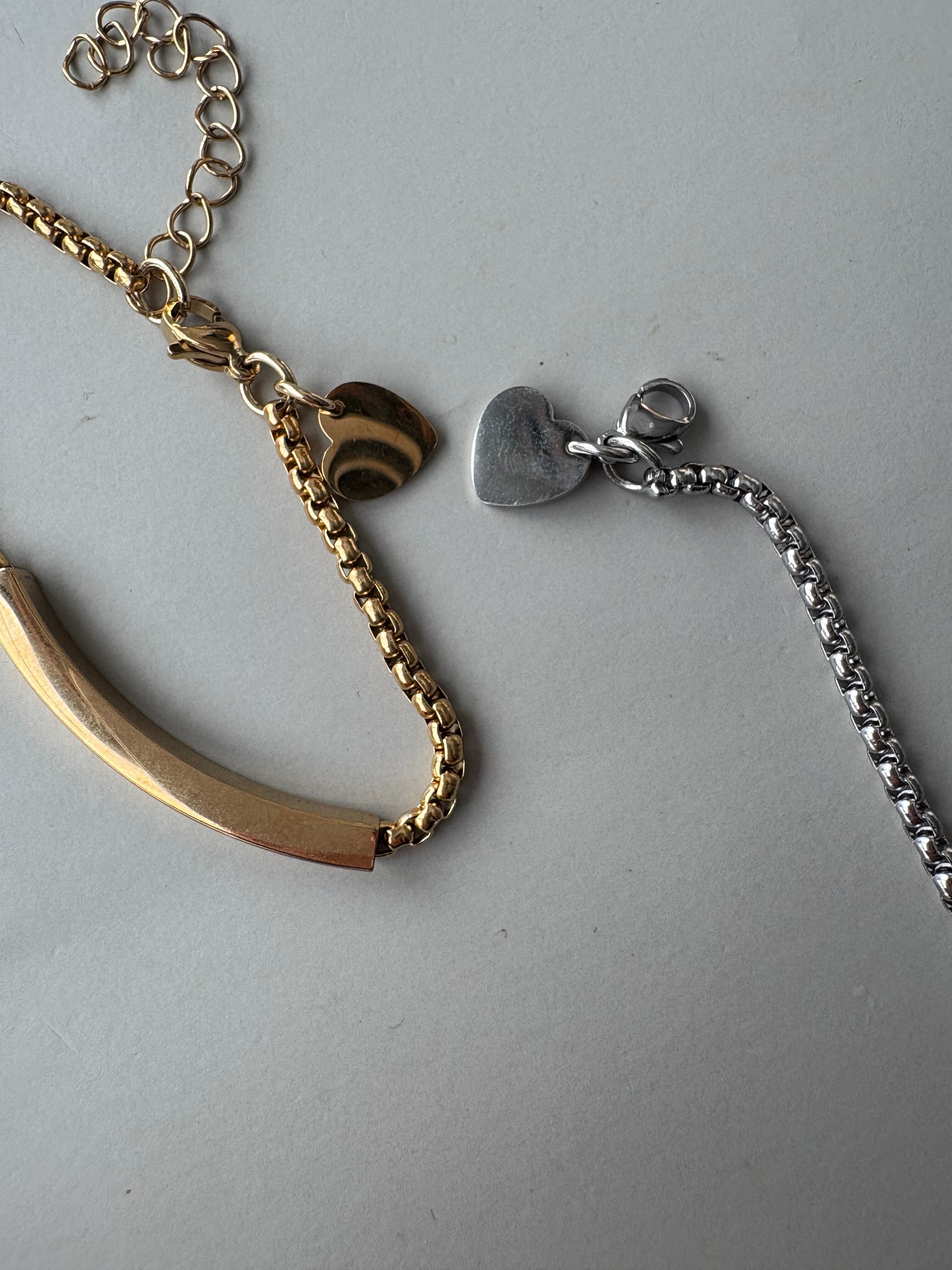 艶やかなプレートとチェーンのコントラストが、上品な抜け感を演出します。