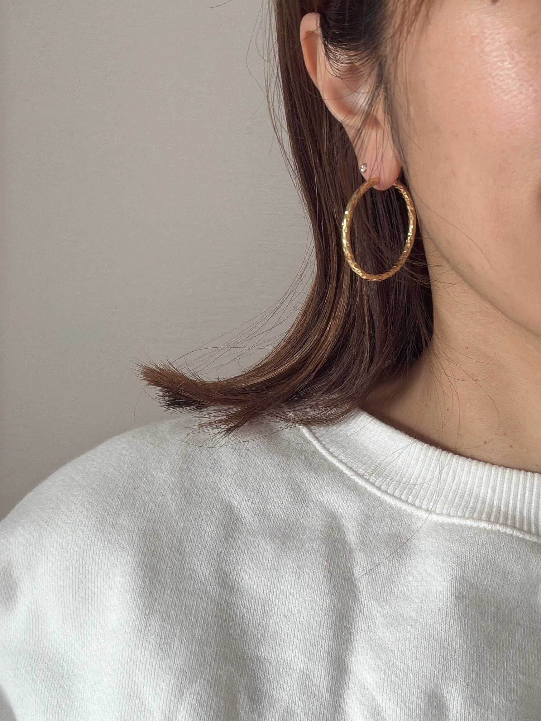 ほどよいボリュームに、光を受けてさりげなく輝くハンマード加工を施したフープピアス。