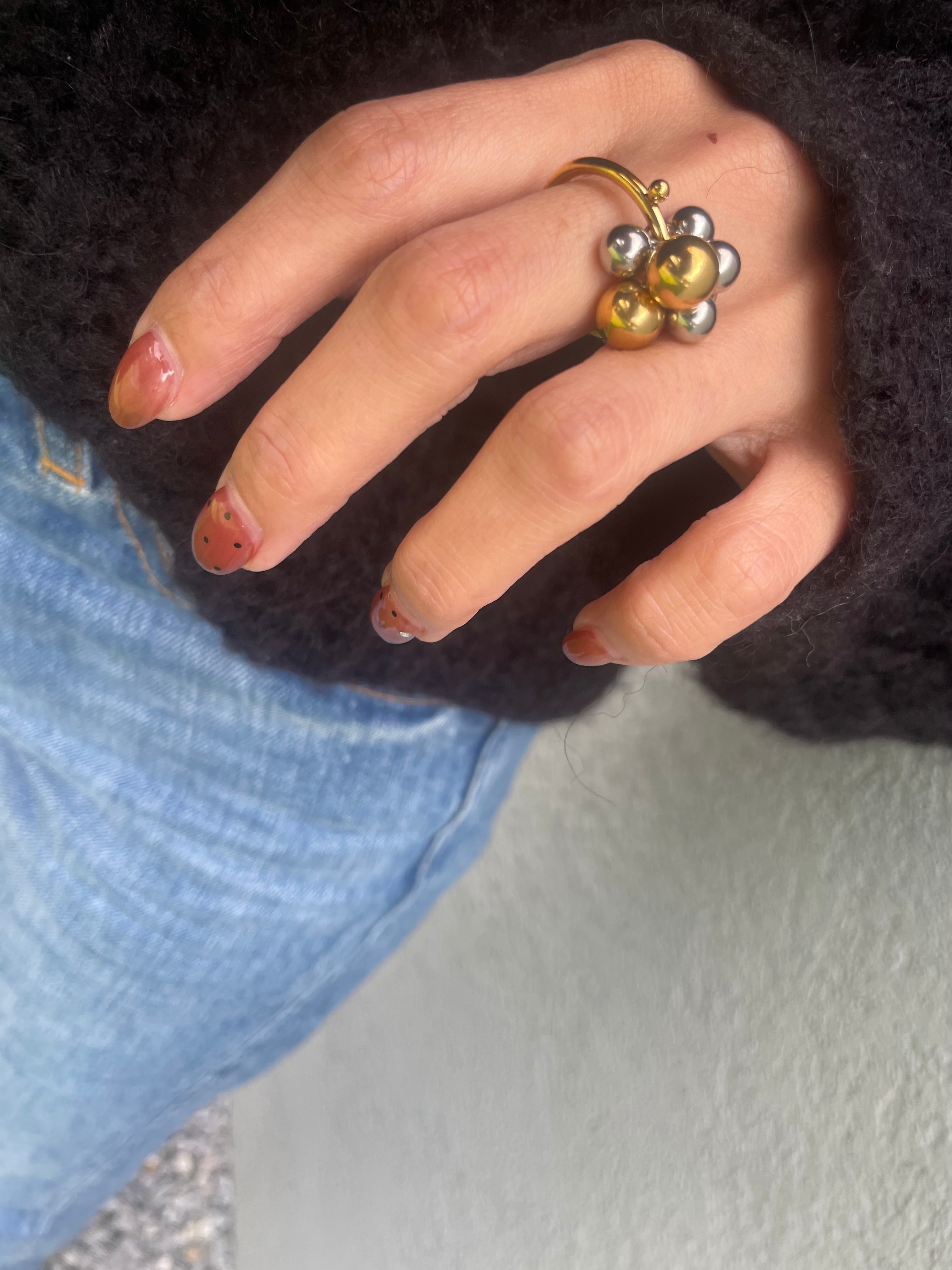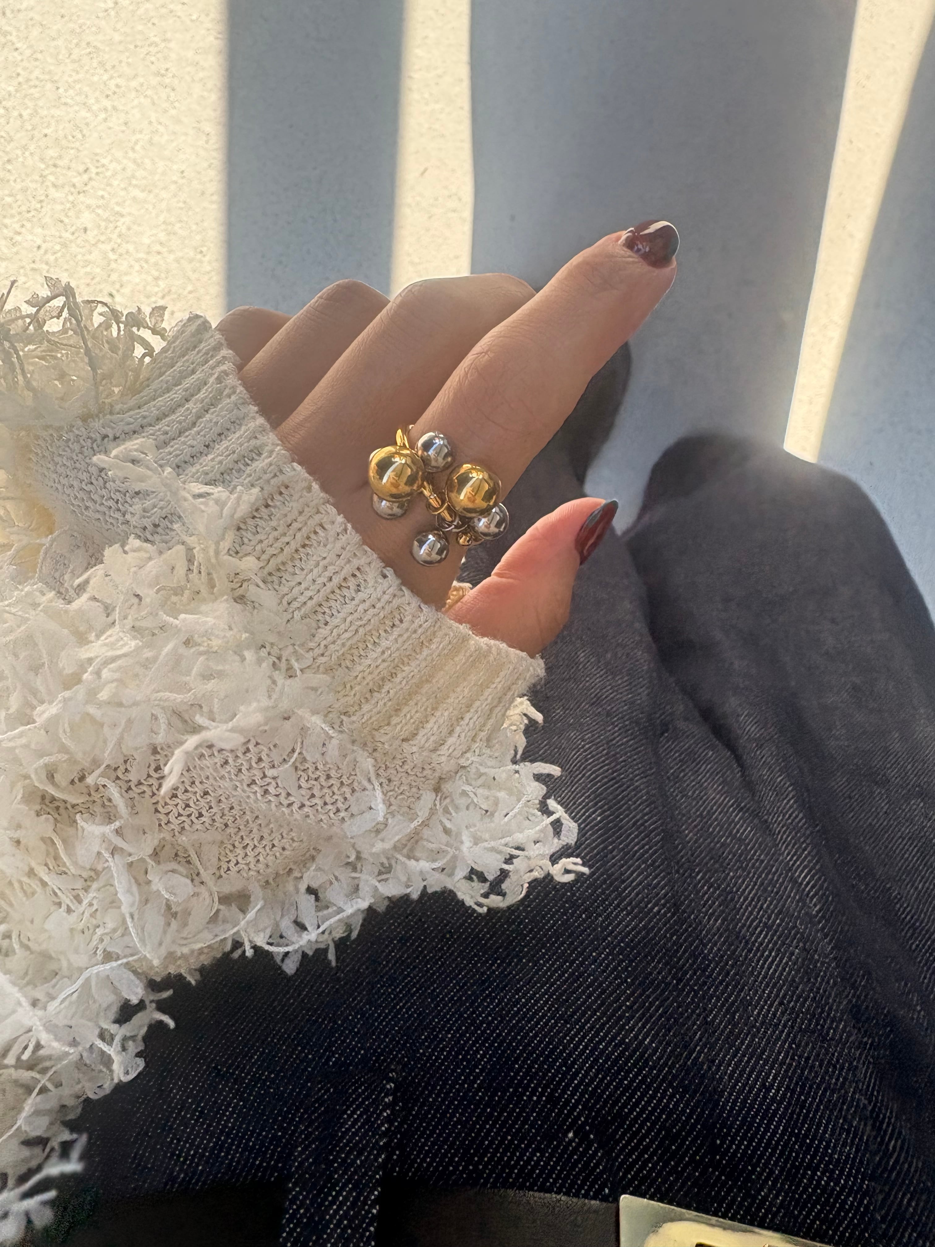 立体的に連なるボールモチーフが指先を彩る、存在感たっぷりのバブルボールリング。
