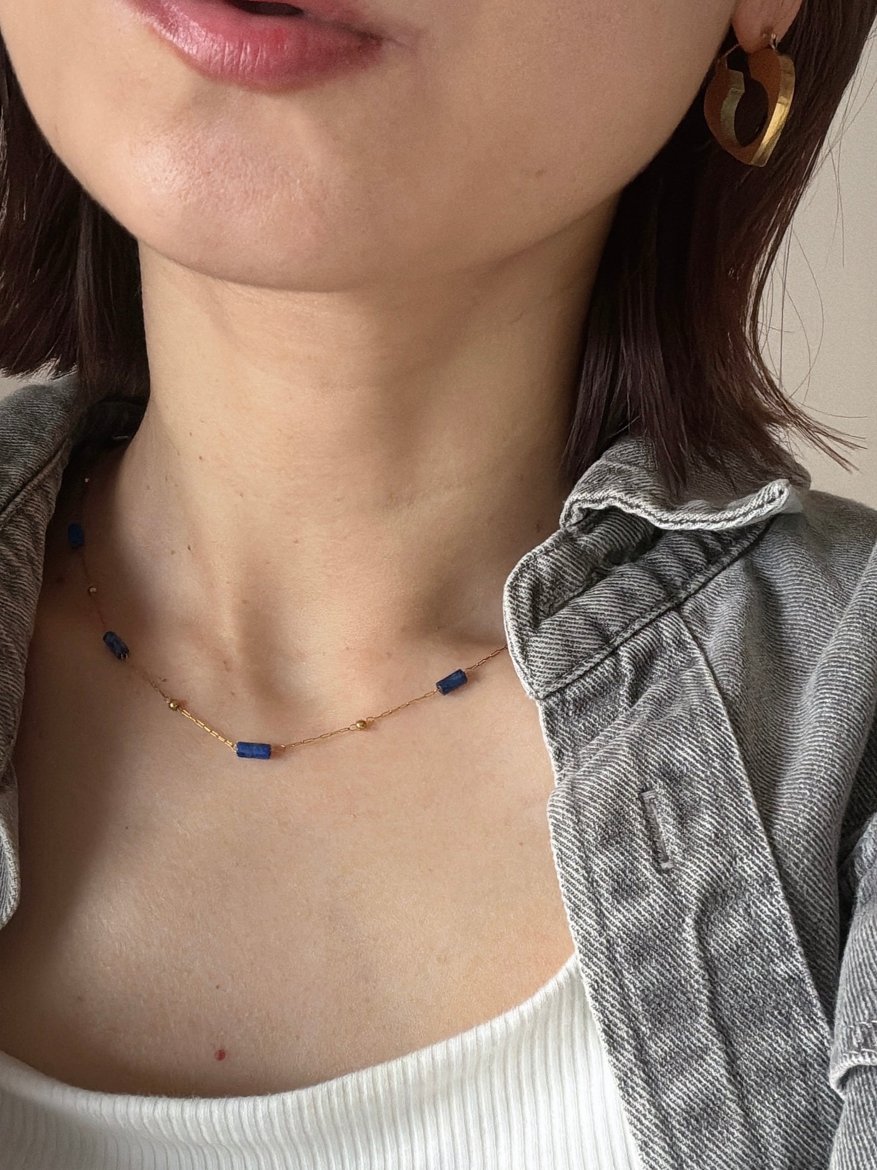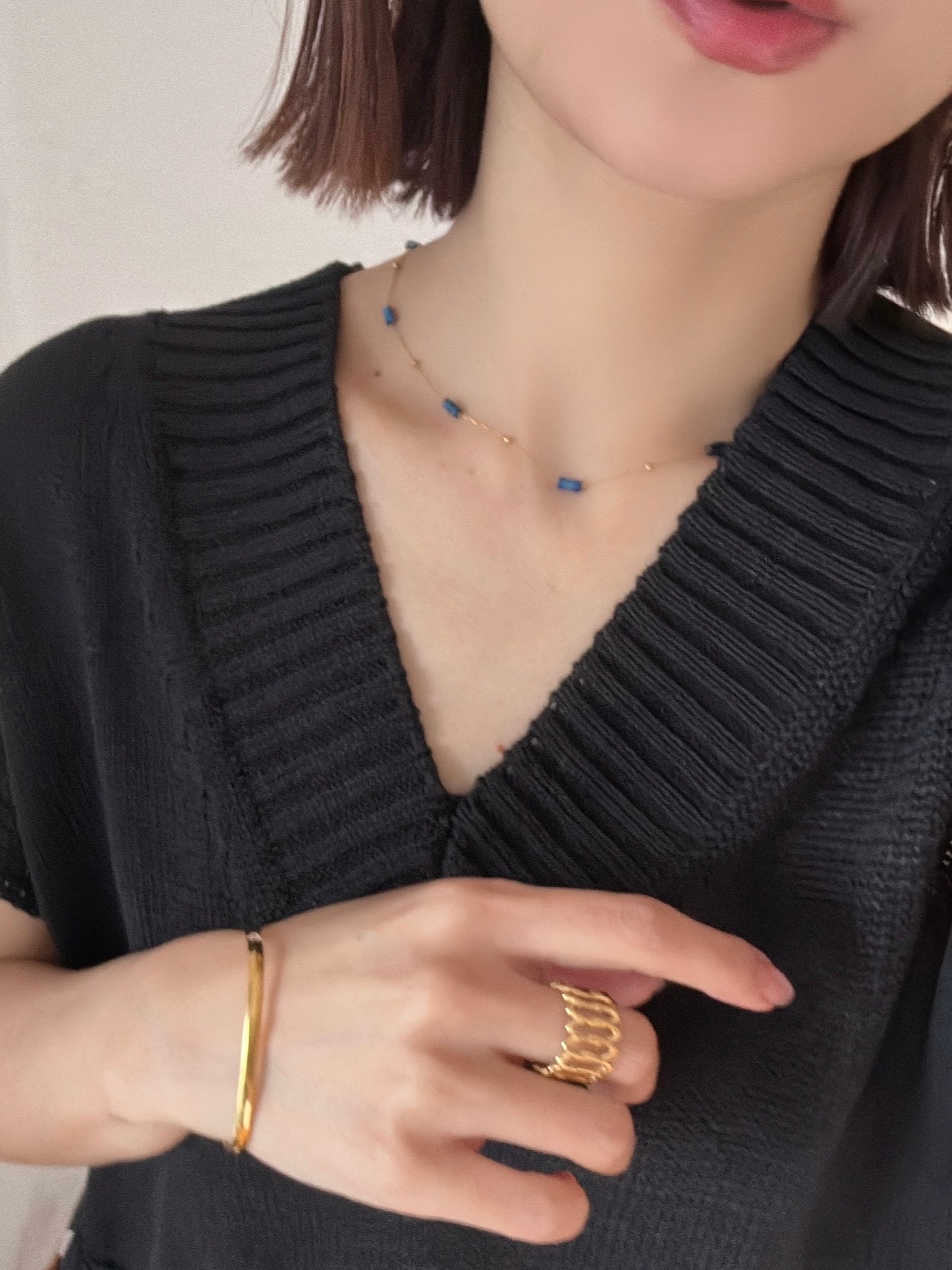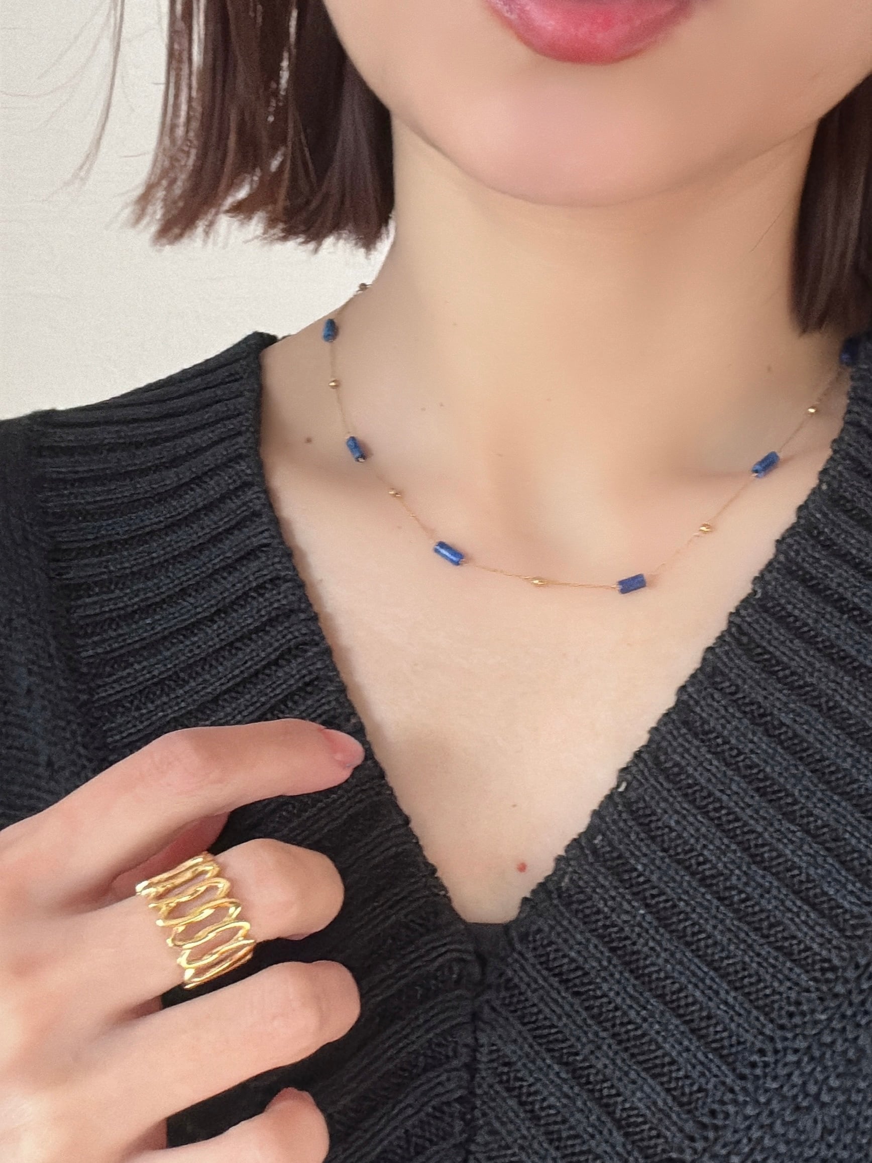 細やかなチェーンの上にランダムに並んだブルービーズが、