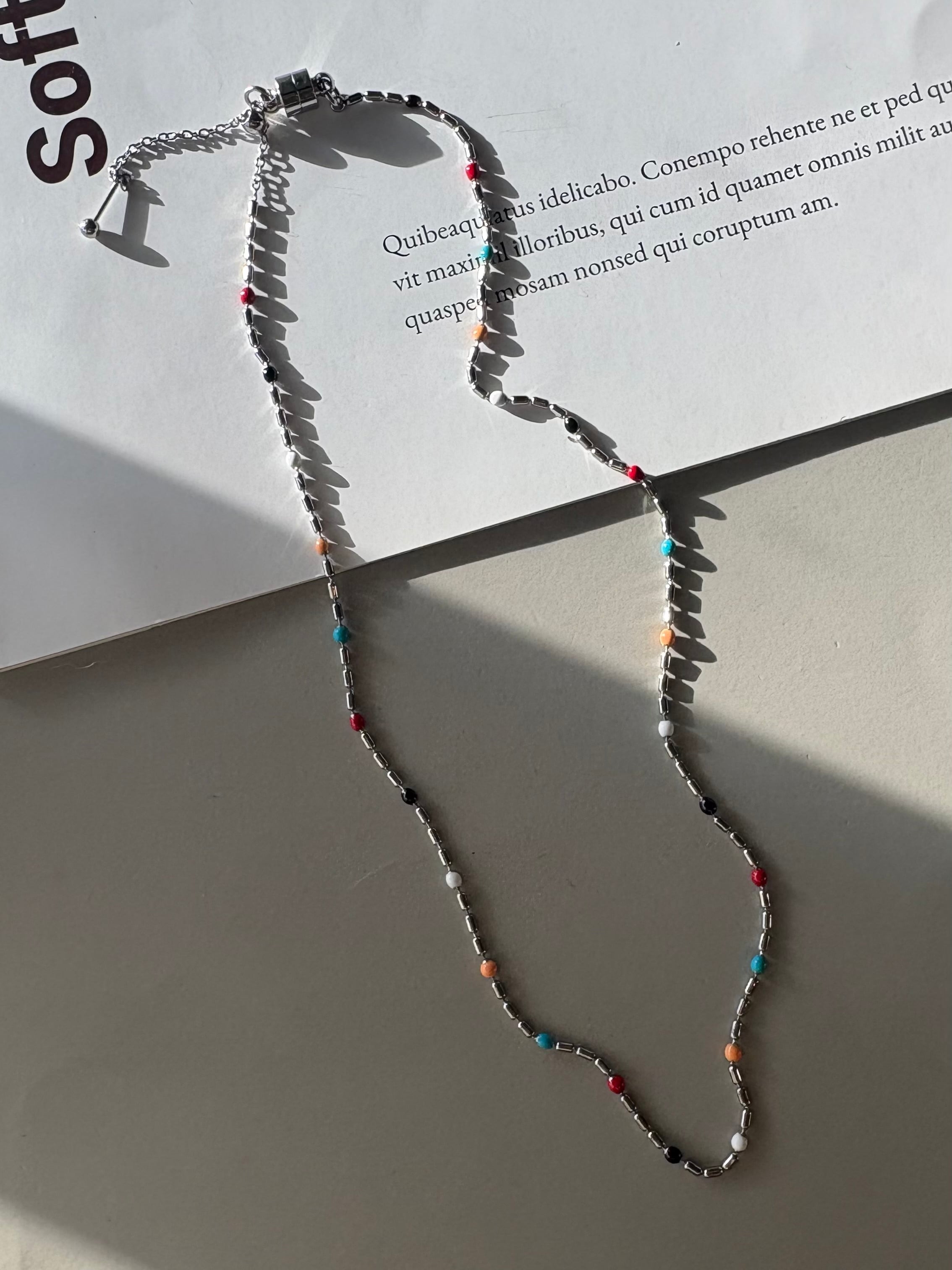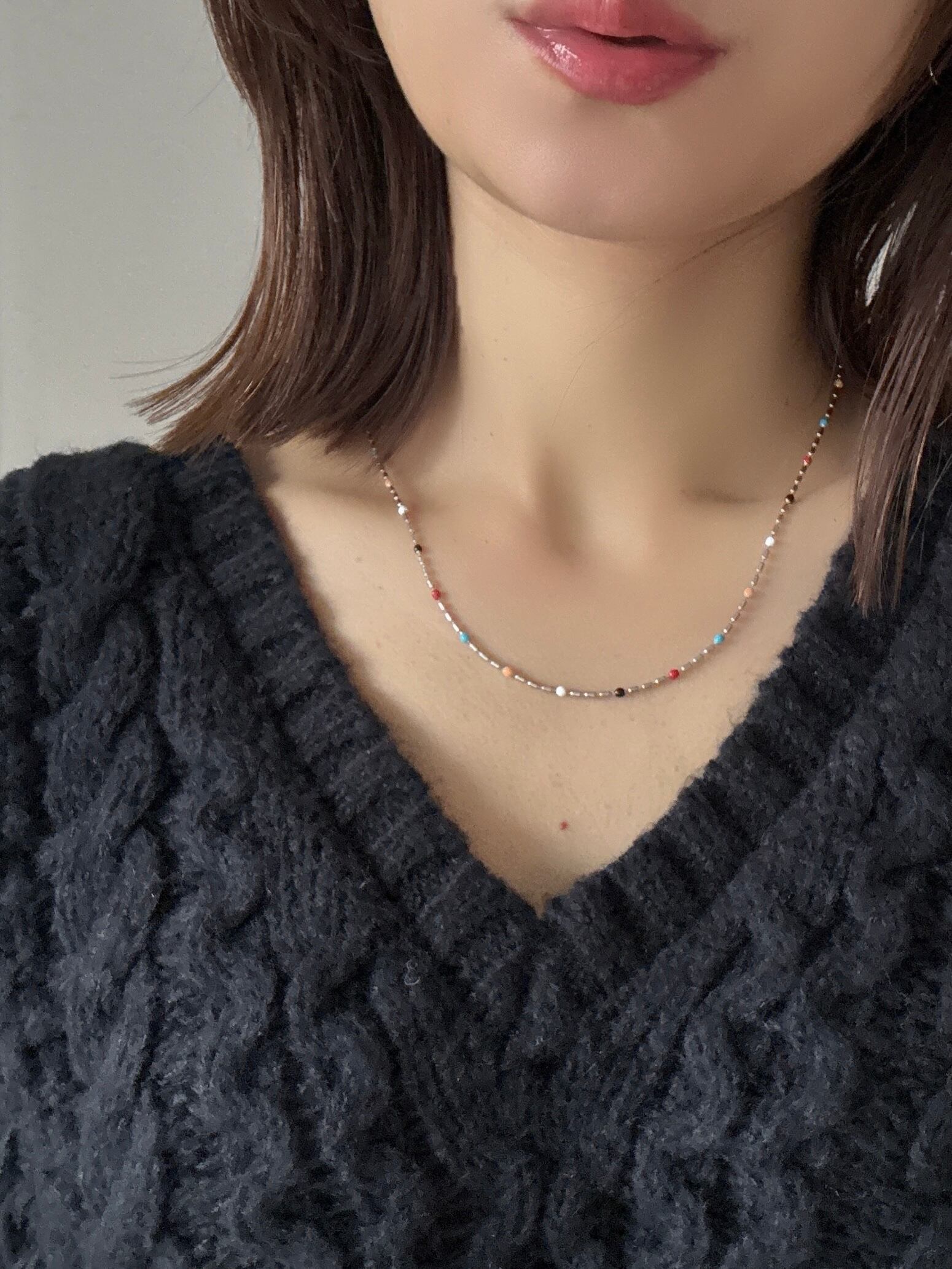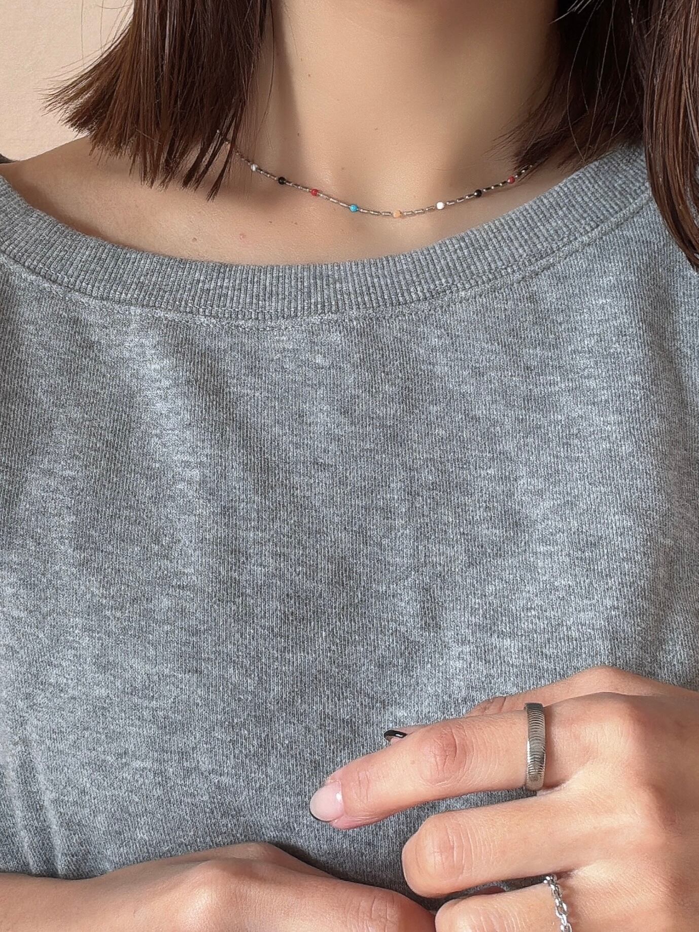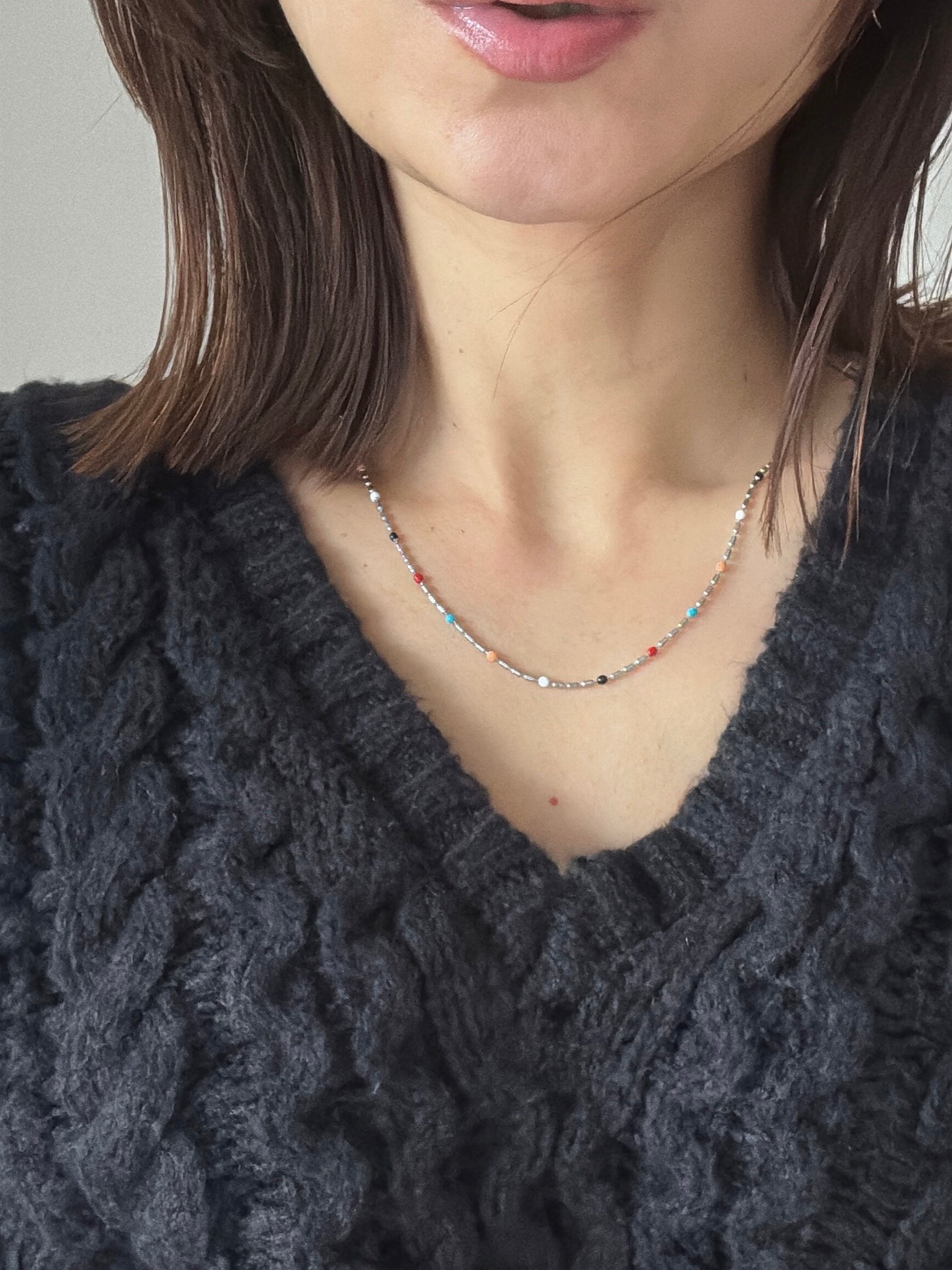 カラフルなビーズが首元にさりげない遊び心を添え、