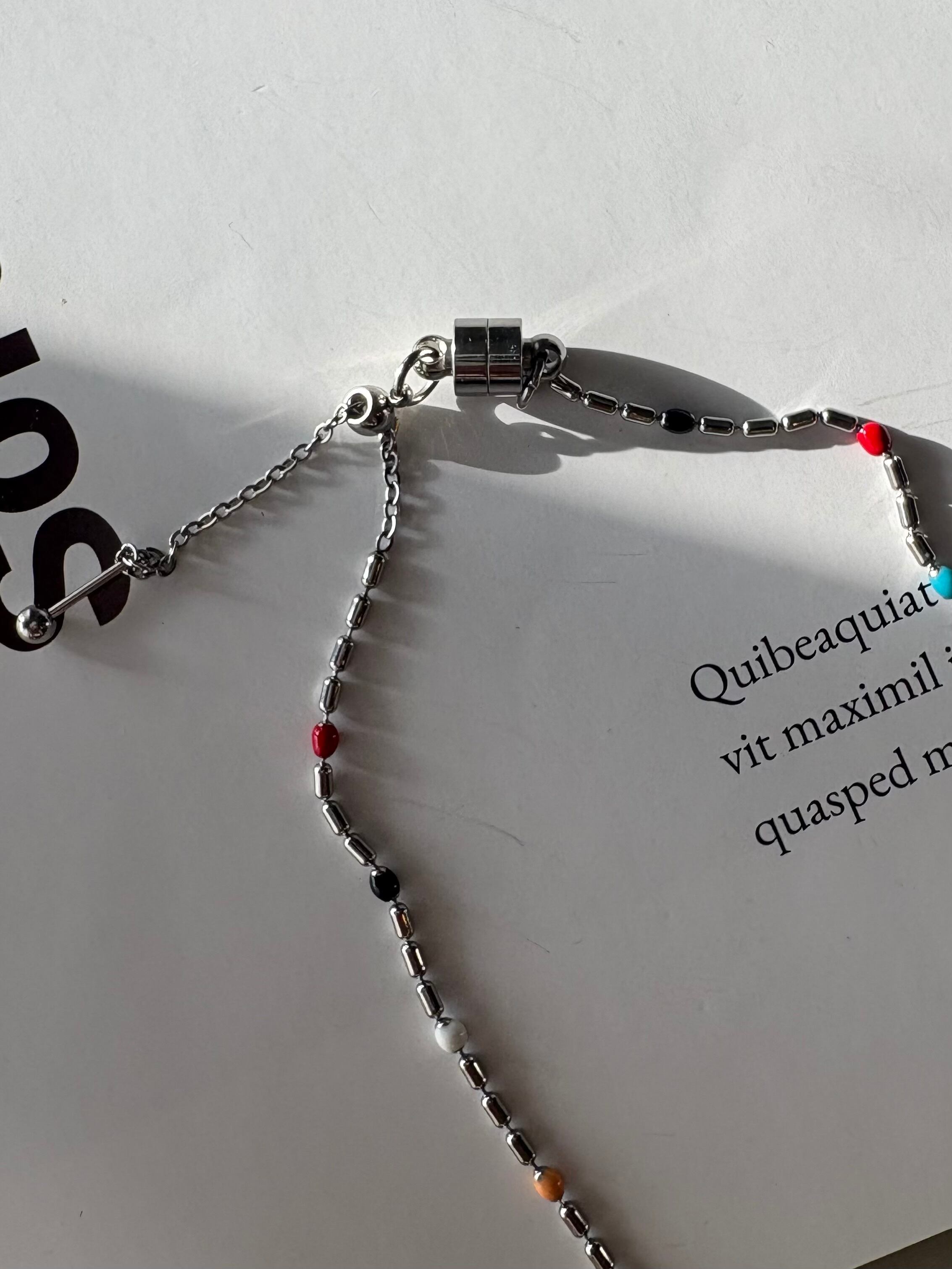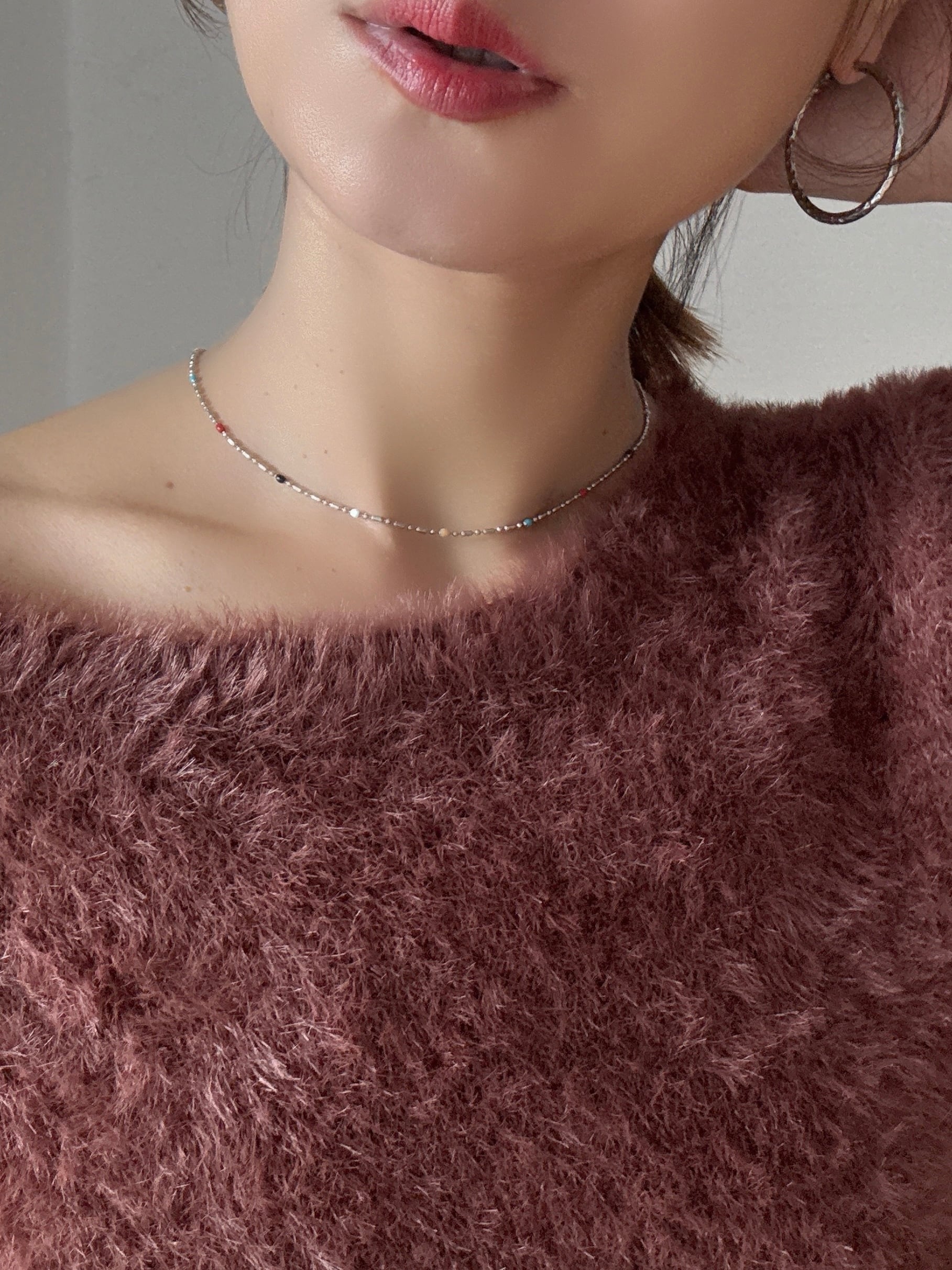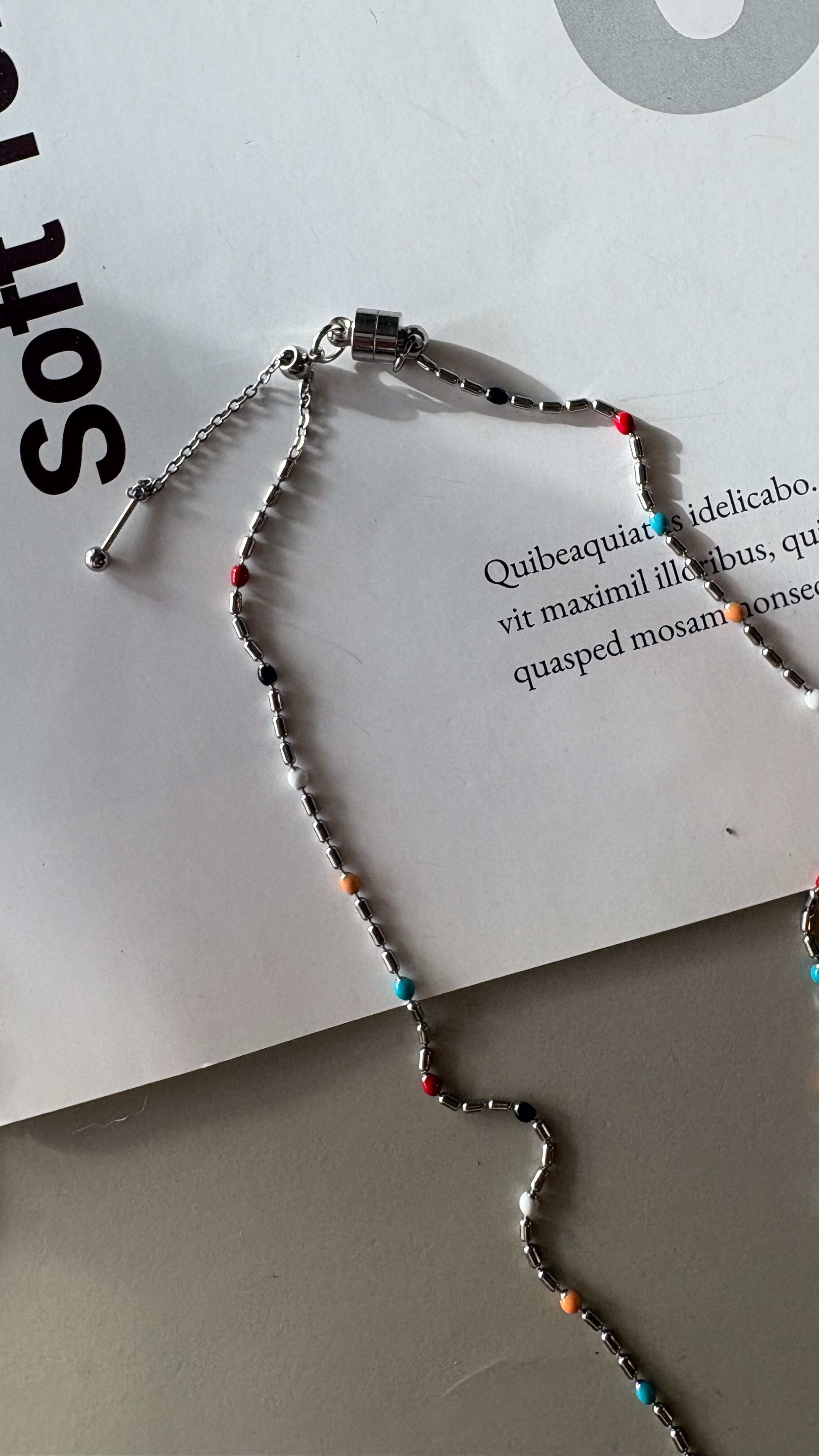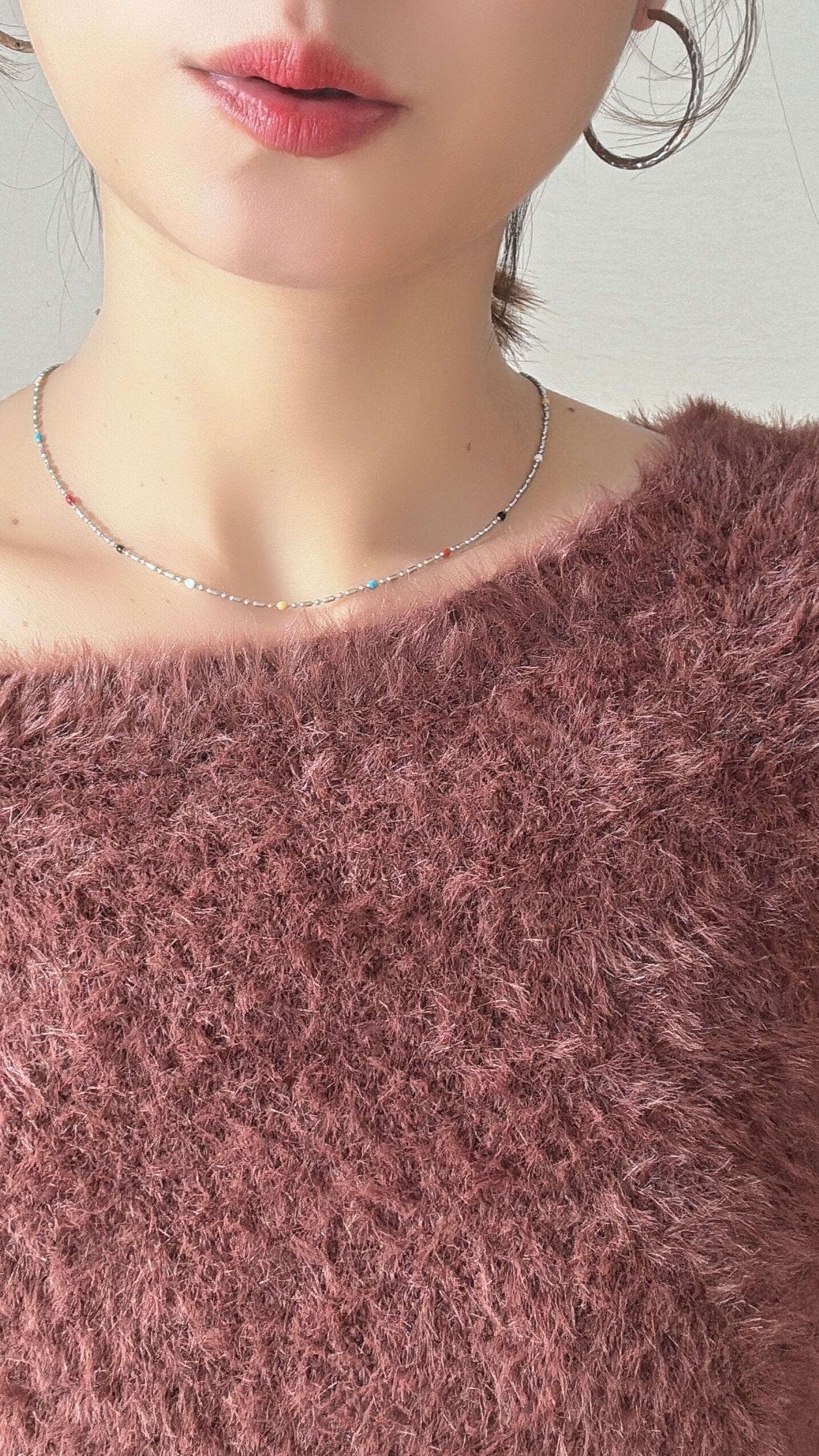 カラフルなビーズが首元にさりげない遊び心を添え、