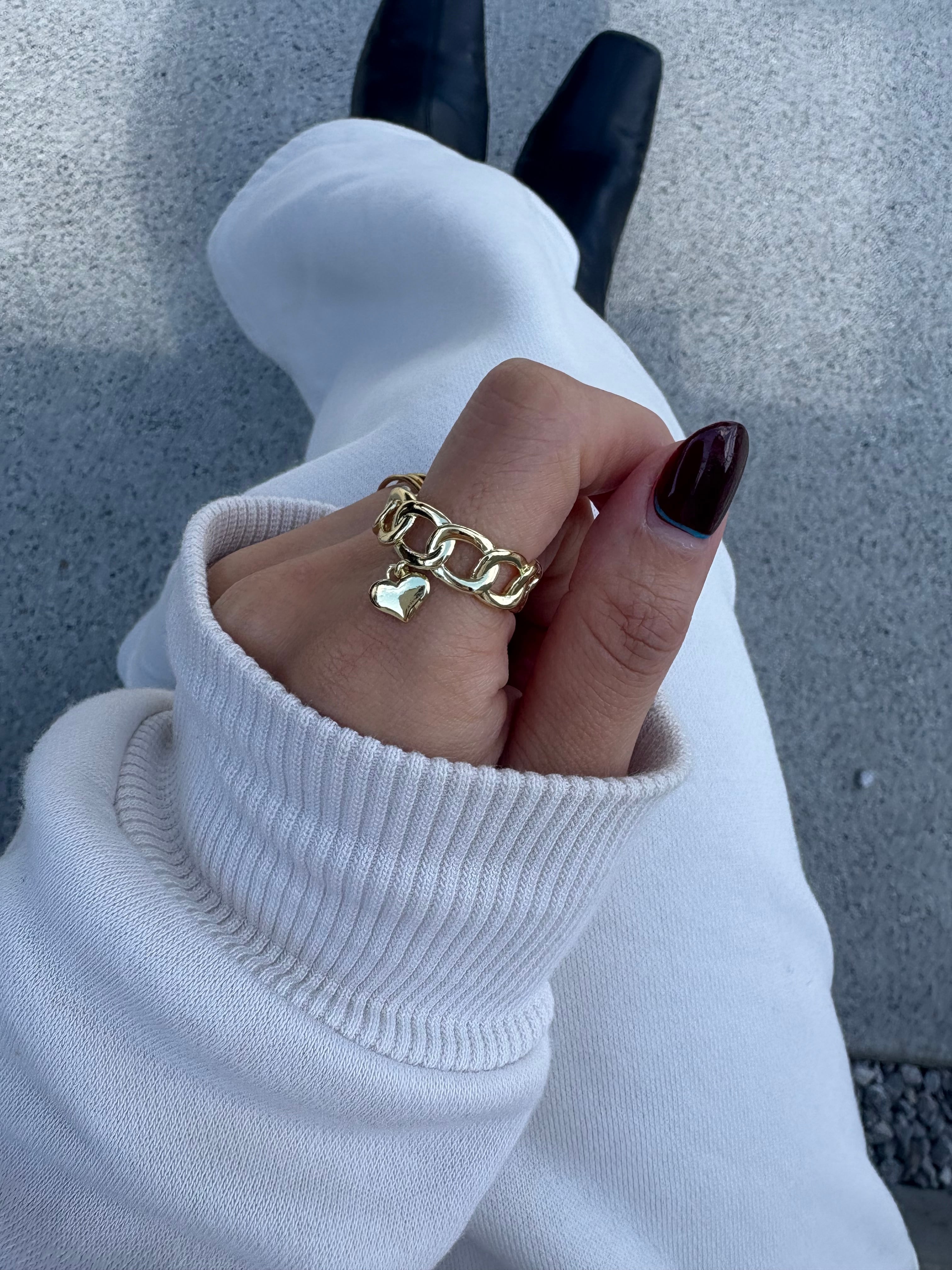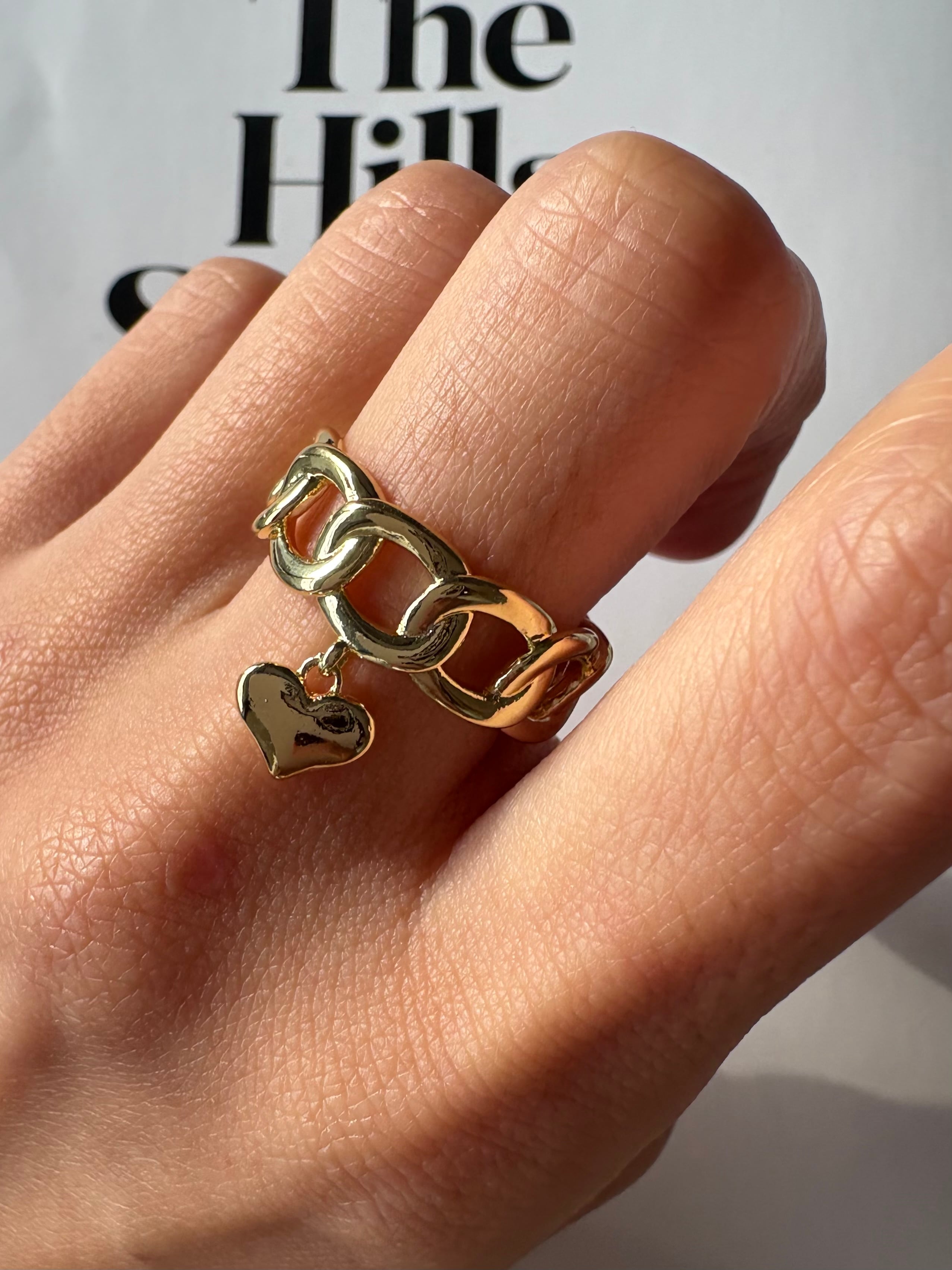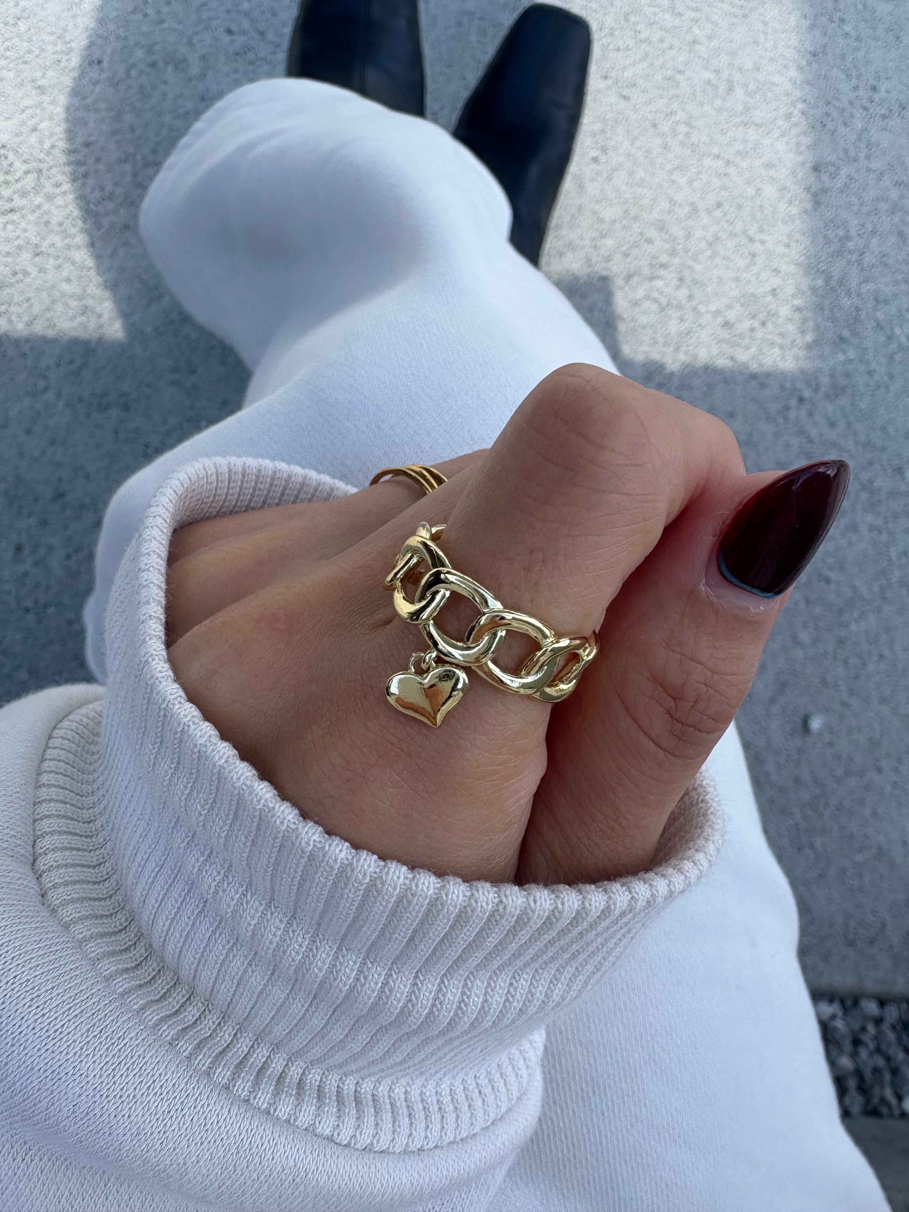 動くたびにハートチャームがさりげなく揺れる、遊び心を添えたオープンリング。