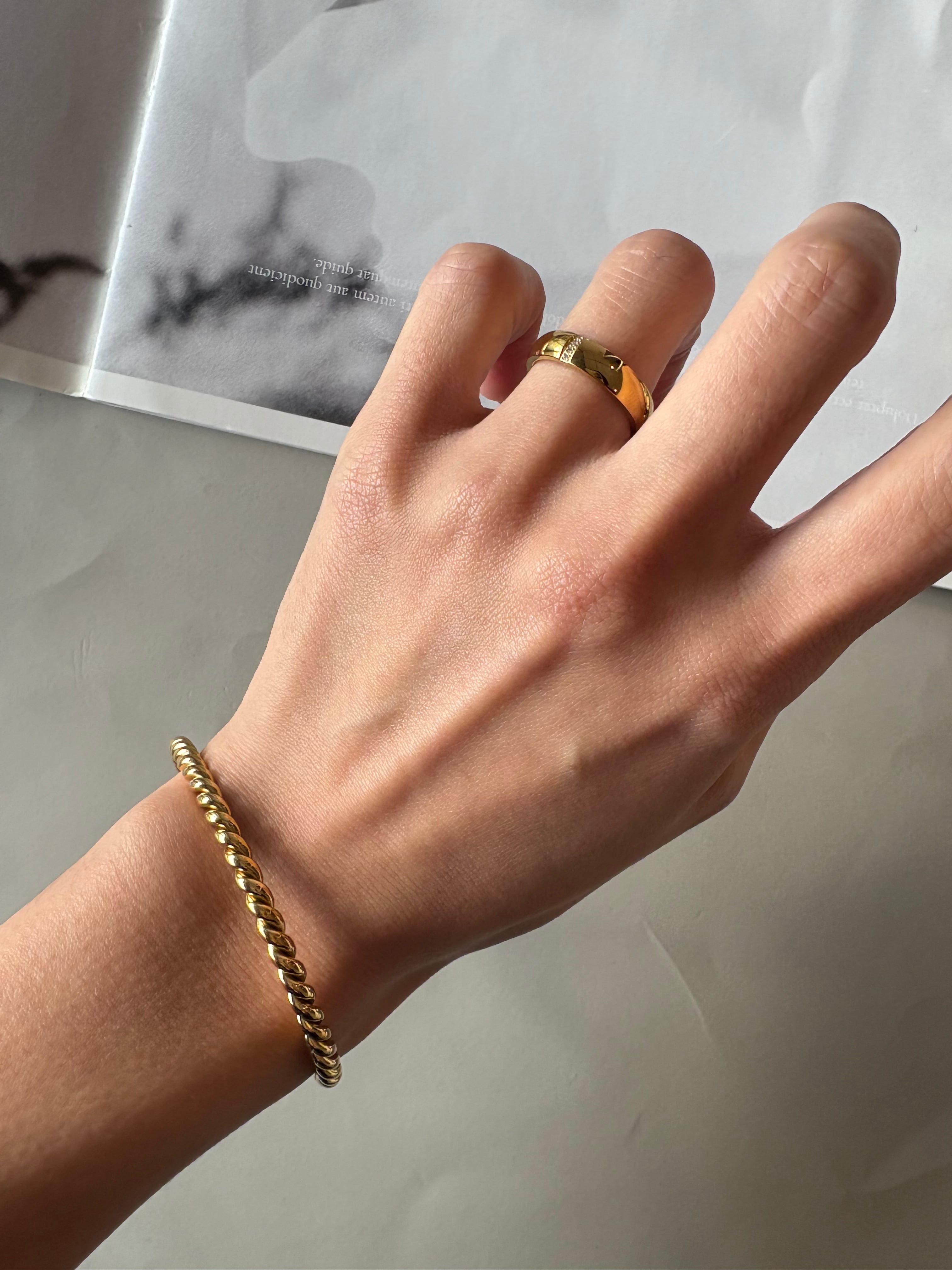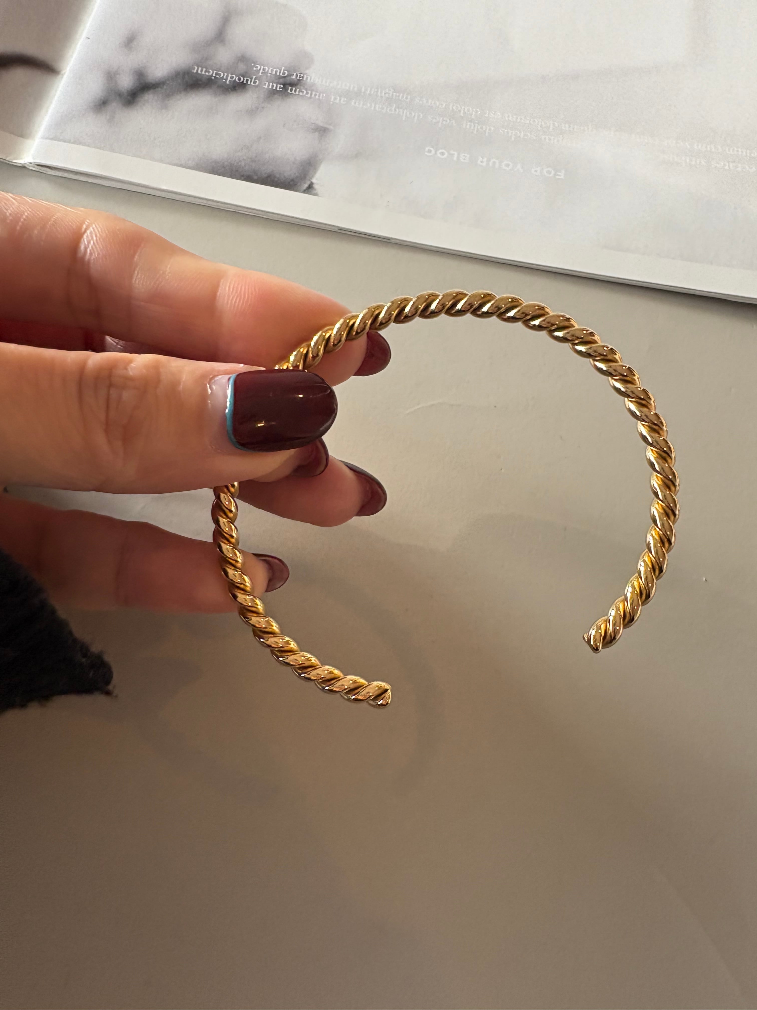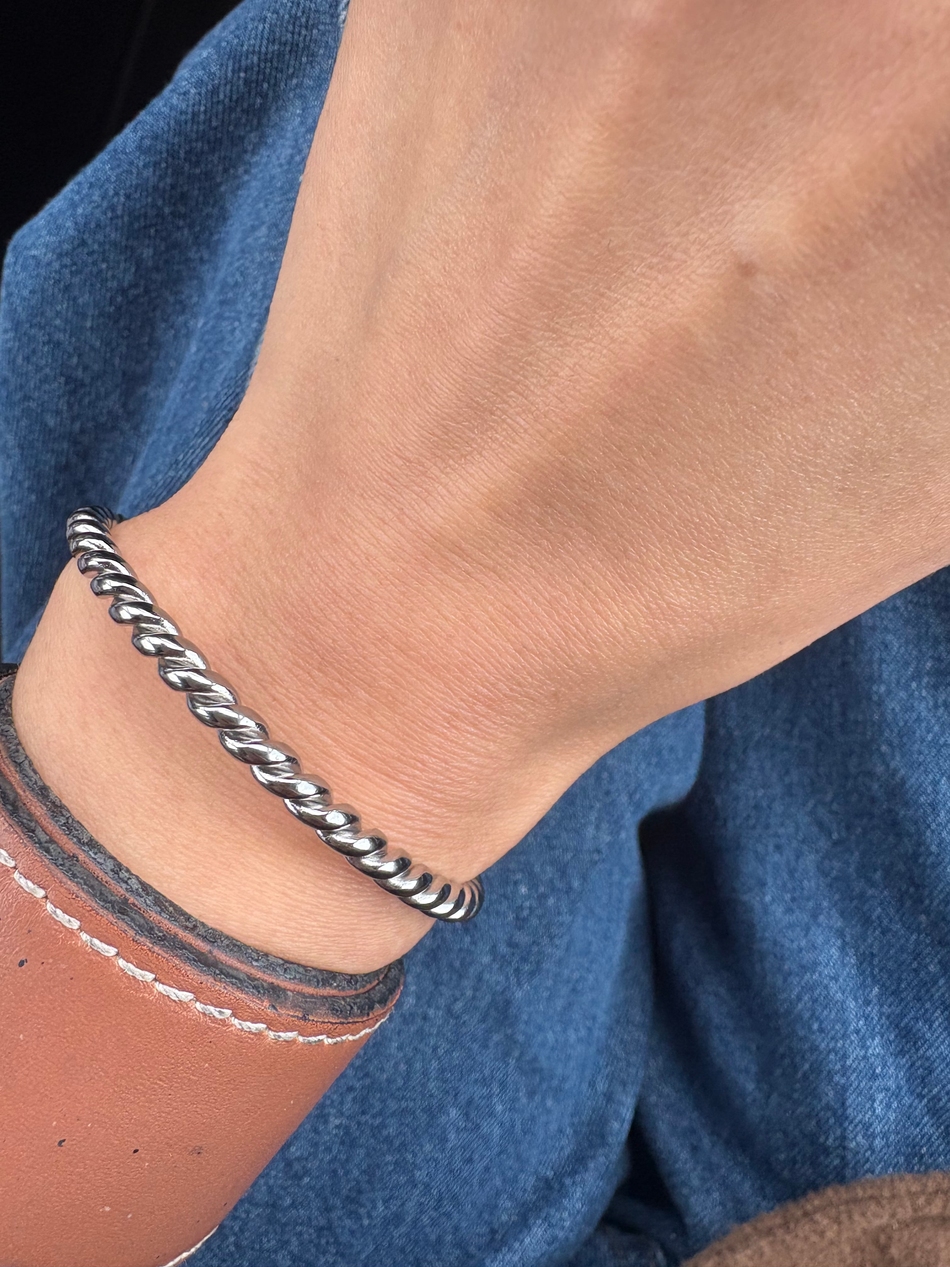 ひねりを効かせたツイストデザインが、手元にほどよい存在感を添えるバングル。