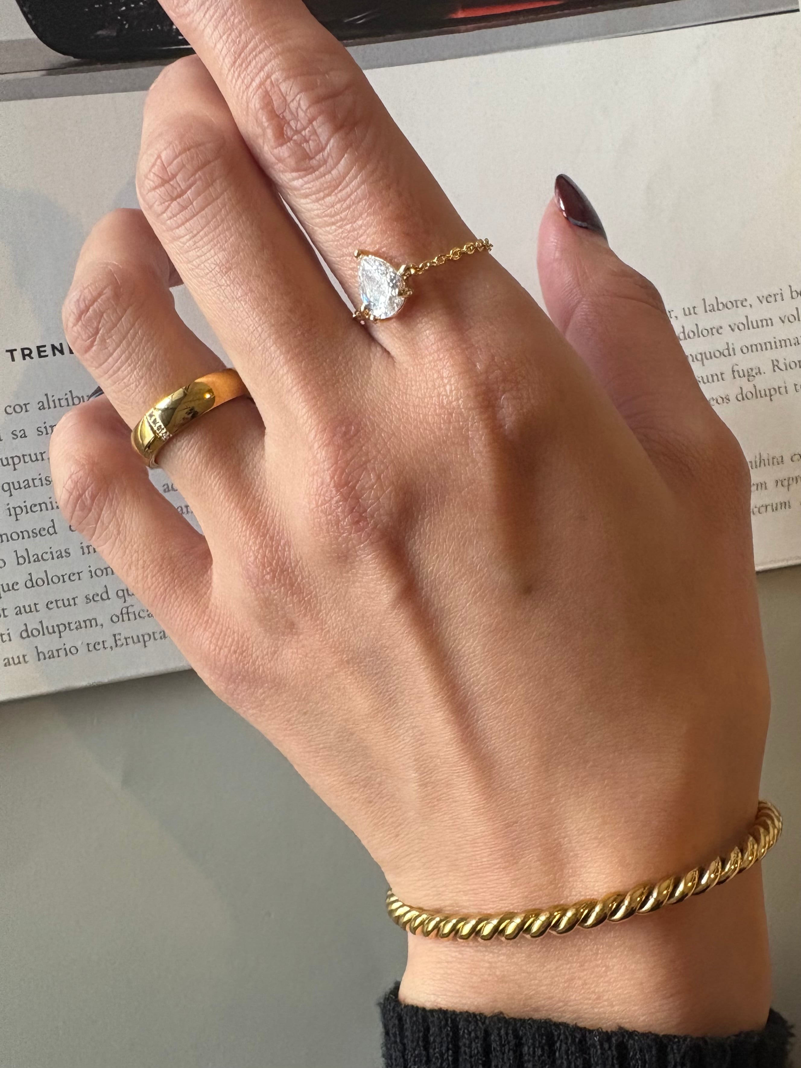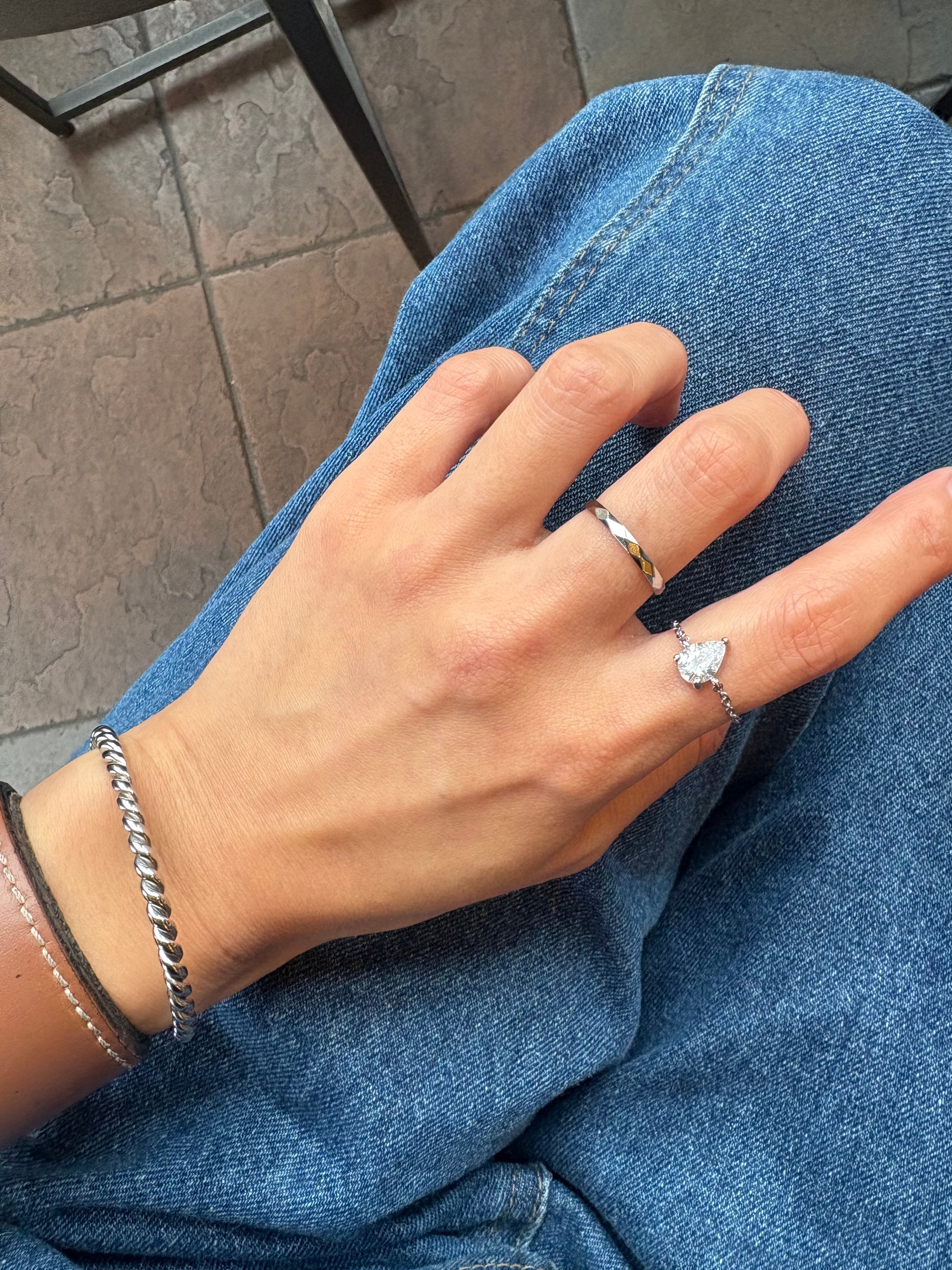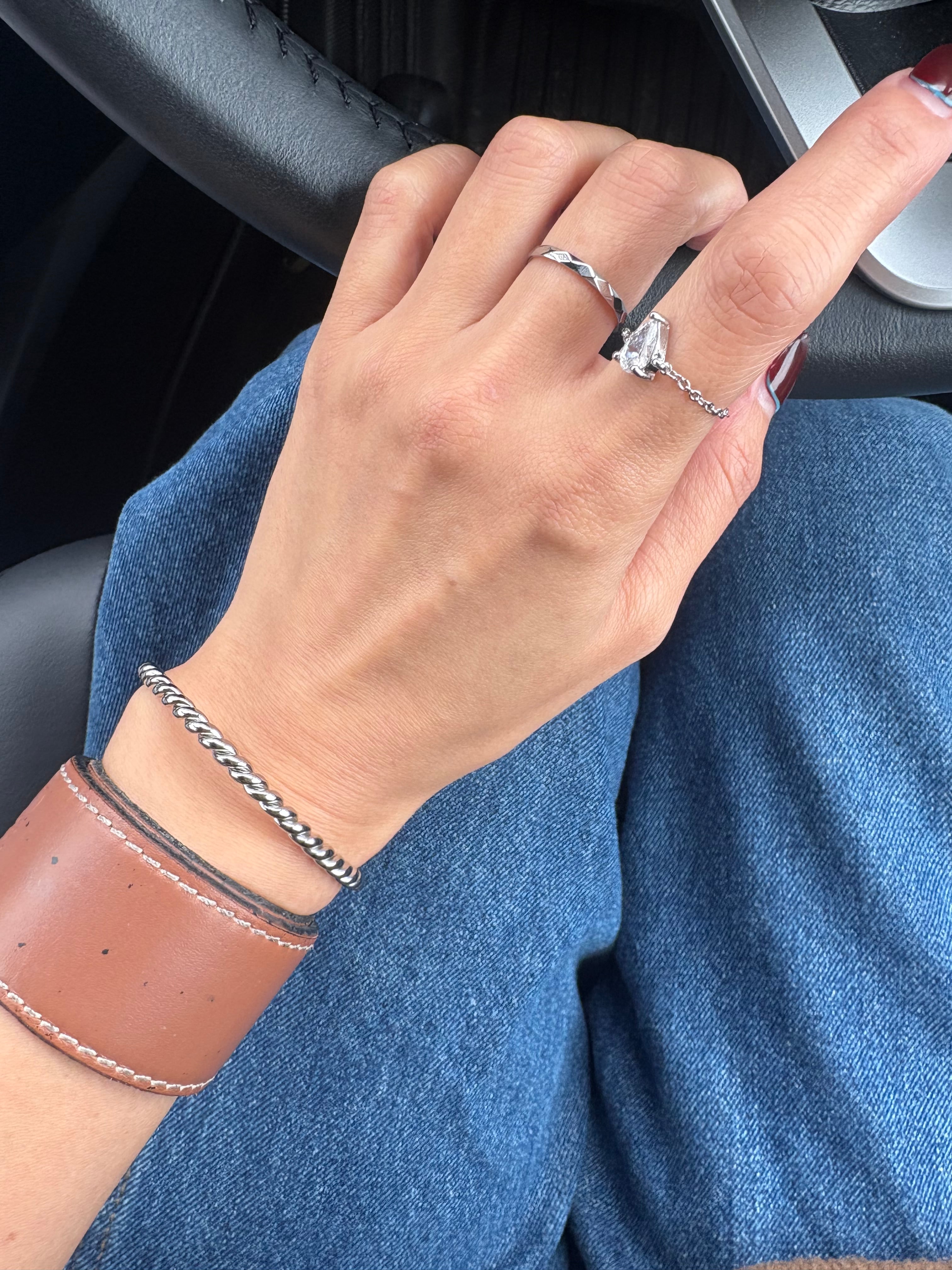 ひねりを効かせたツイストデザインが、手元にほどよい存在感を添えるバングル。