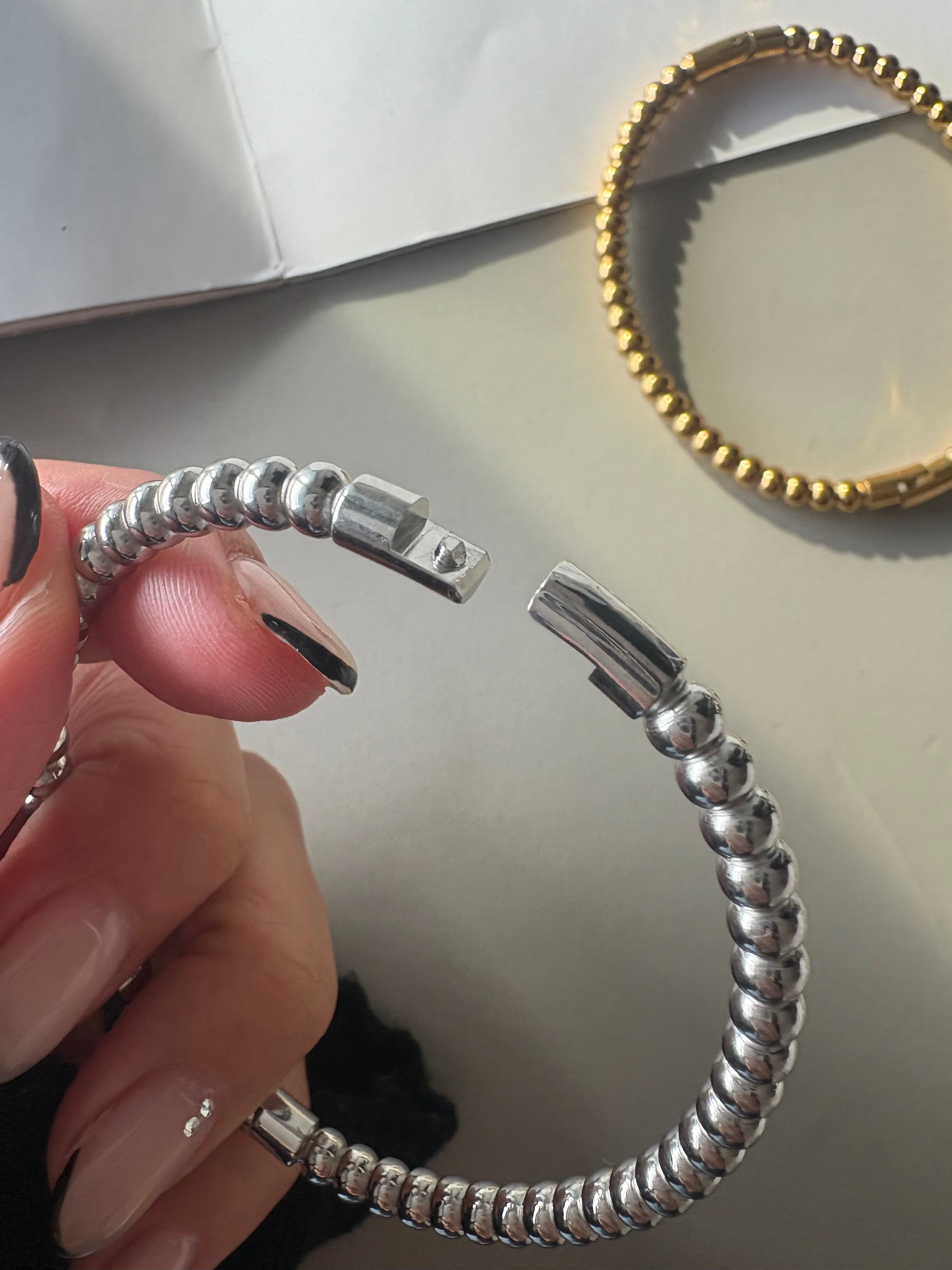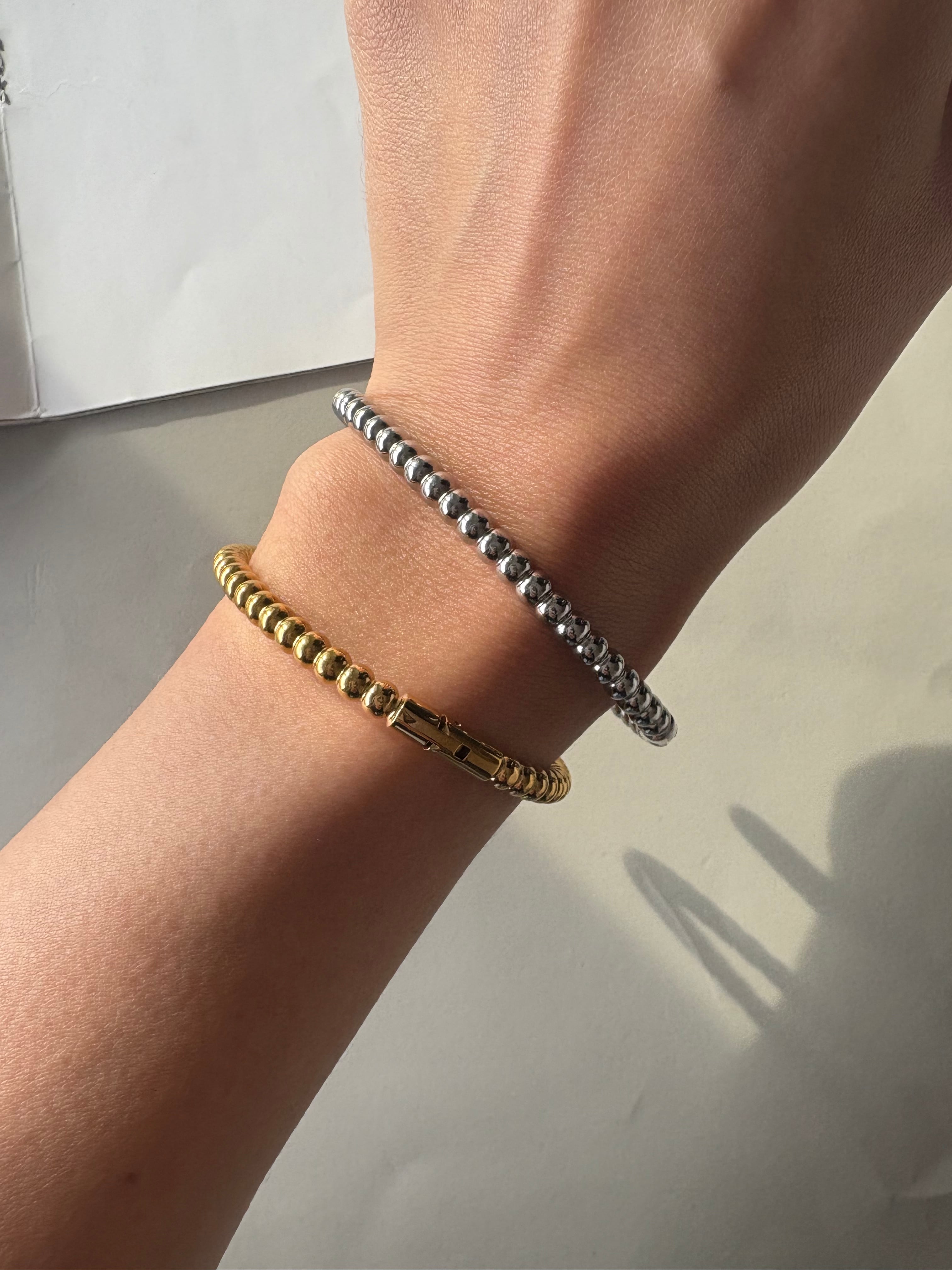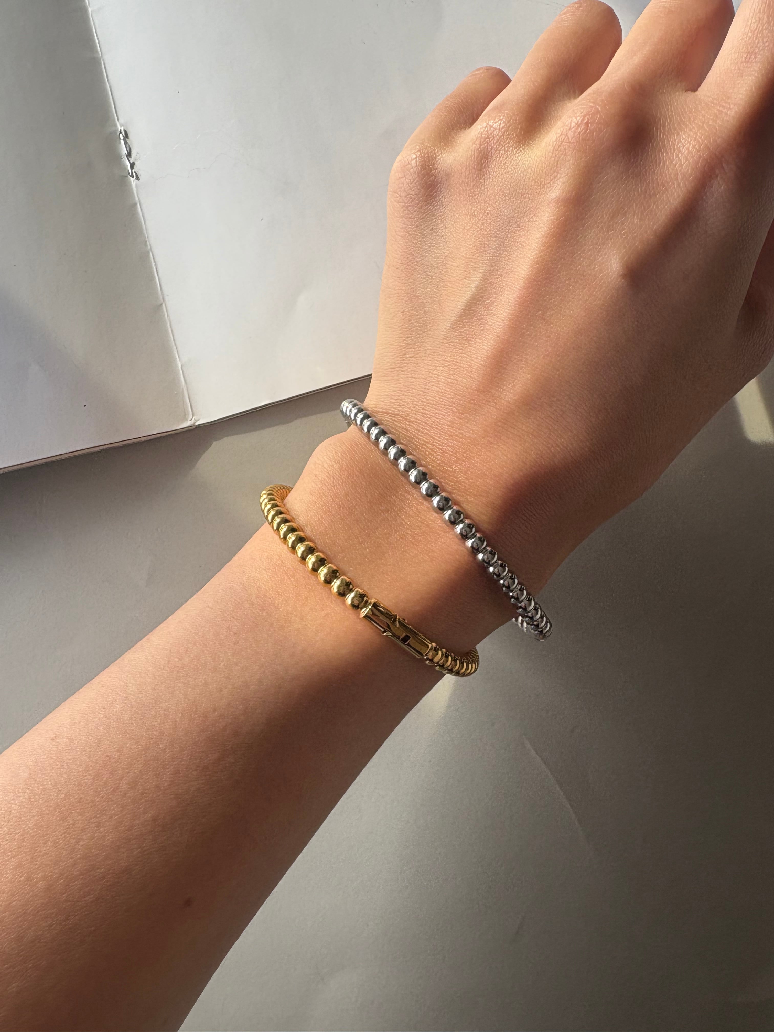 一本使いはもちろん、時計やリングとのレイヤードも楽しめる万能ブレスレットです。