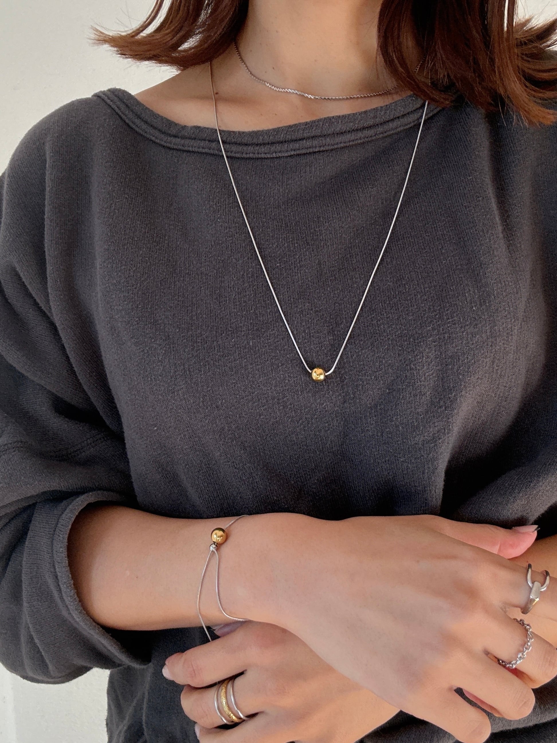 「バイカラーボールチャームネックレス」 と合わせた着用もおすすめ。