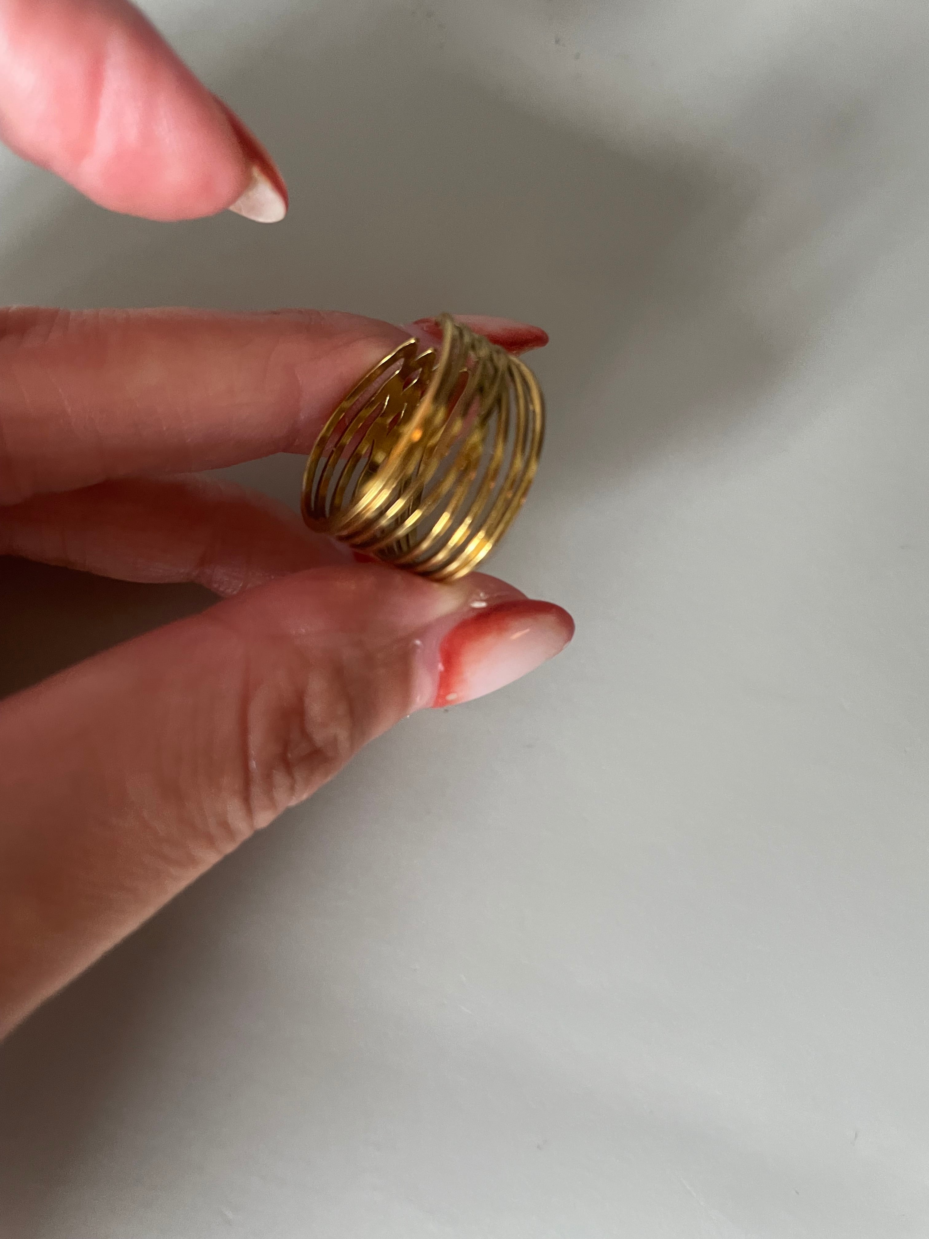 細く繊細なラインが何層にも重なり、まるで重ねづけしているかのような立体感を演出するリング。