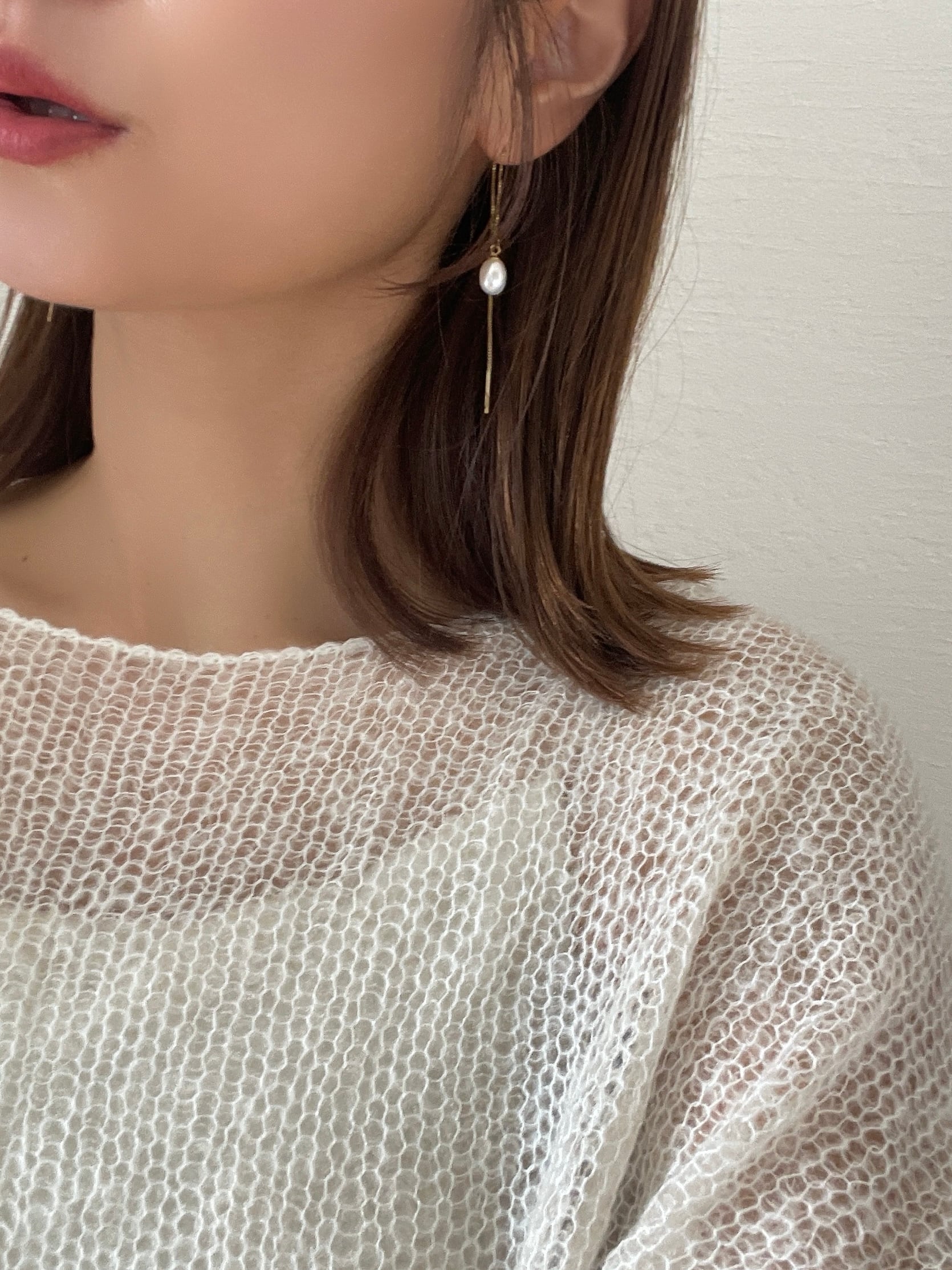 動くたびに軽やかに揺れるチェーンとパールのコンビが、横顔に女性らしい華やかさを添えてくれます。