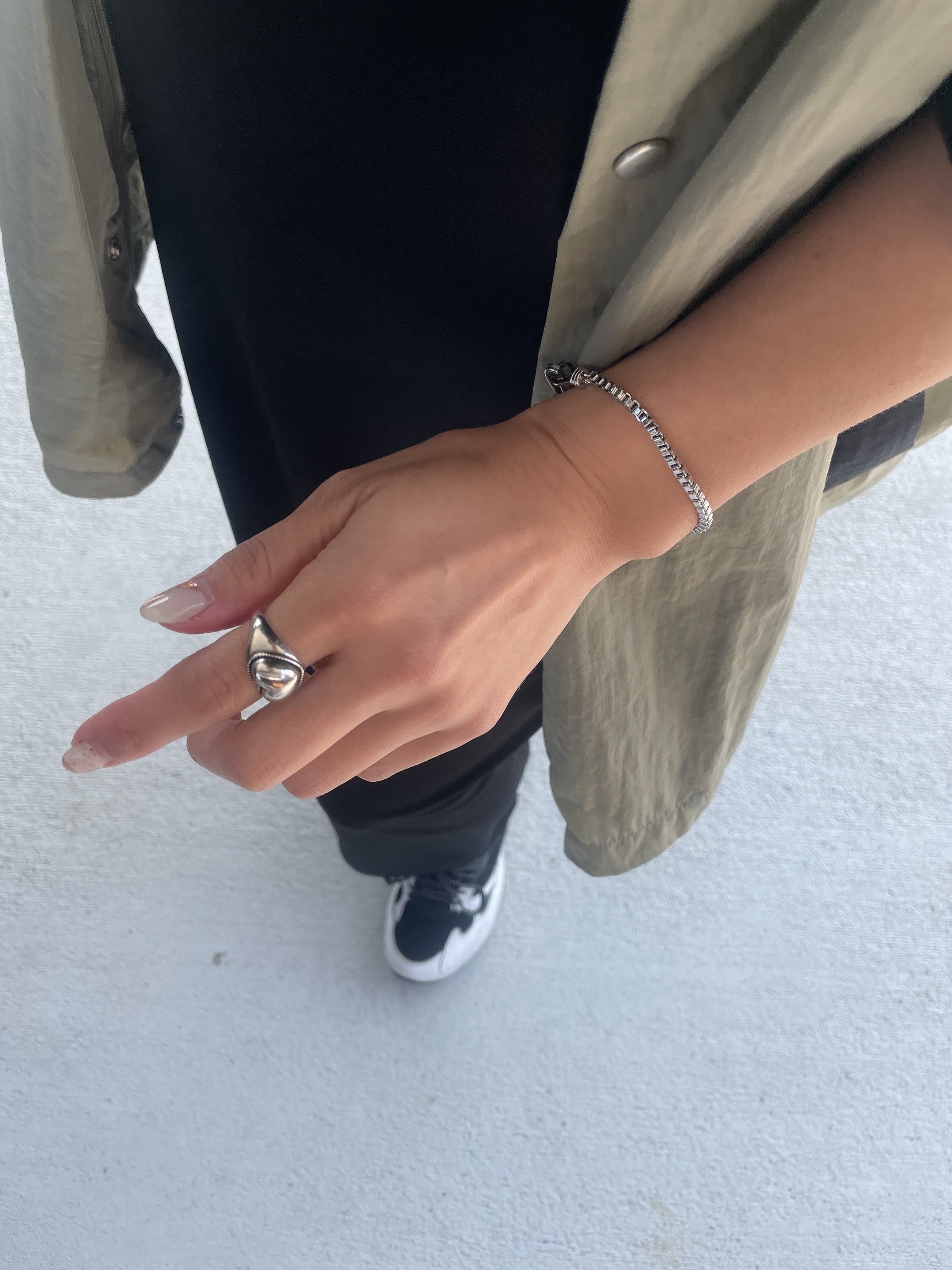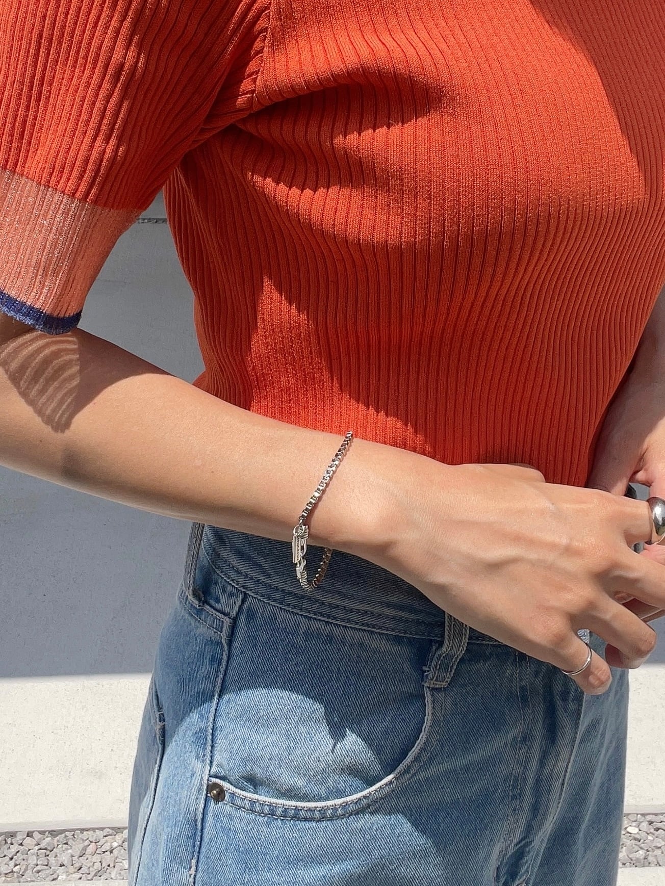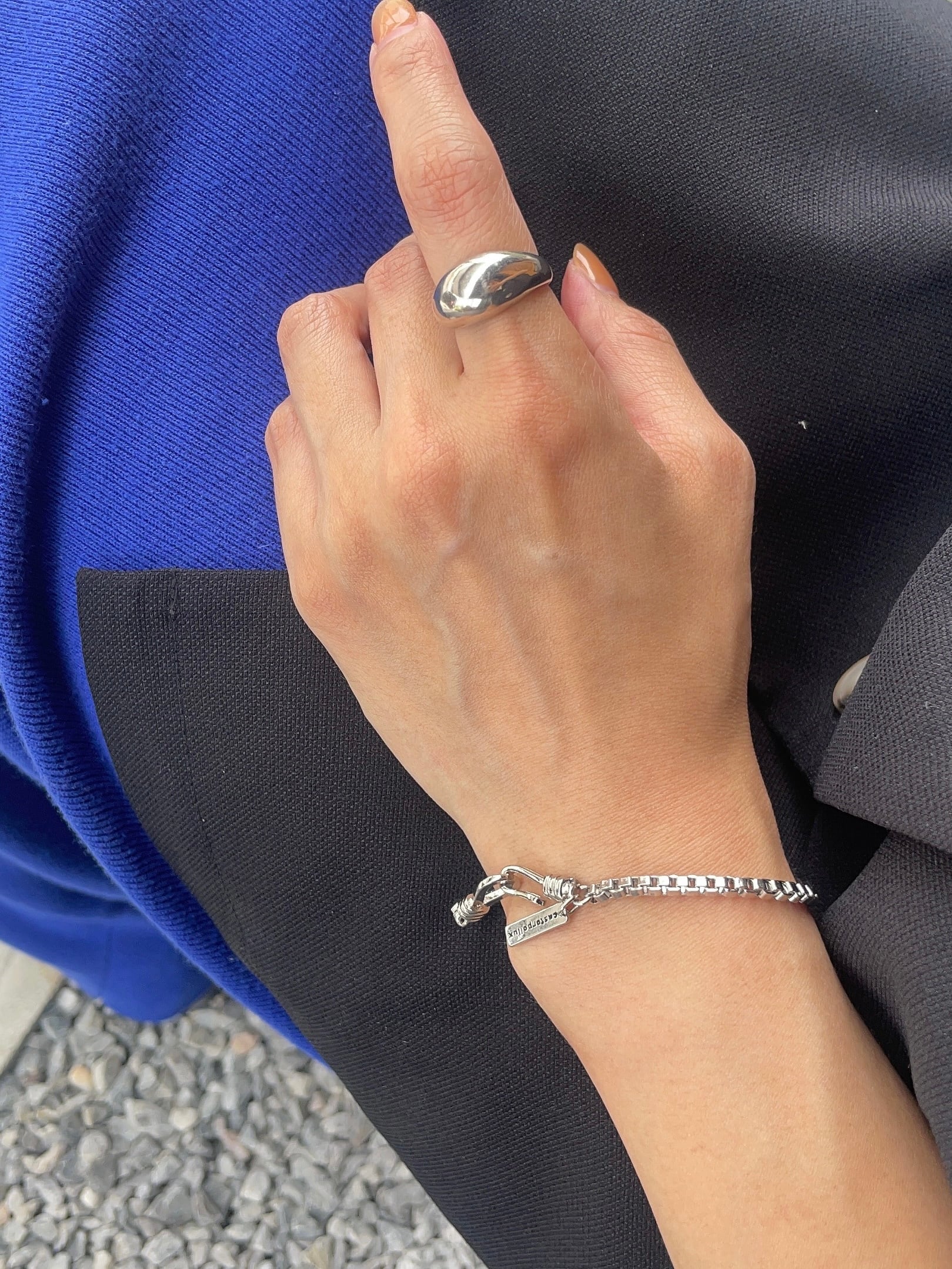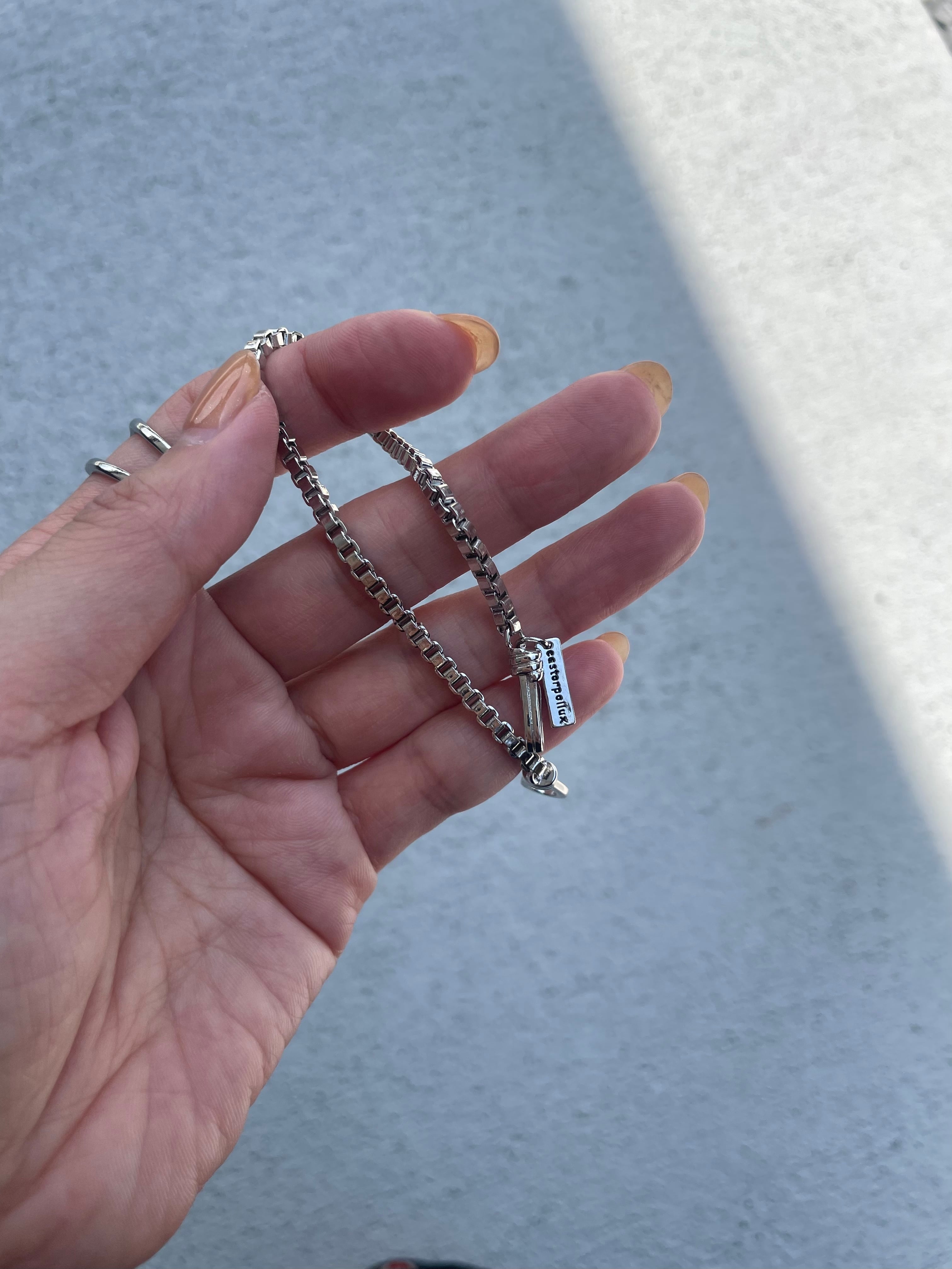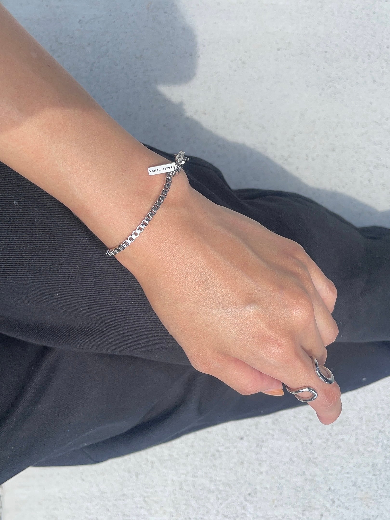 スクエアチェーンブレスレットは、シンプルでありながら存在感のあるアクセサリーです。スクエアチェーンのデザインがおしゃれで、どんなコーディネートにも合わせやすい一品。