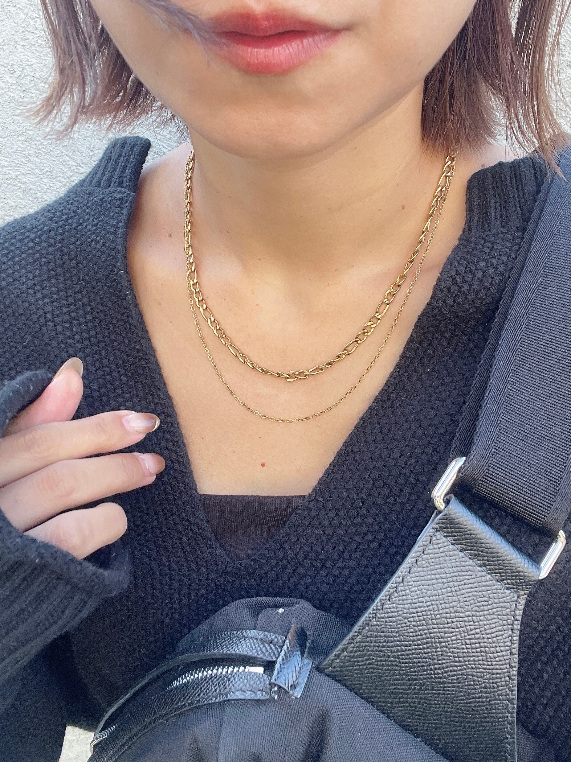 洗練された印象を与えるlayer chain necklace。