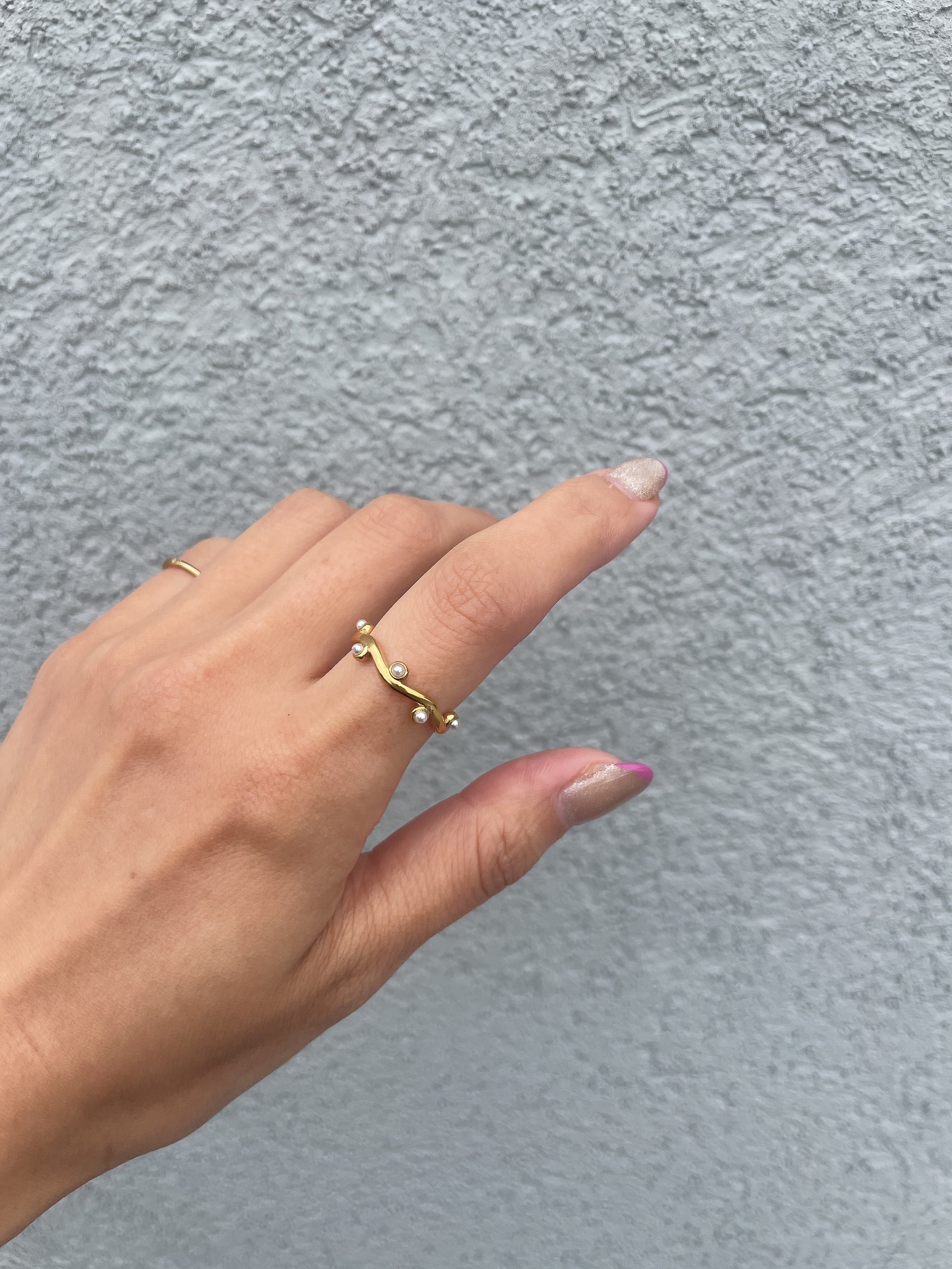 ドットパールリングは、シンプルながらも個性的なデザインが魅力的なアクセサリーです。小さなドットパールがリング全体に散りばめられており、華やかさと上品さを両立した一品です。シンプルなコーディネートにも映える存在感があり、さりげないオシャレを演出してくれます。