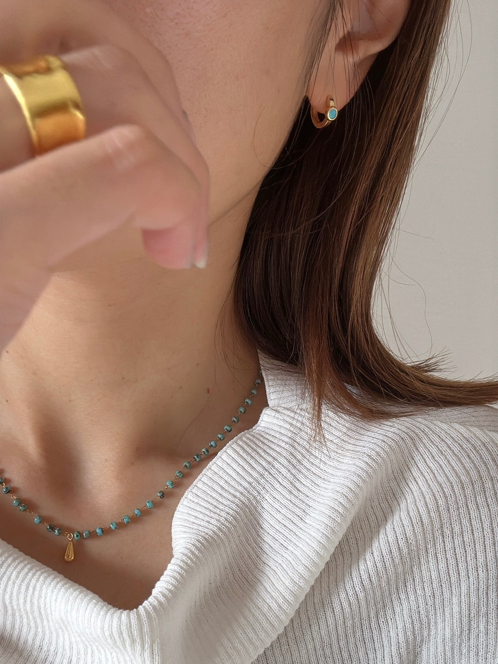 ターコイズの鮮やかなブルーが、耳元にさりげないアクセントを添えます。