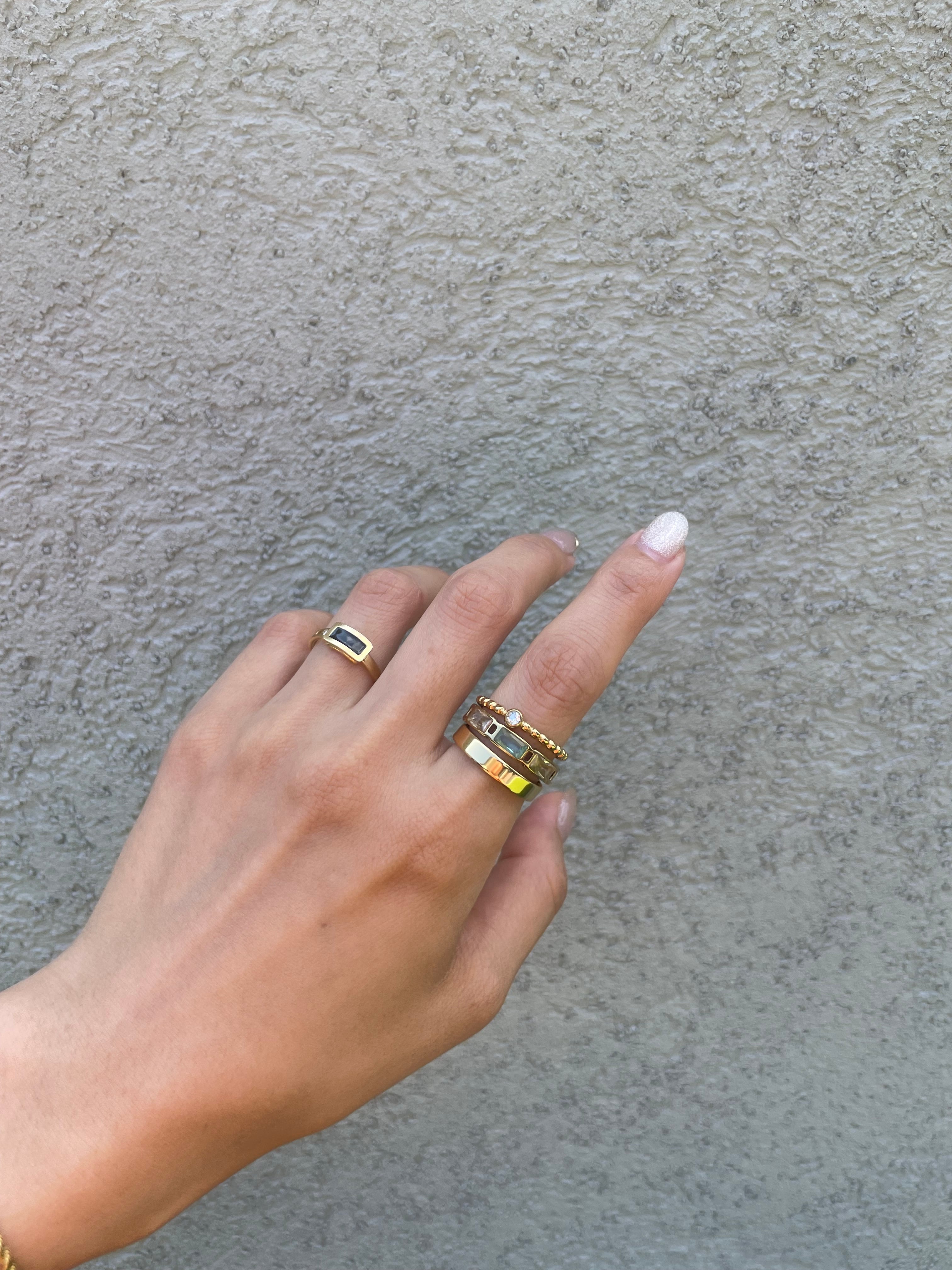 指に自然と馴染むシンプルなプレートリングに、煌めくストーンがひと際目を引きます。
