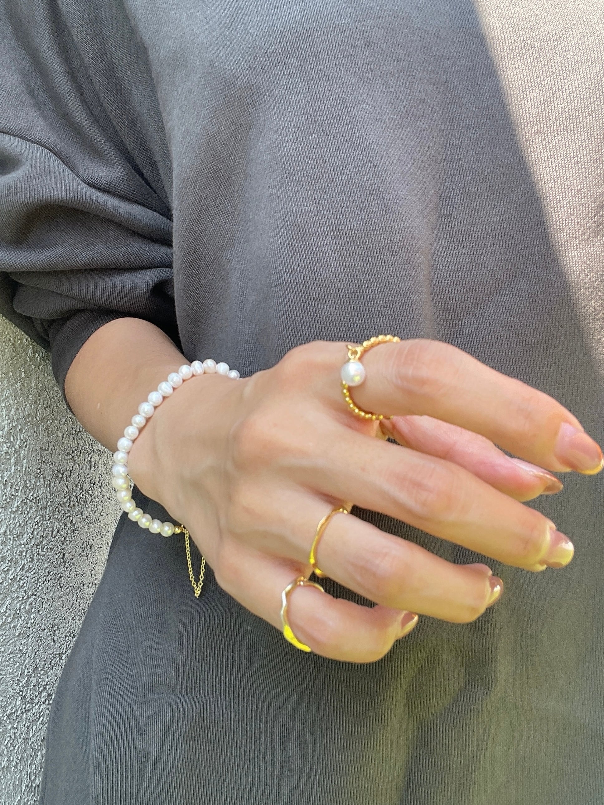 このブレスレットは、シンプルなデザインにパールがあしらわれており、手元に上品さを加えます。