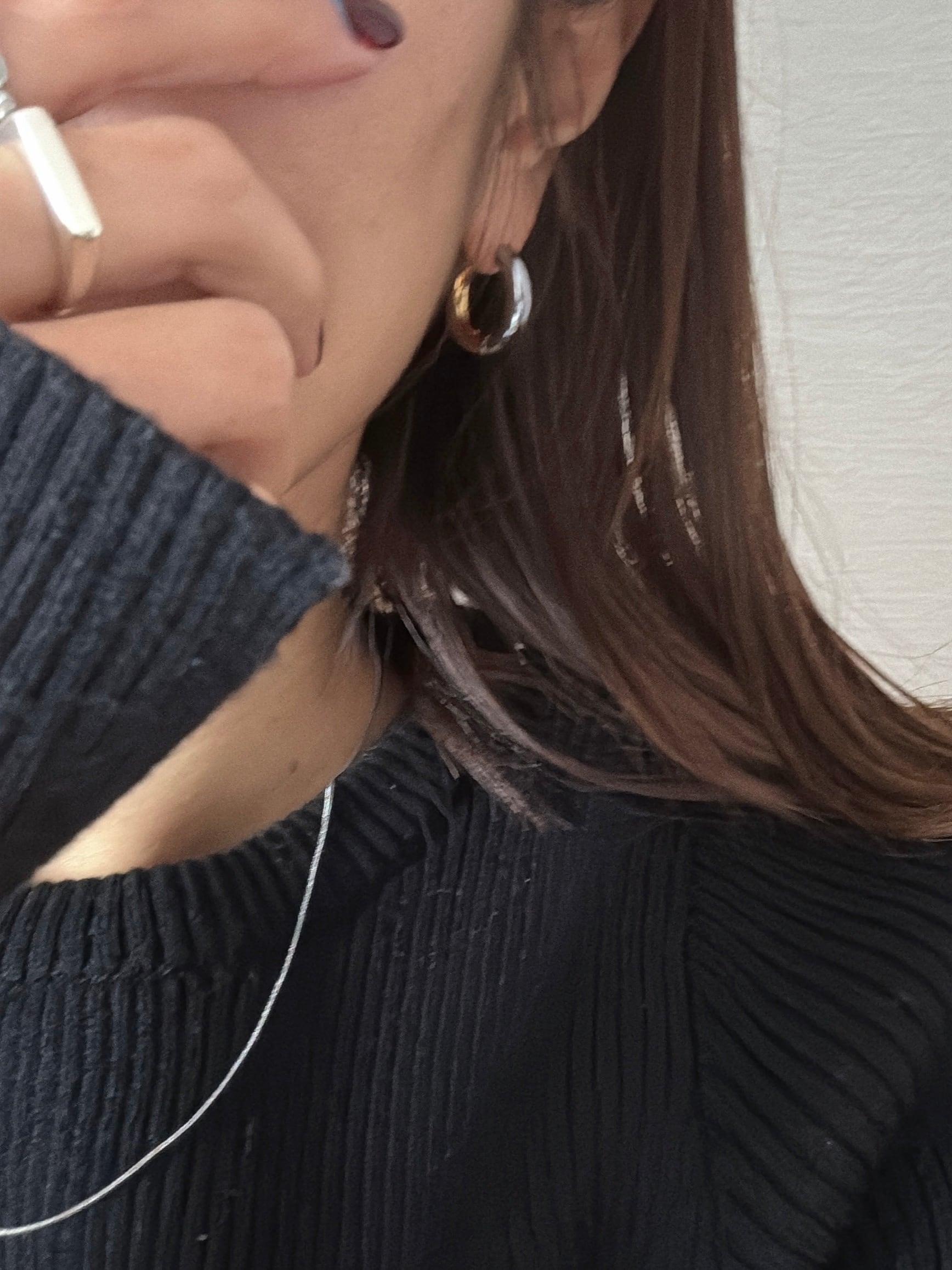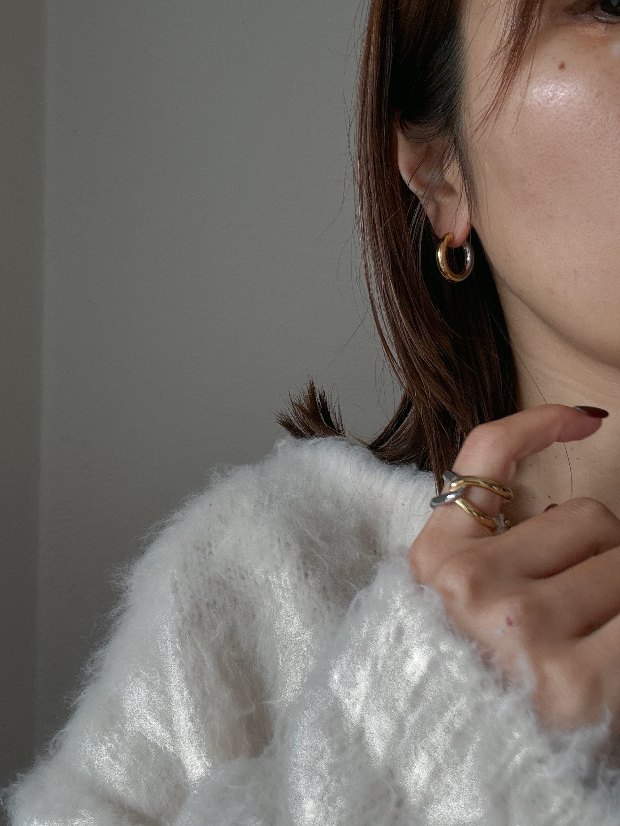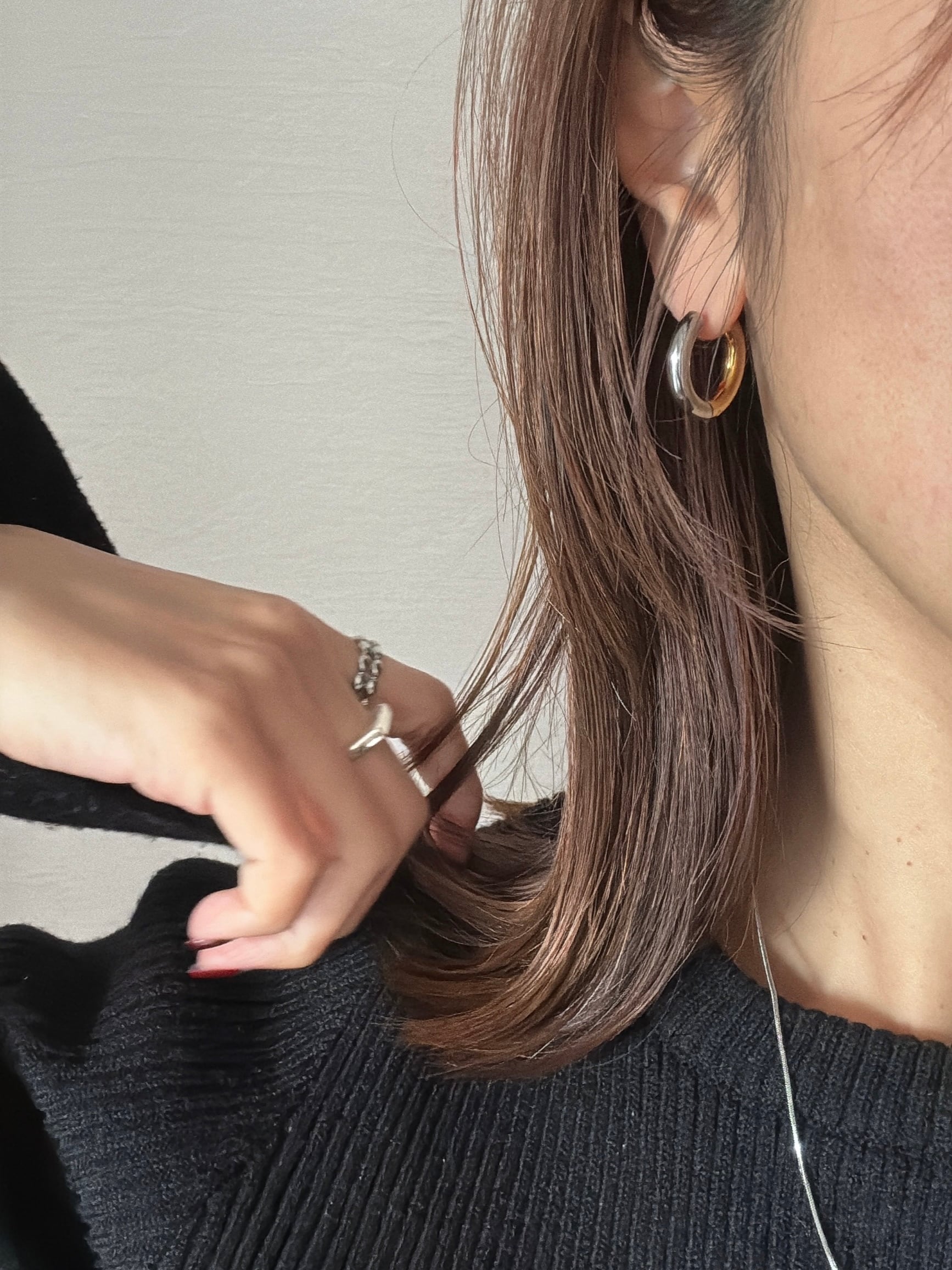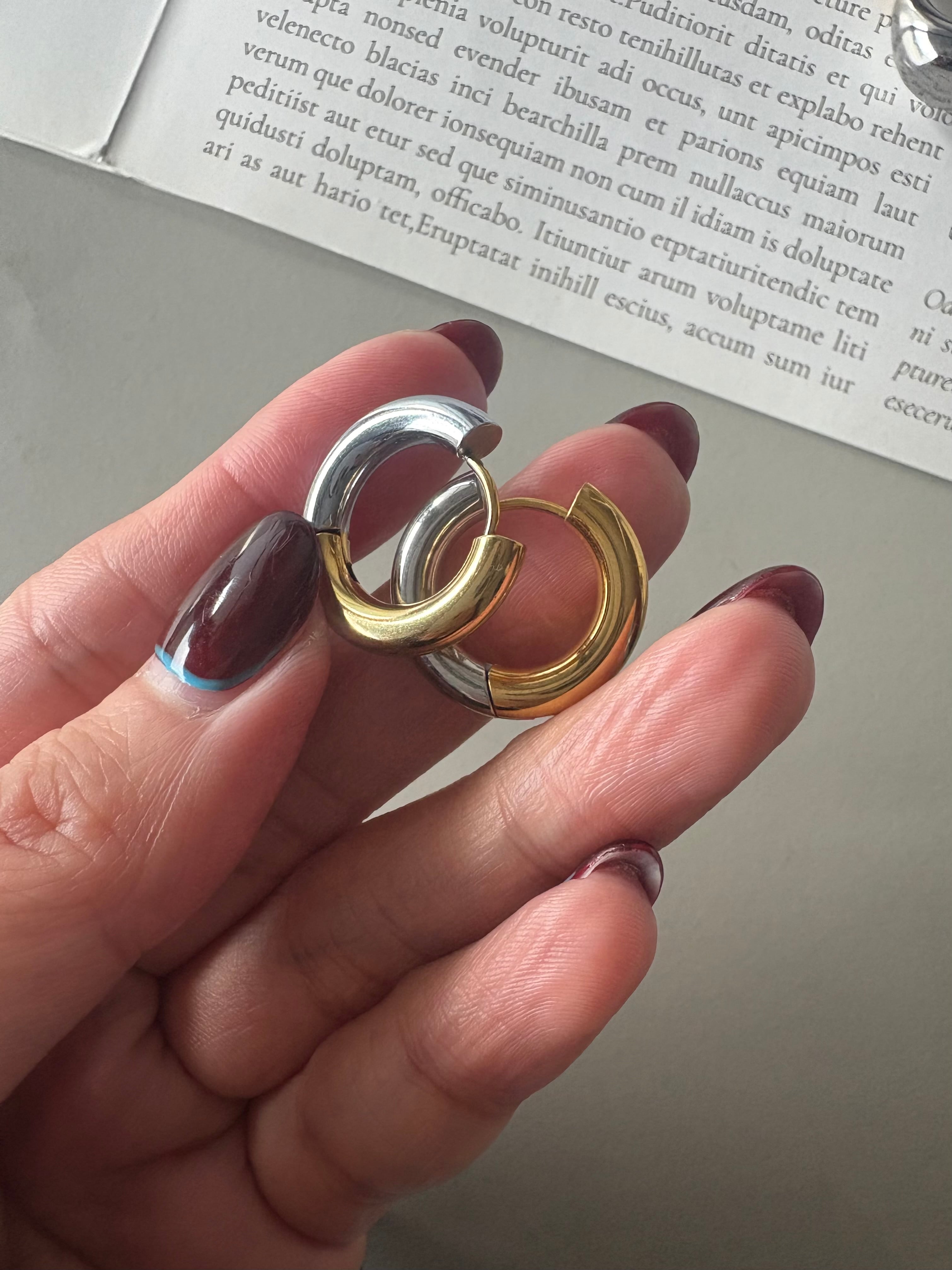 バイカラーの魅力が華やかさを演出する、シンプルなフープピアス。