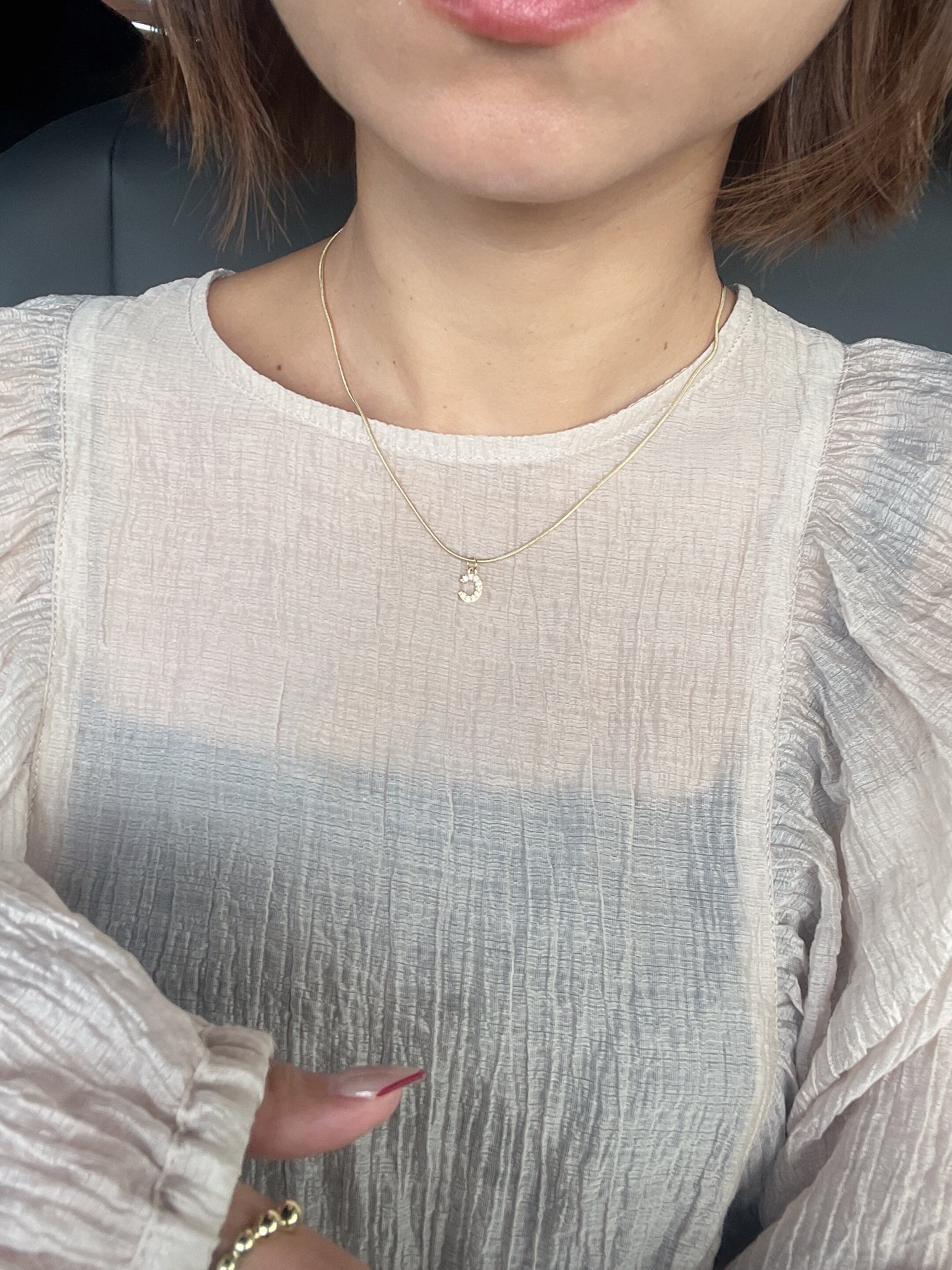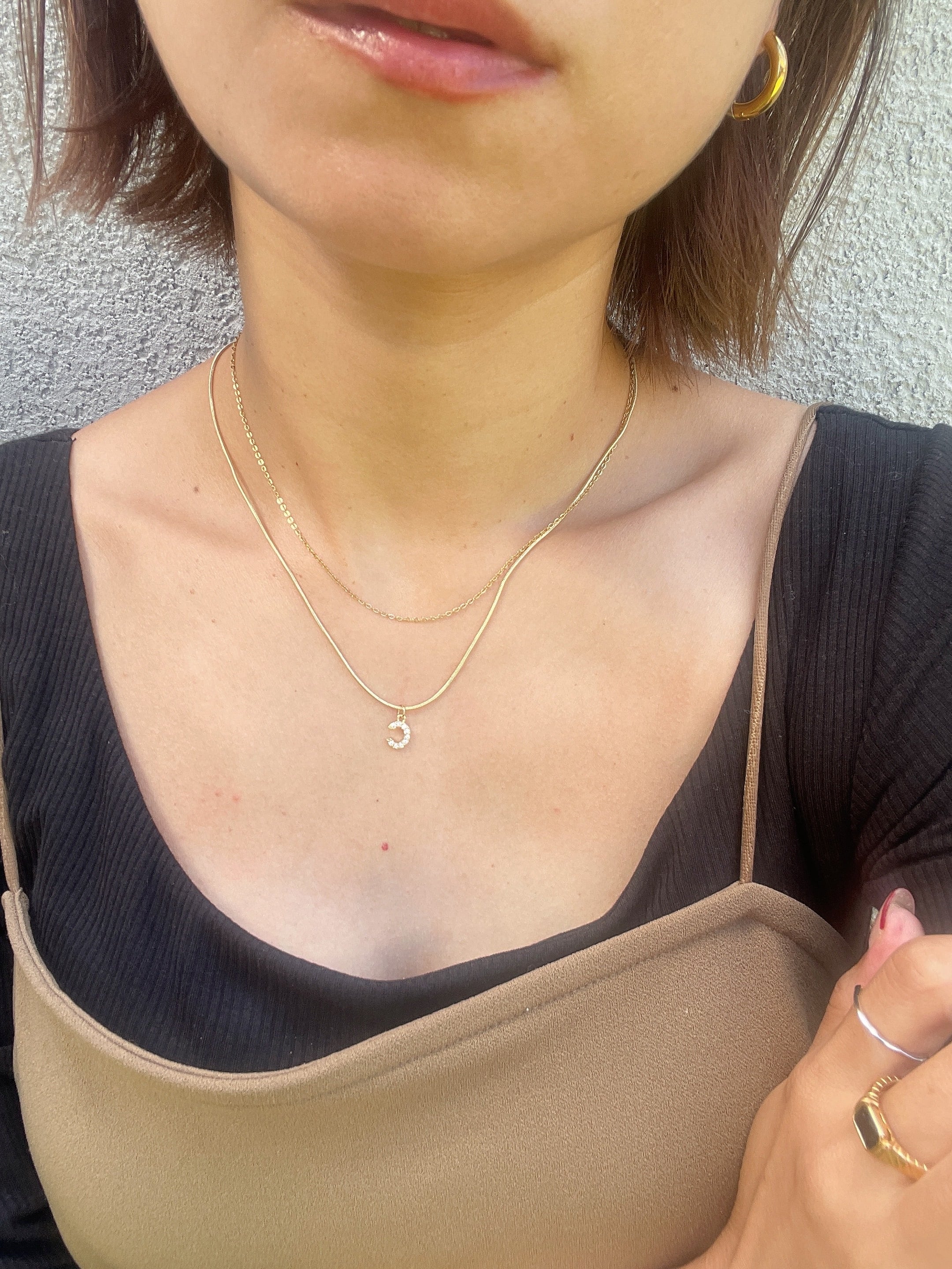 スネークチェーンが採用され、すっきりとした印象を与えます。このネックレスは、シンプルなデザインながらも、存在感を引き立てるcチャームがカジュアルからフォーマルまで幅広いスタイルにマッチします。