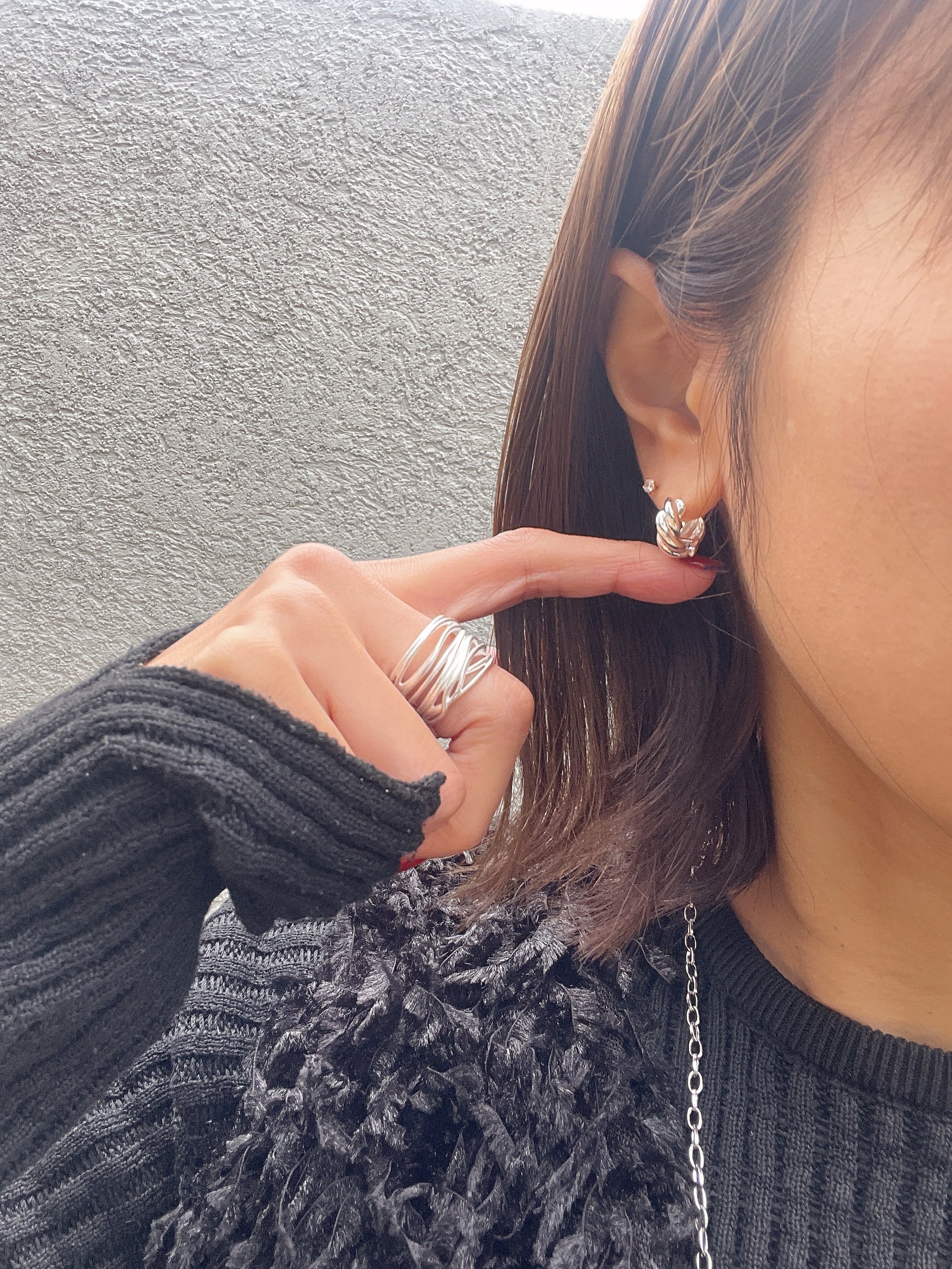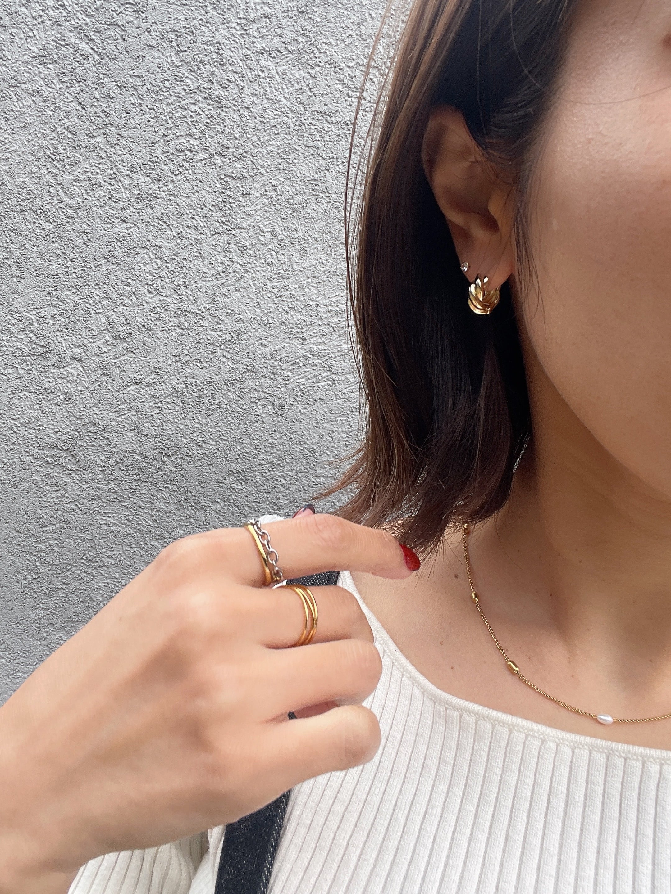 ツイストの形状が美しい光を反射し、動くたびに存在感を放つピアスです。